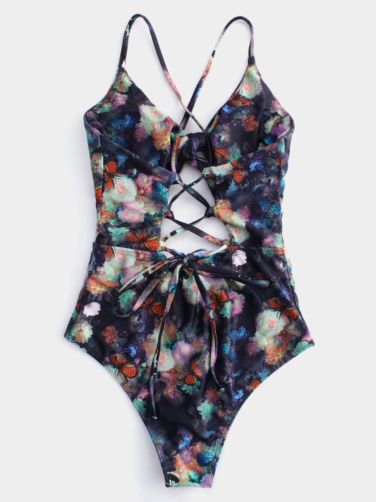 V-Neck Sleeveless Floral Print Cut Out Criss-Cross Tie-Up Bikinis