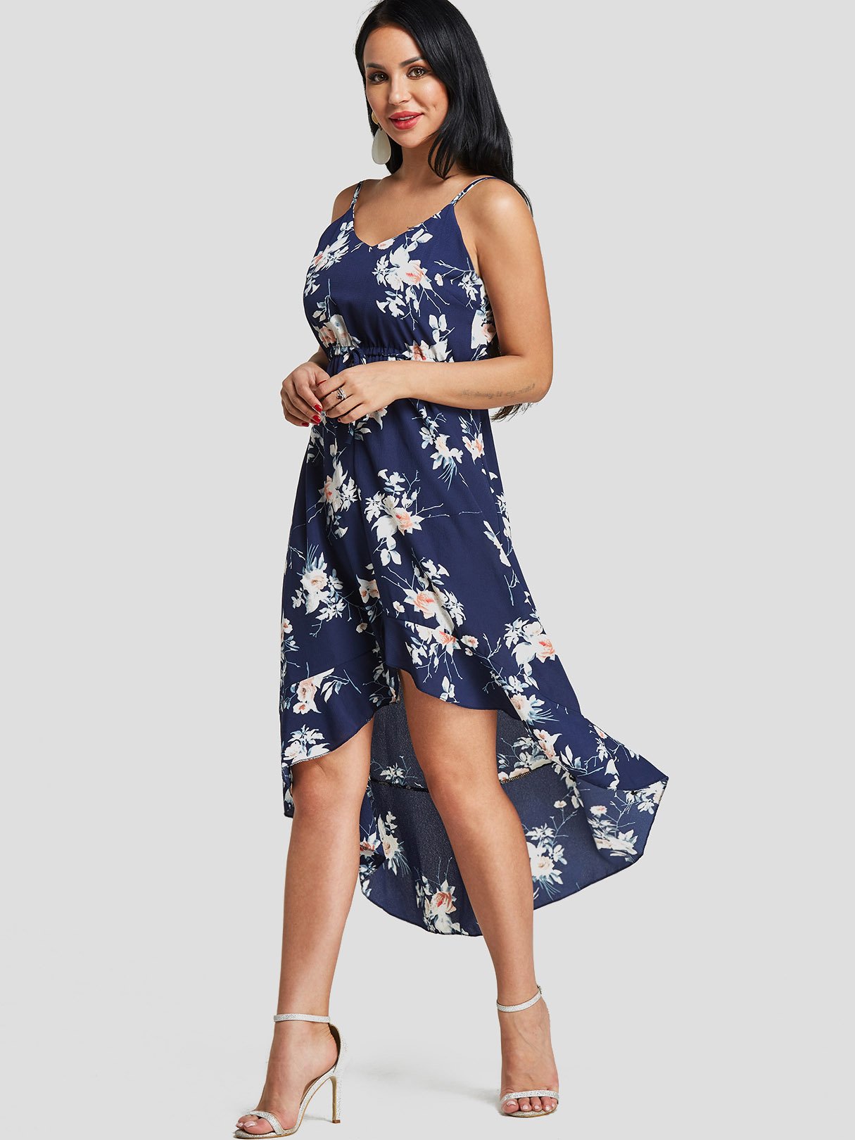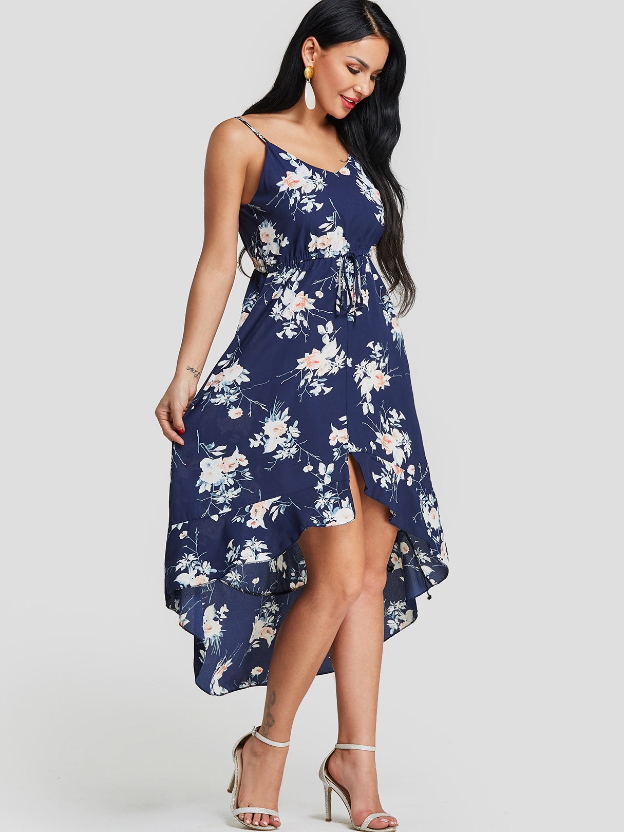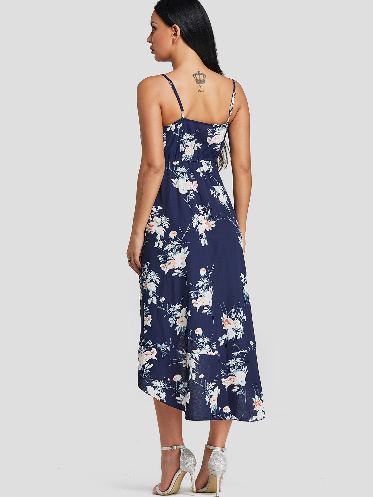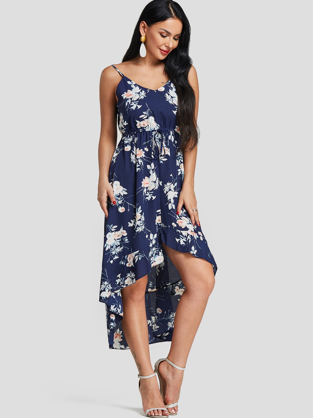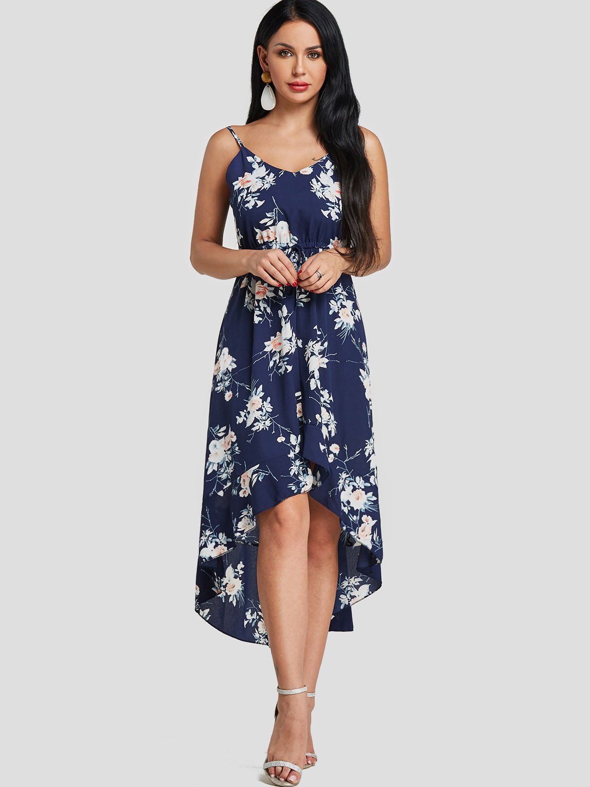 V-Neck Sleeveless Floral Print High-Low Hem Dresses