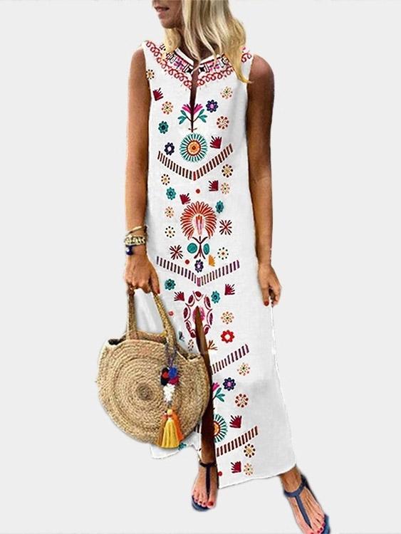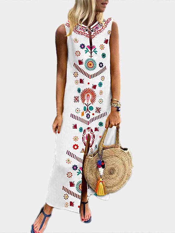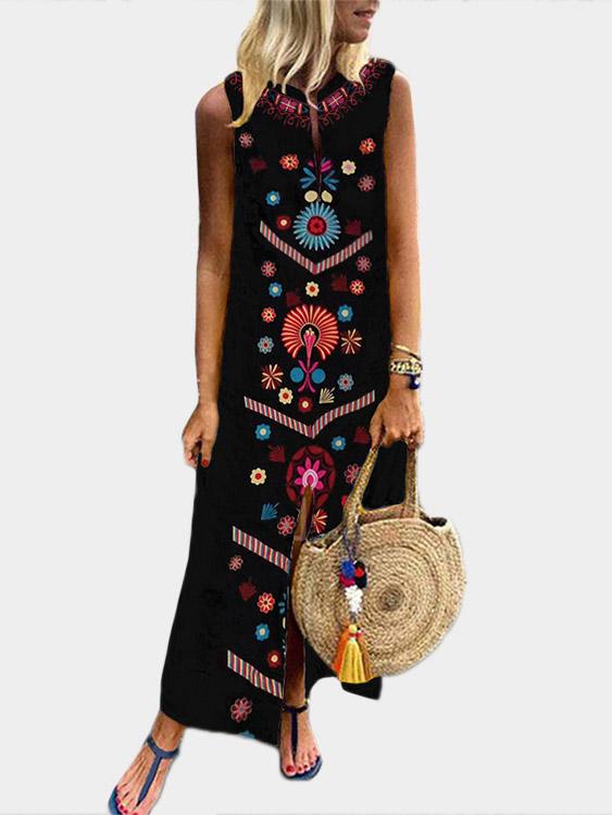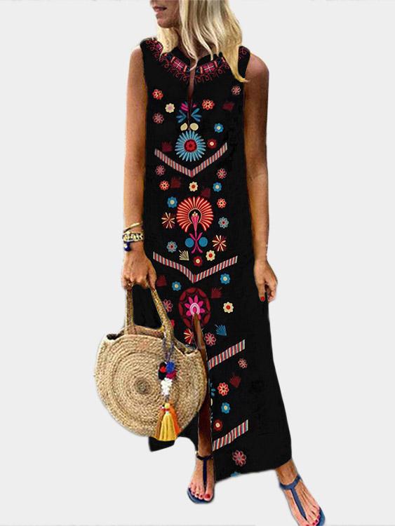 V-Neck Sleeveless Floral Print Slit Hem Dress