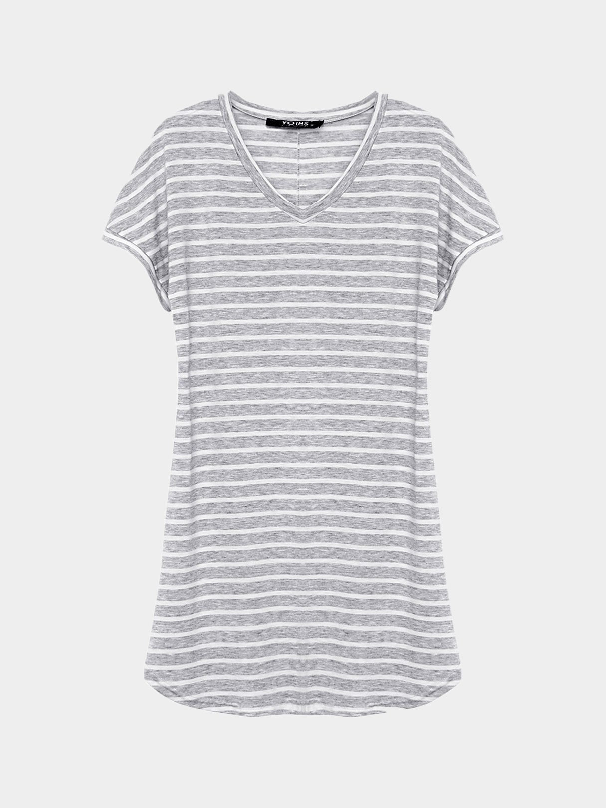 Material:PolyesterNeckline:V-NeckSeason:SummerPattern:StripeStyle:Casual StyleHem Design:Curved HemLength:Mini