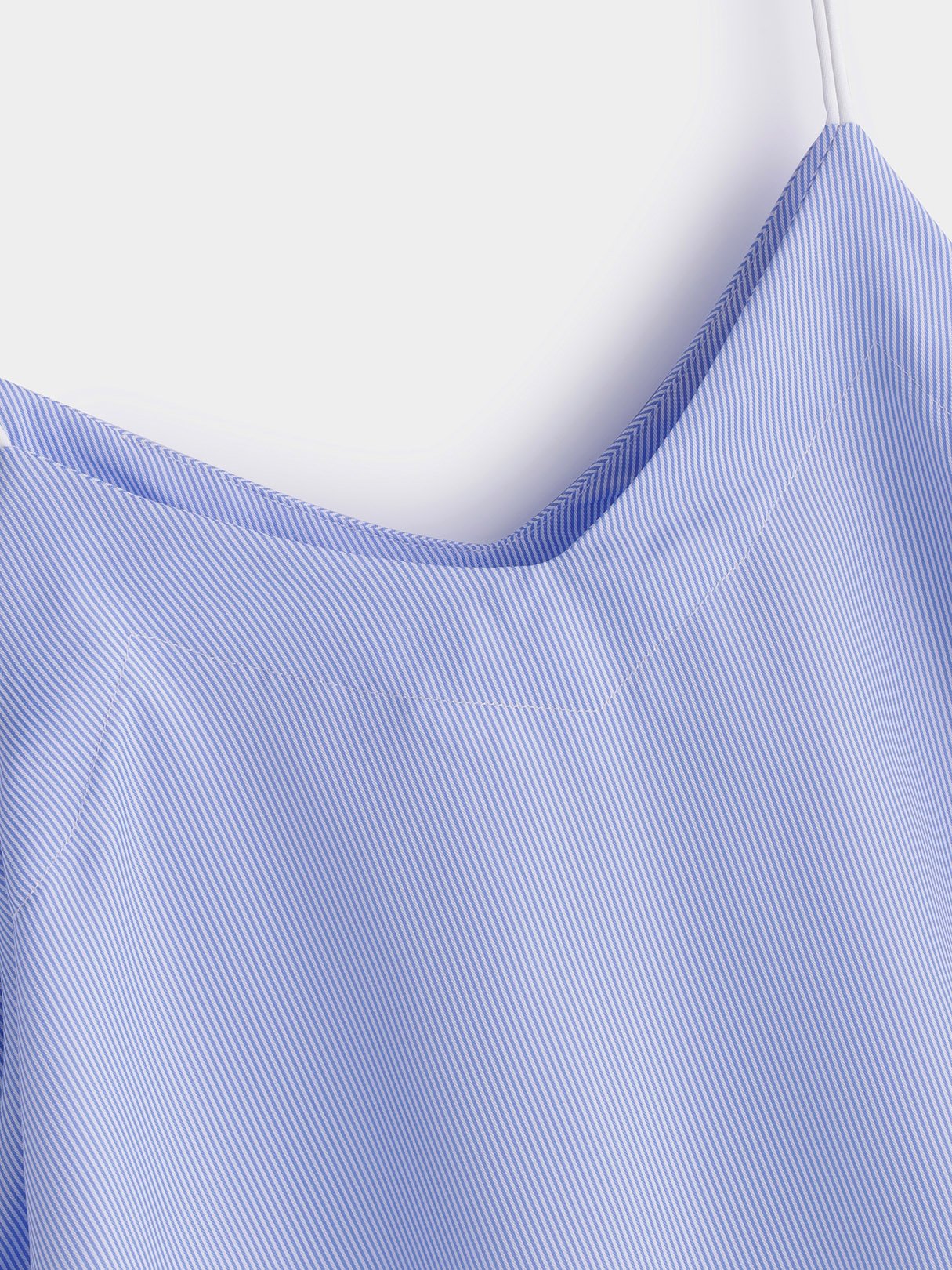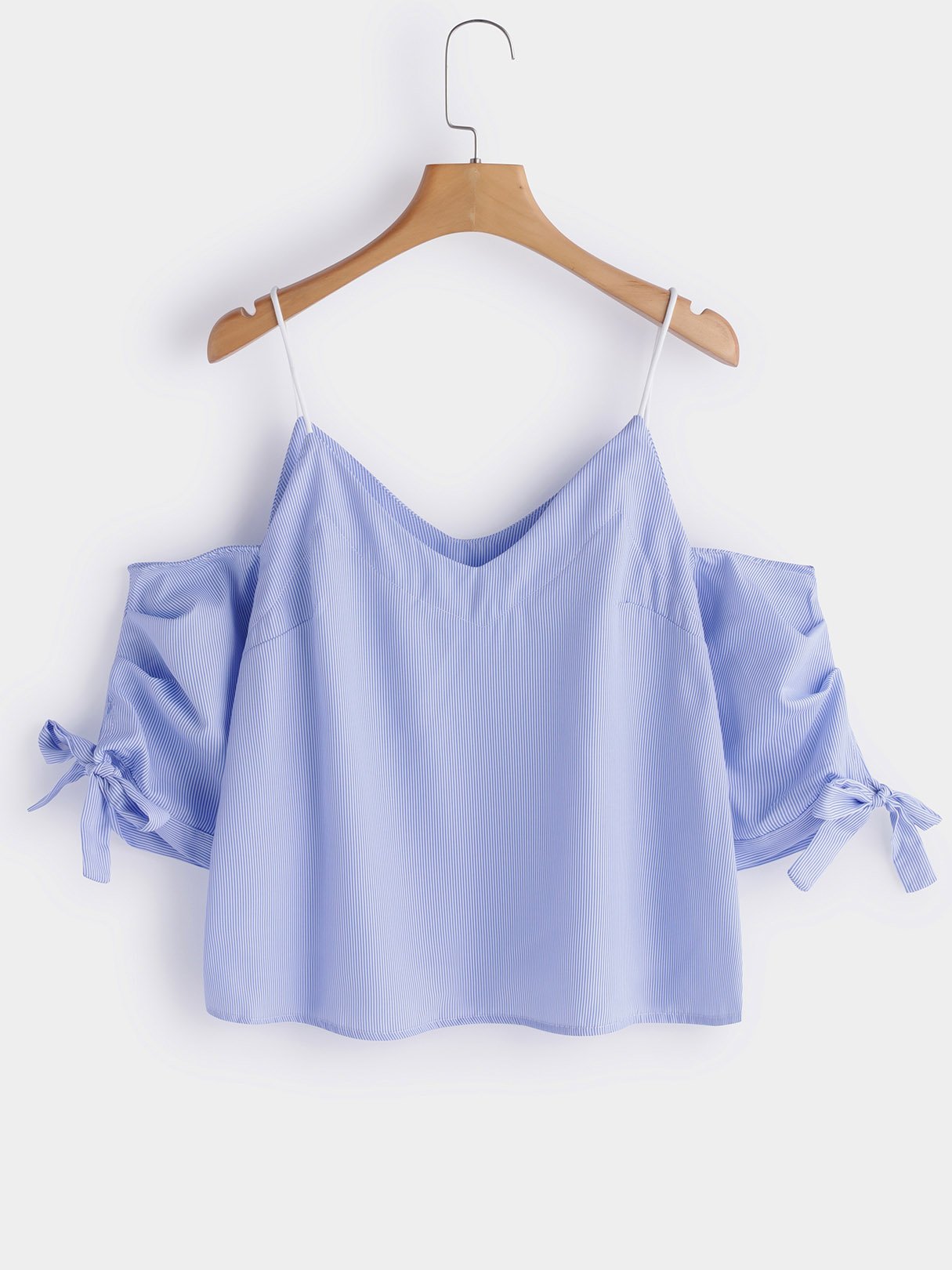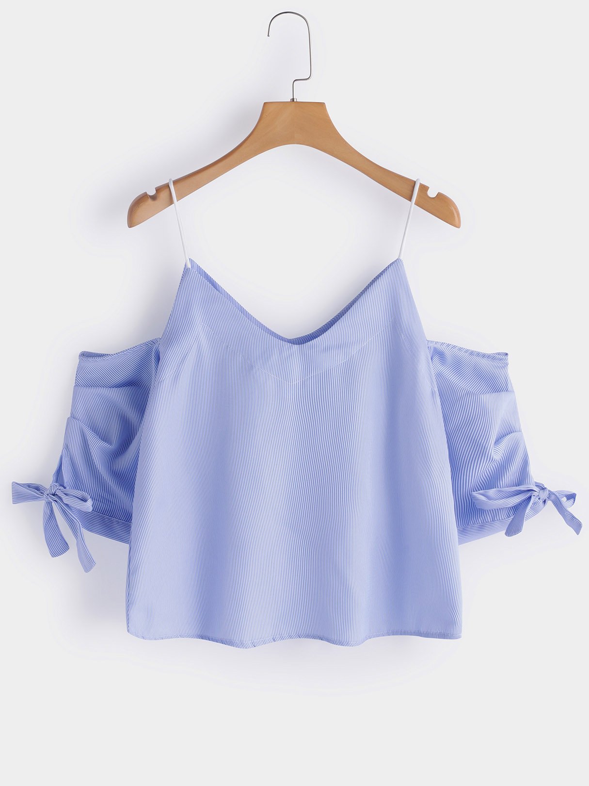 V-Neck Stripe Spaghetti Strap Half Sleeve Blue Blouses