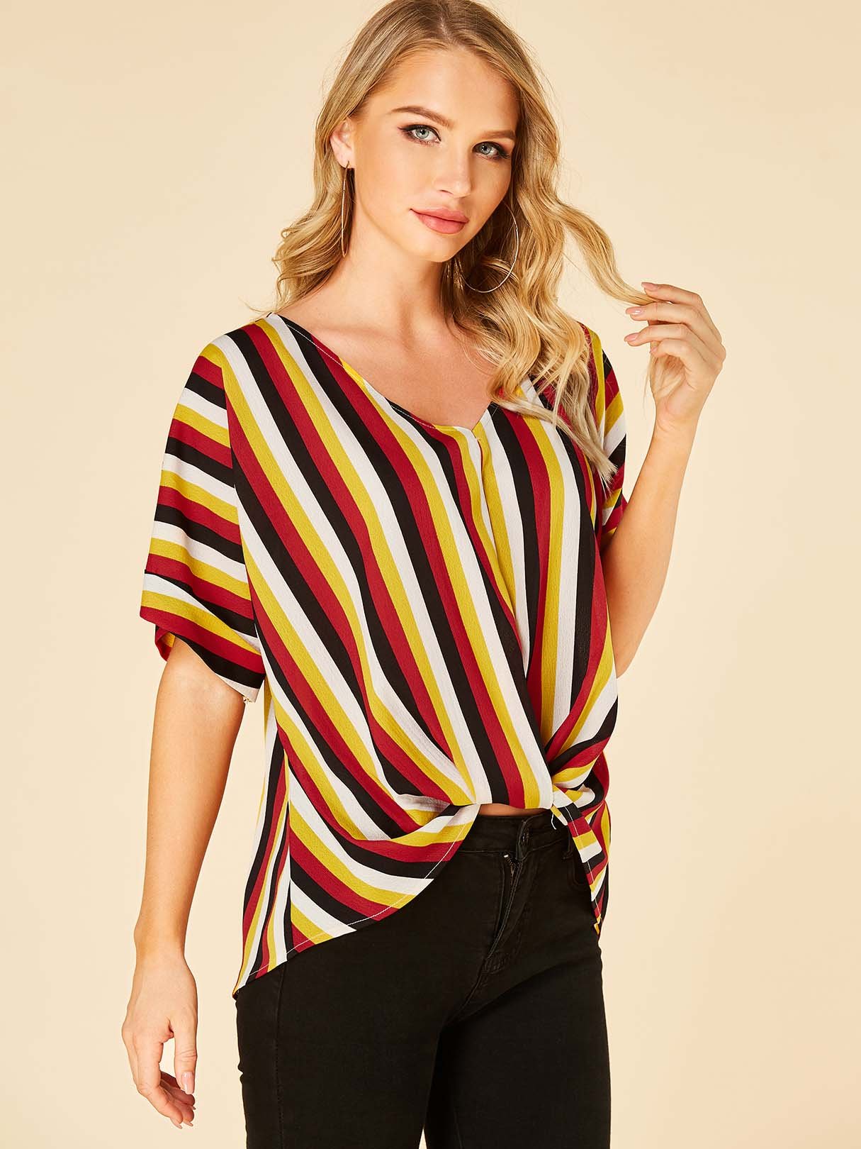 Material:PolyesterNeckline:V-NeckSeason:Spring,SummerSleeves:Half SleevesPattern:StripeStyle:Casual Style,Vacation StyleDetail:TwistType:BlouseFit:Regular Fit