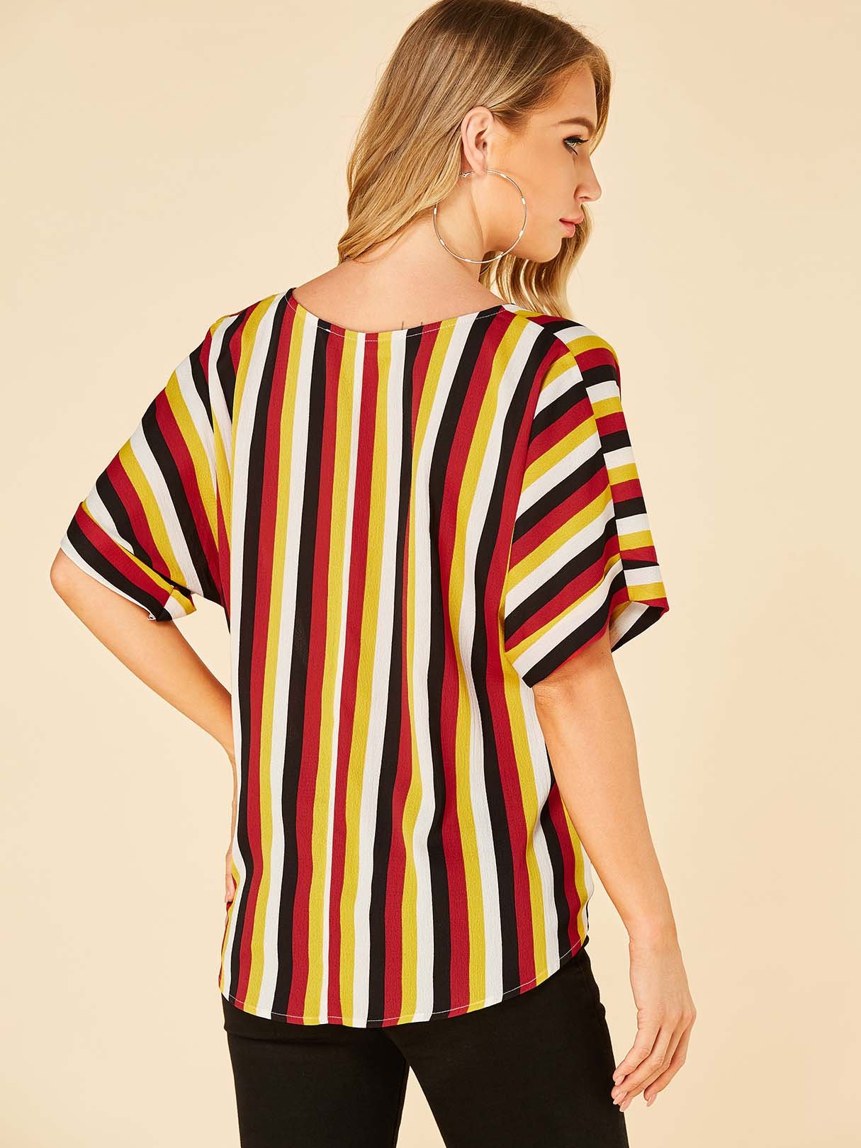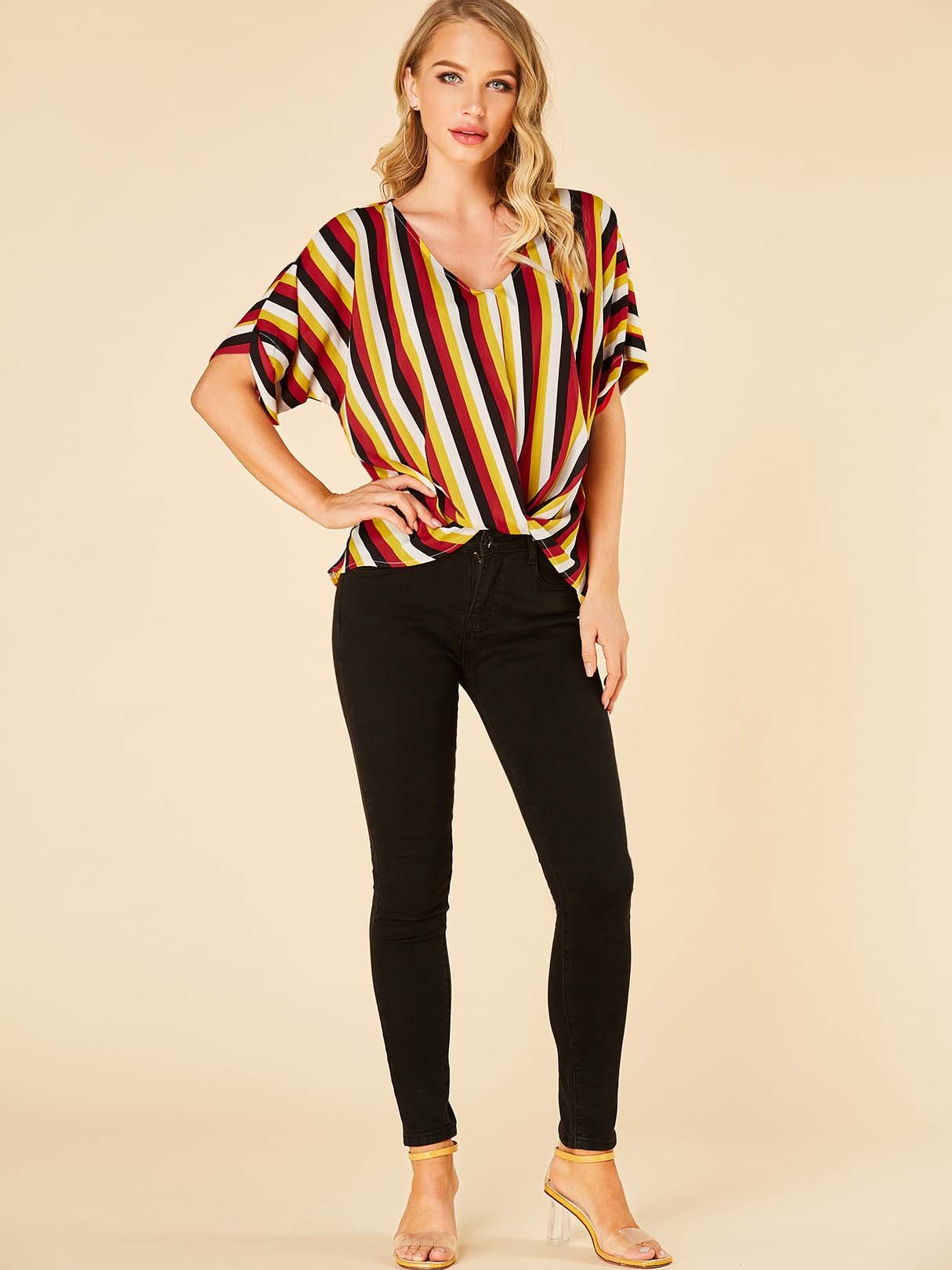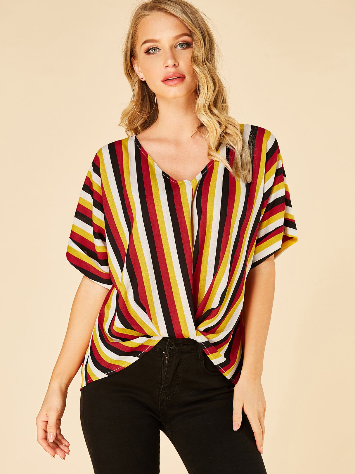 V-Neck Stripe Twist Half Sleeve Blouses - Multi / S is backordered and will ship as soon as it is back in stock.