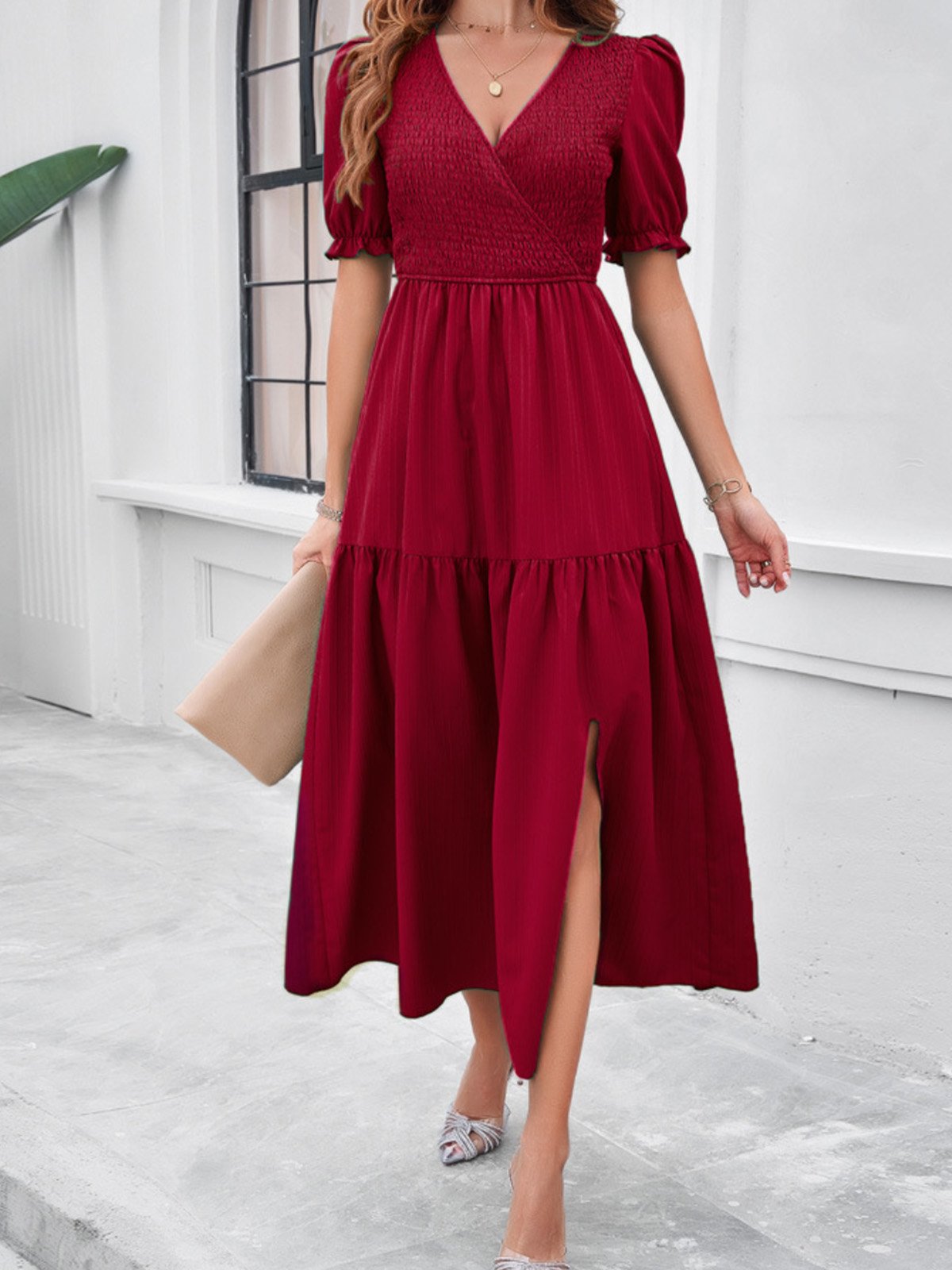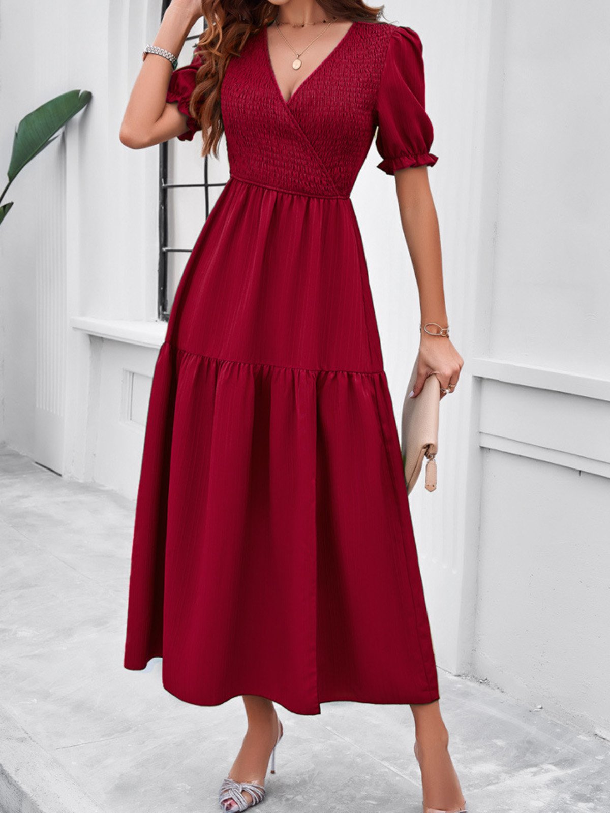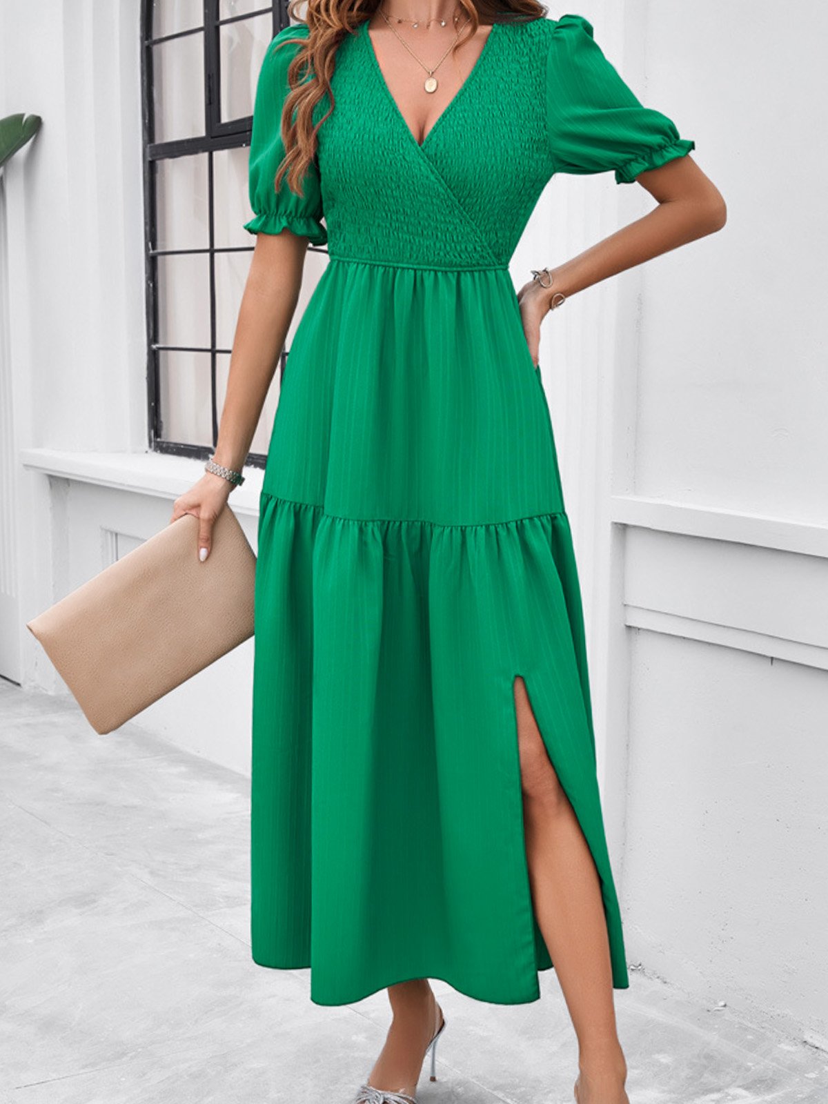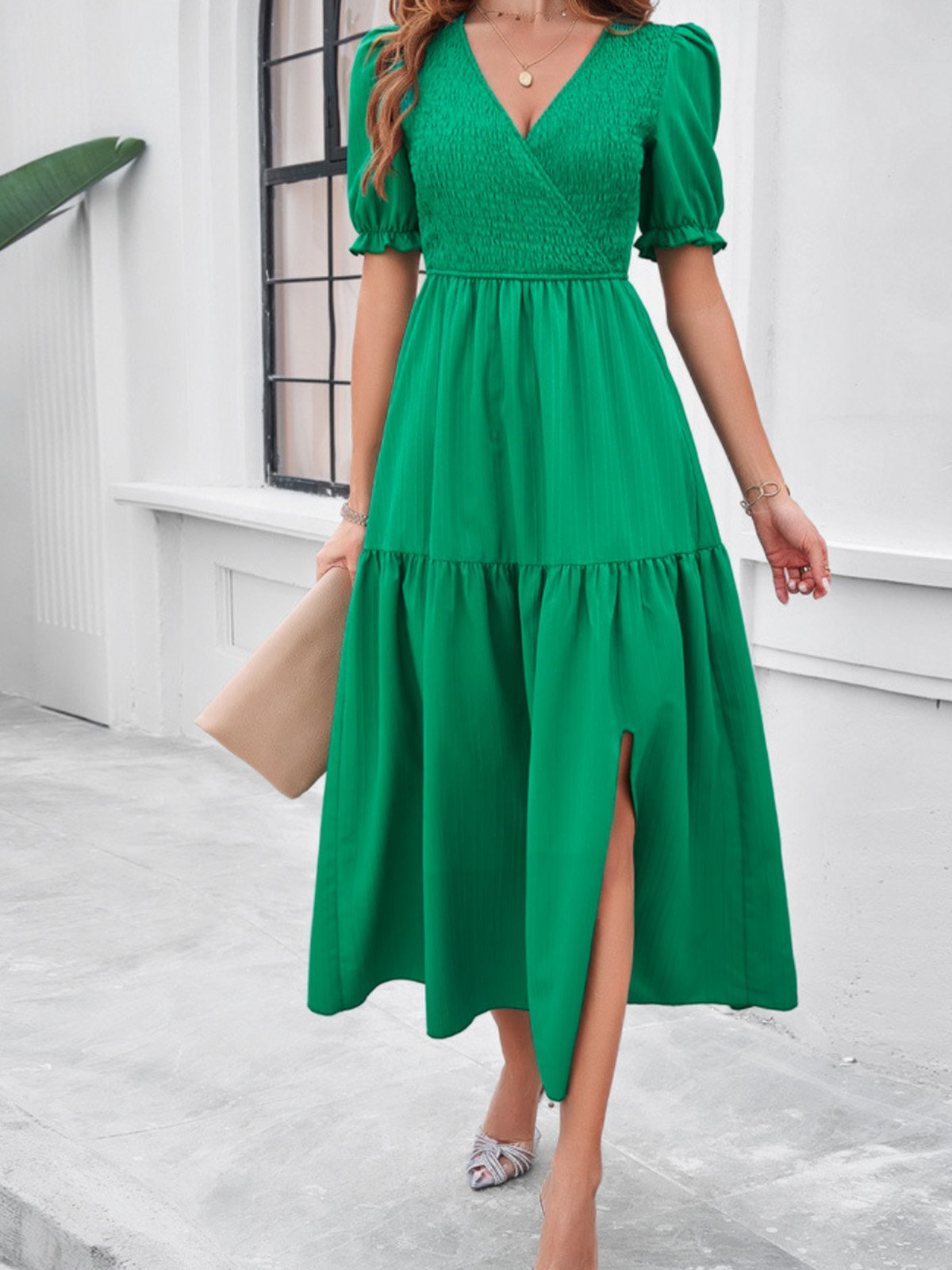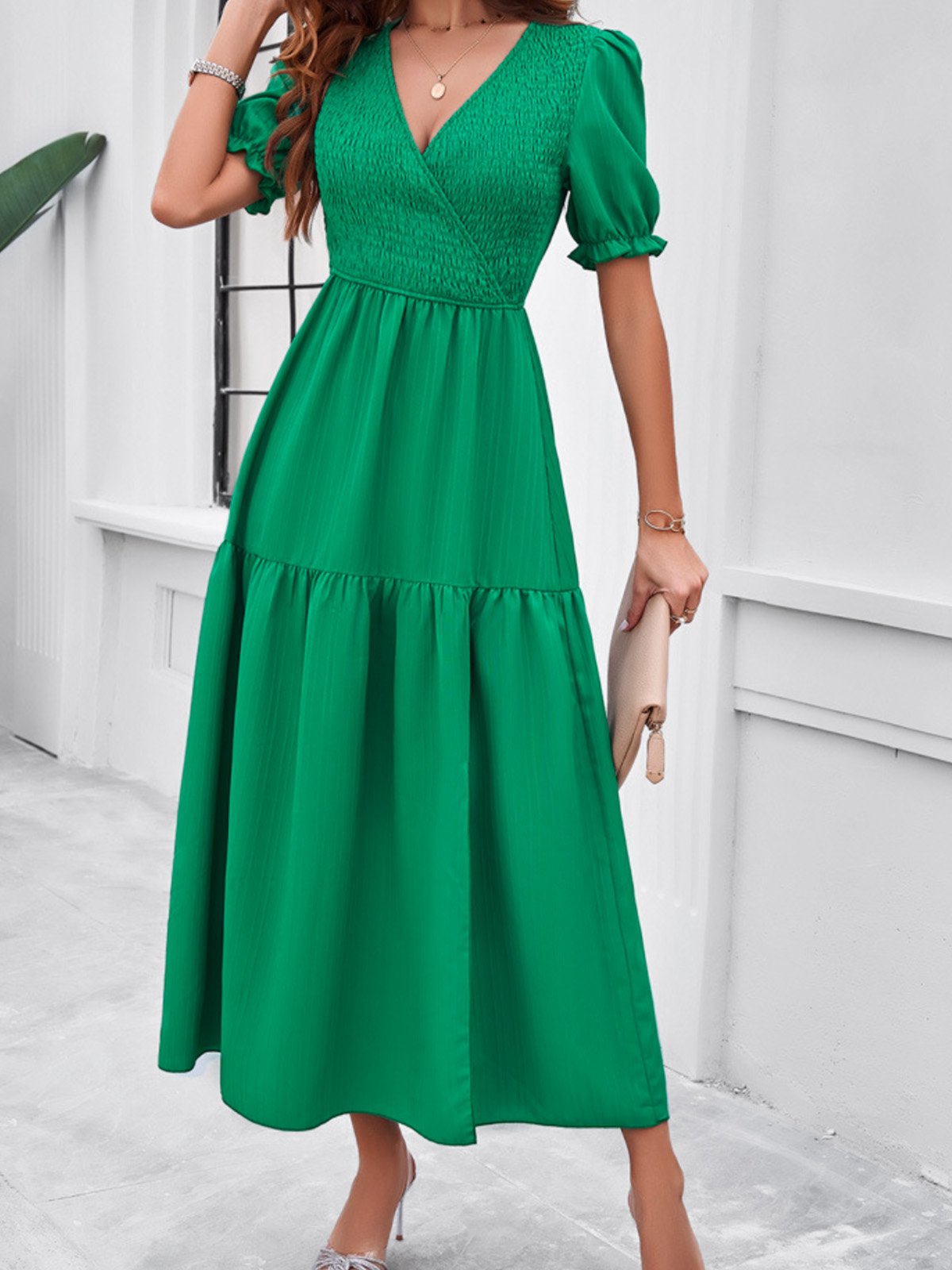 Vacation V Neck Short Sleeve Plain Midi Dress - Green / S is backordered and will ship as soon as it is back in stock.