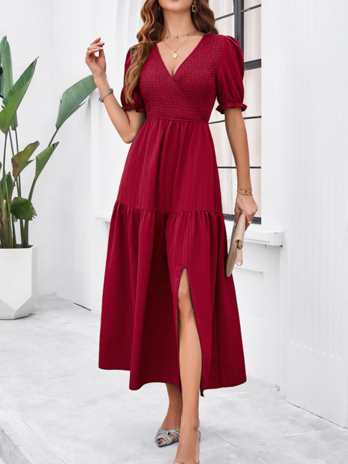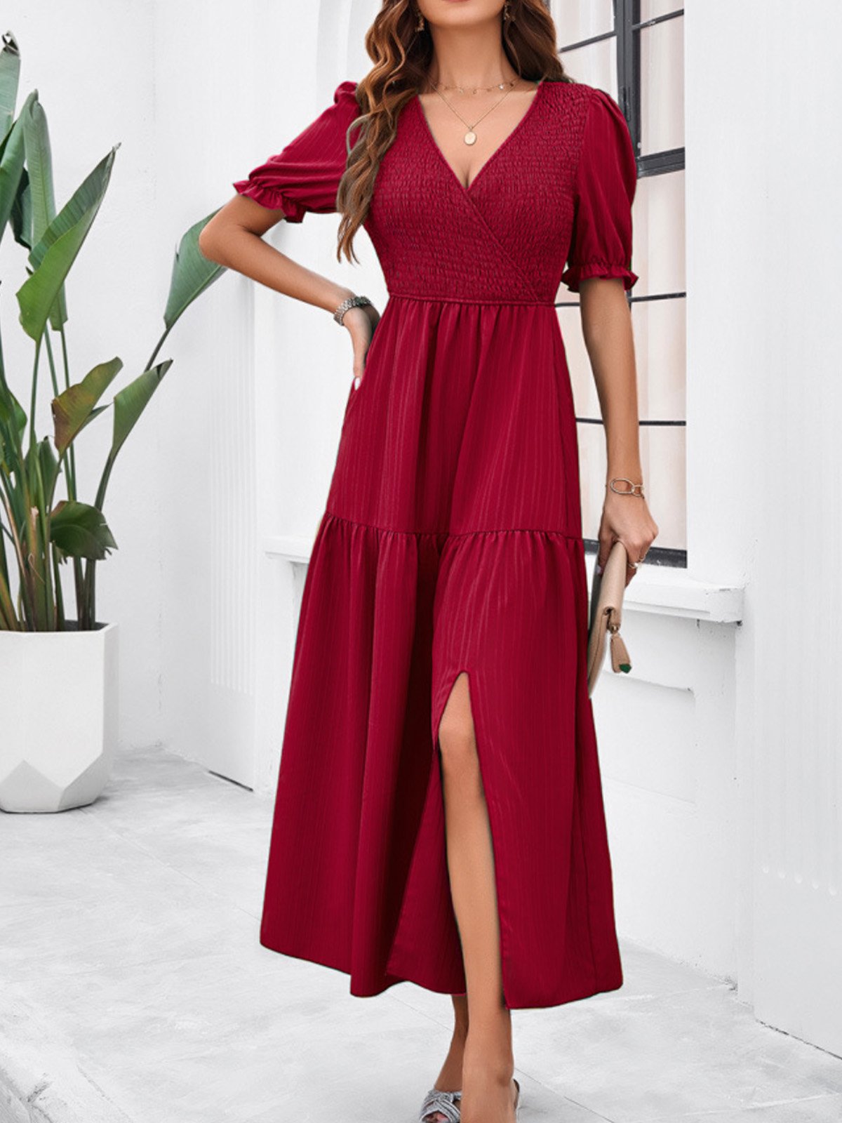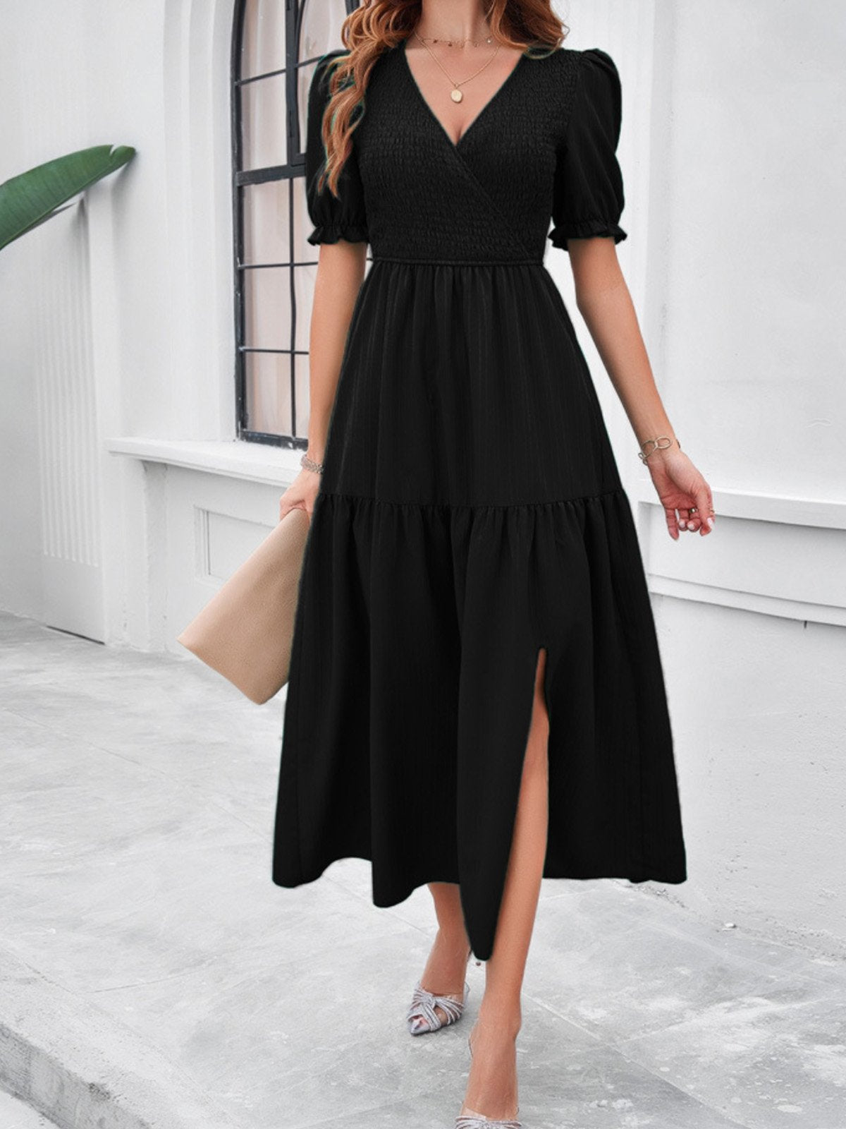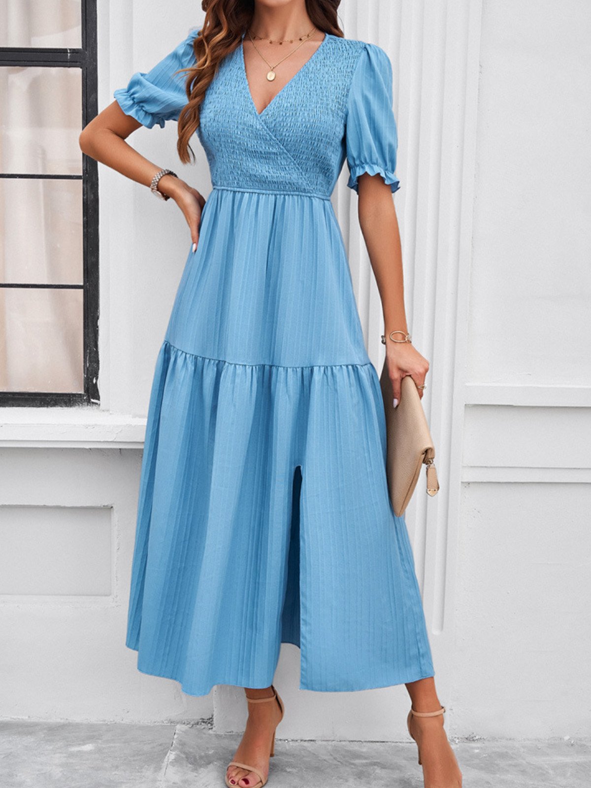 Vacation V Neck Short Sleeve Plain Midi Dress - Green / S is backordered and will ship as soon as it is back in stock.