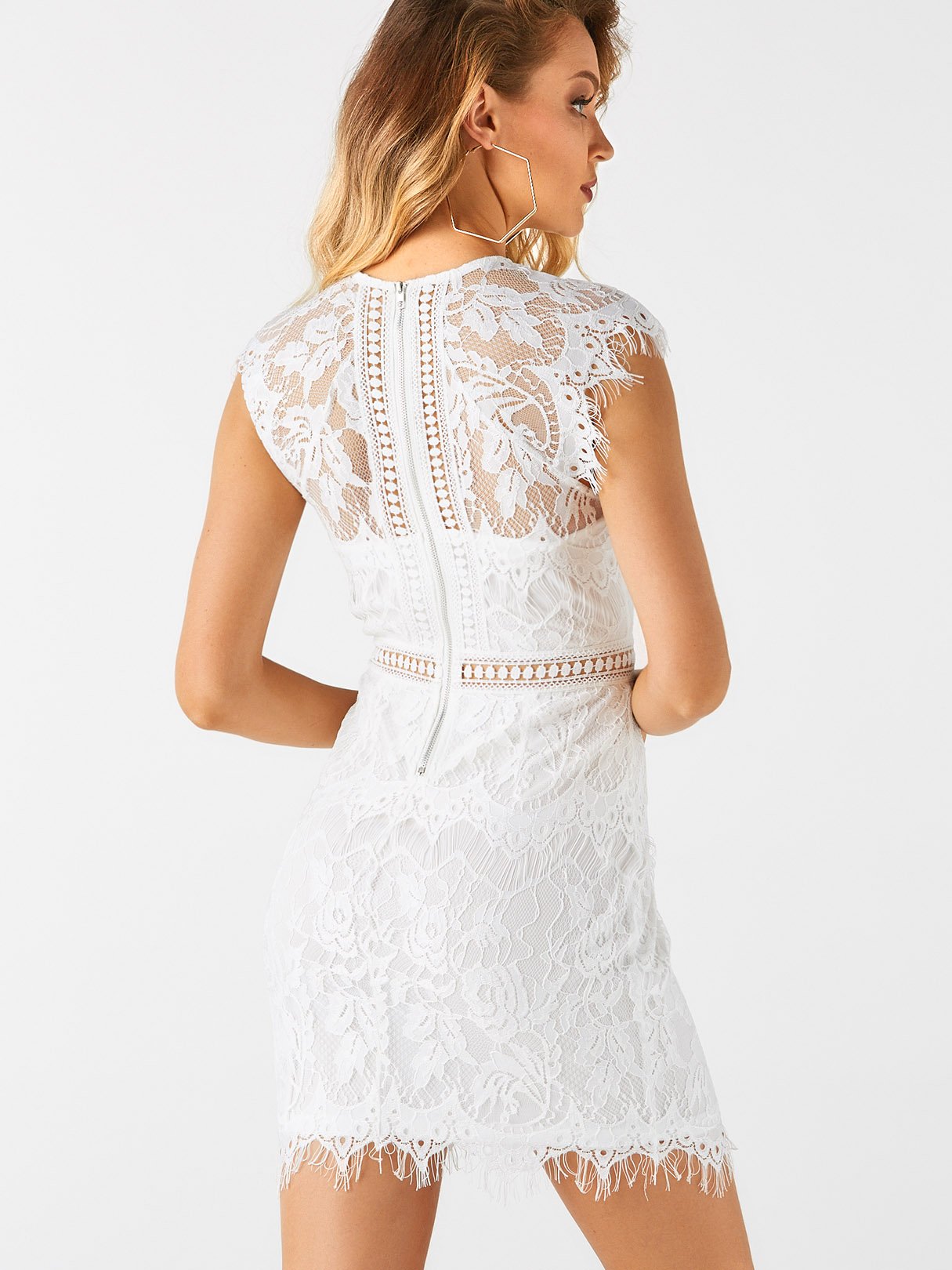 White Bateau Short Sleeve Lace Zip Back High-Waisted Sexy Dress