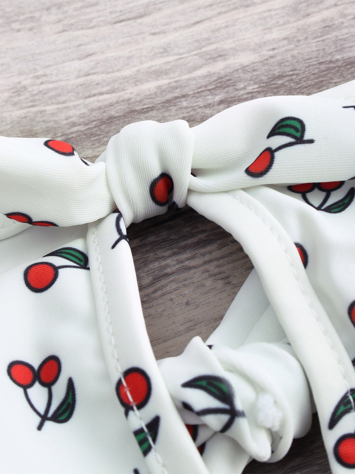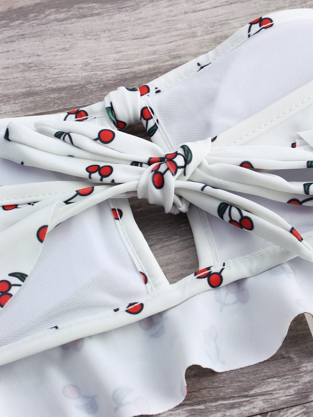 White Bateau Sleeveless Floral Print Backless Hollow Self-Tie Two Piece Bikinis