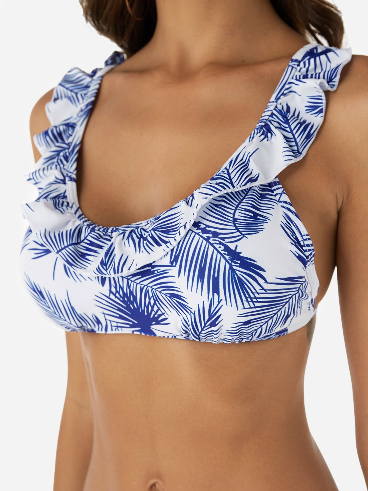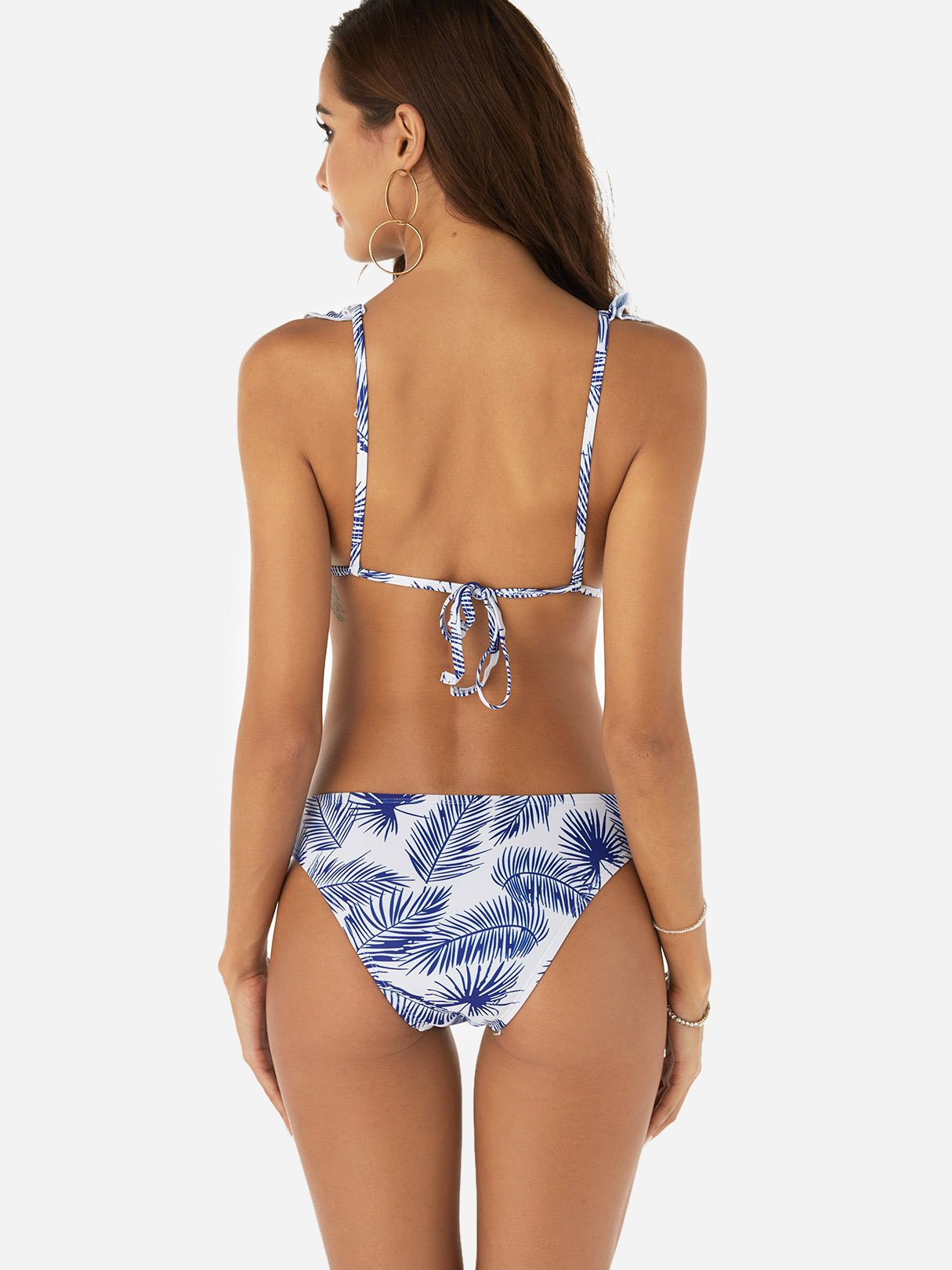White & Blue Scoop Neck Sleeveless Floral Print Tie-Up Flounced Hem Bikinis