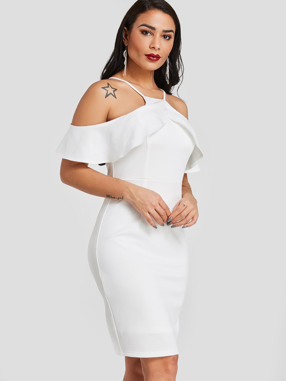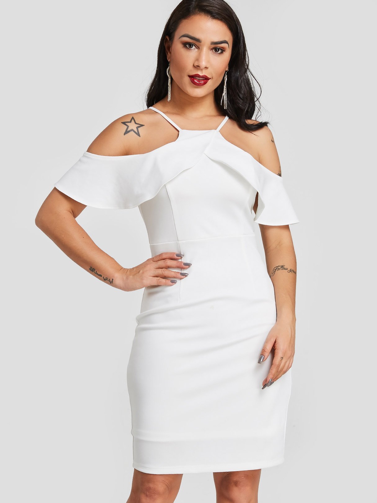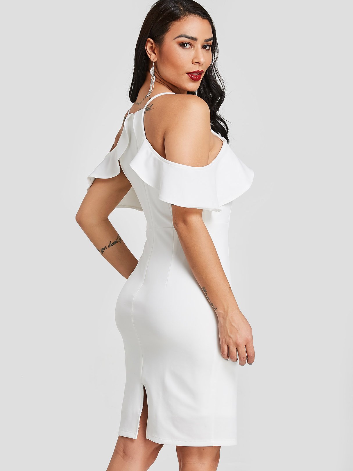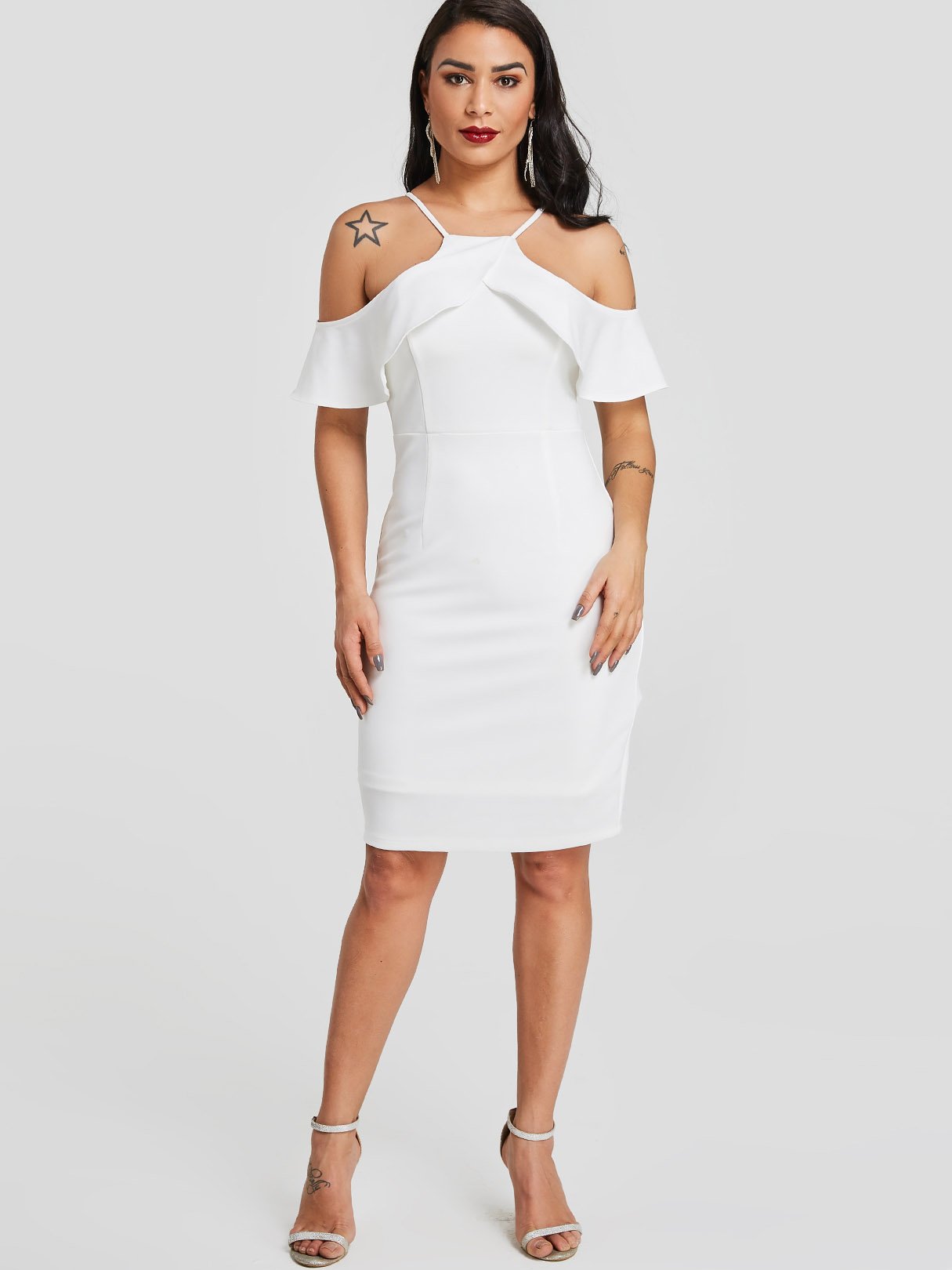 White Cold Shoulder Short Sleeve Plain Cut Out Sexy Dress
