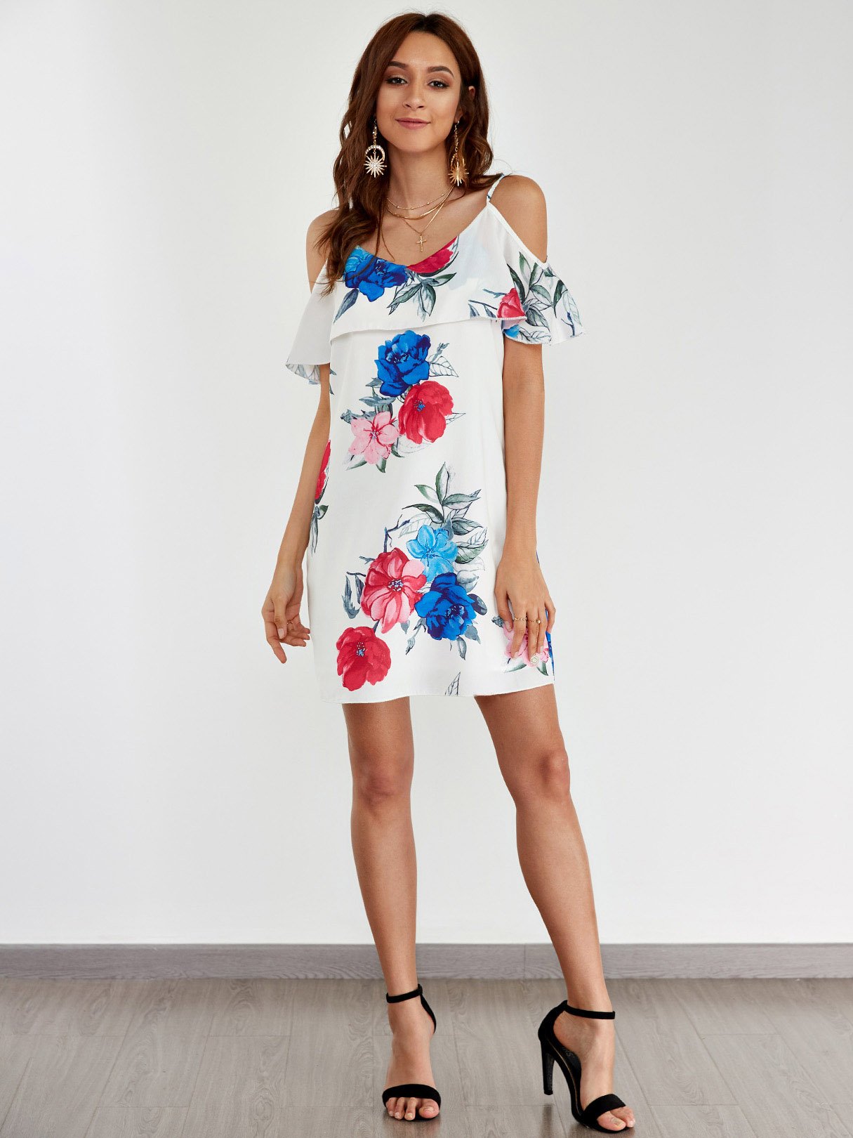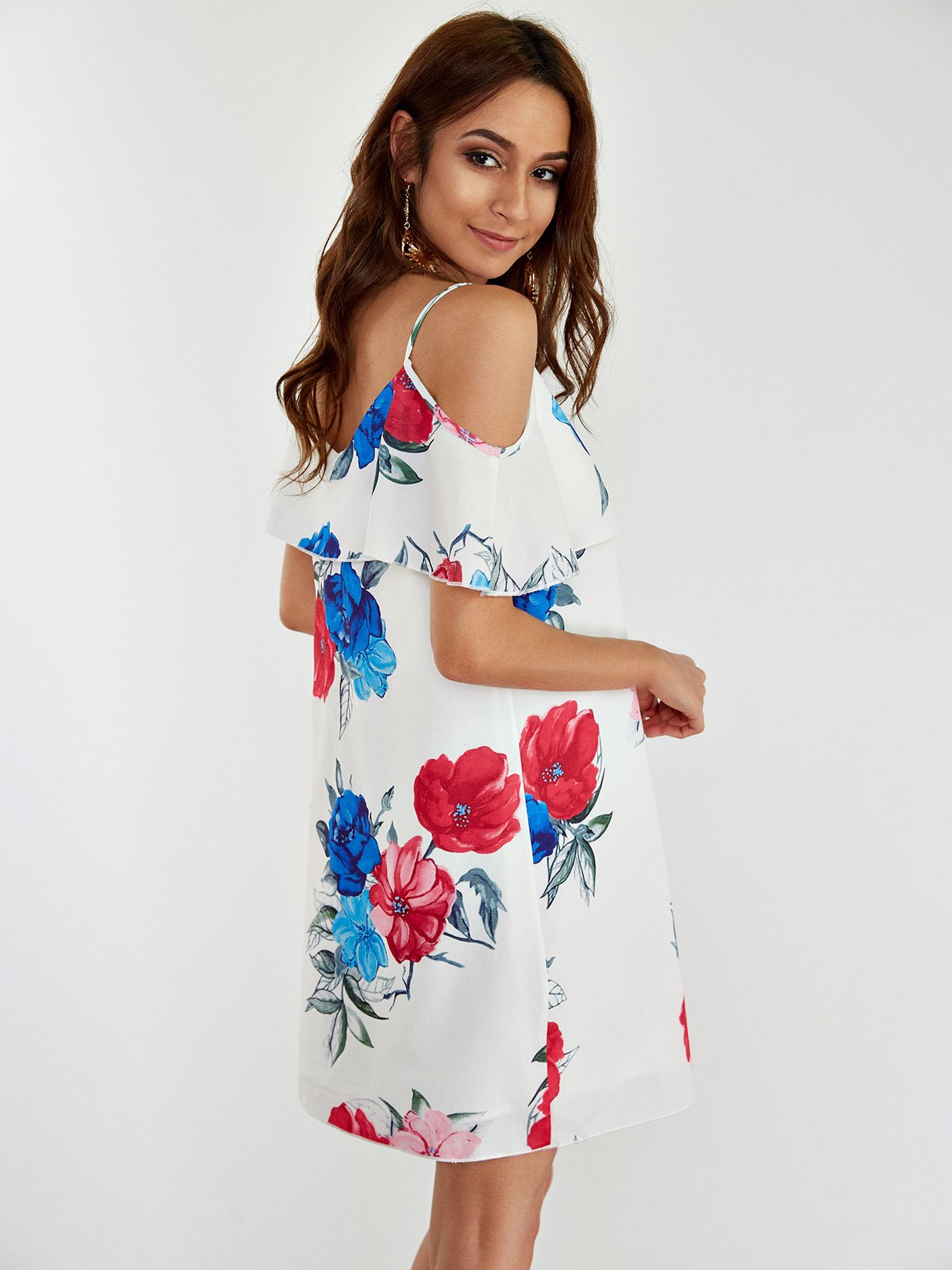 White Cold Shoulder Sleeveless Floral Print Spaghetti Strap Dresses