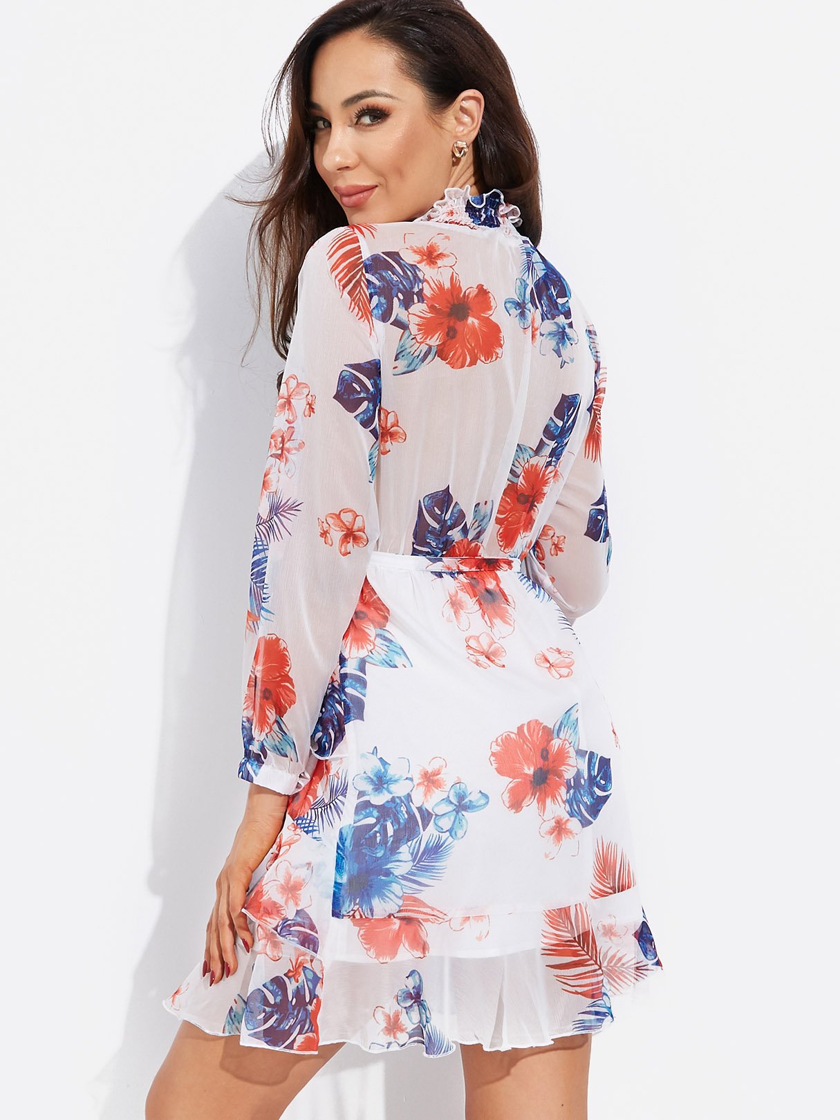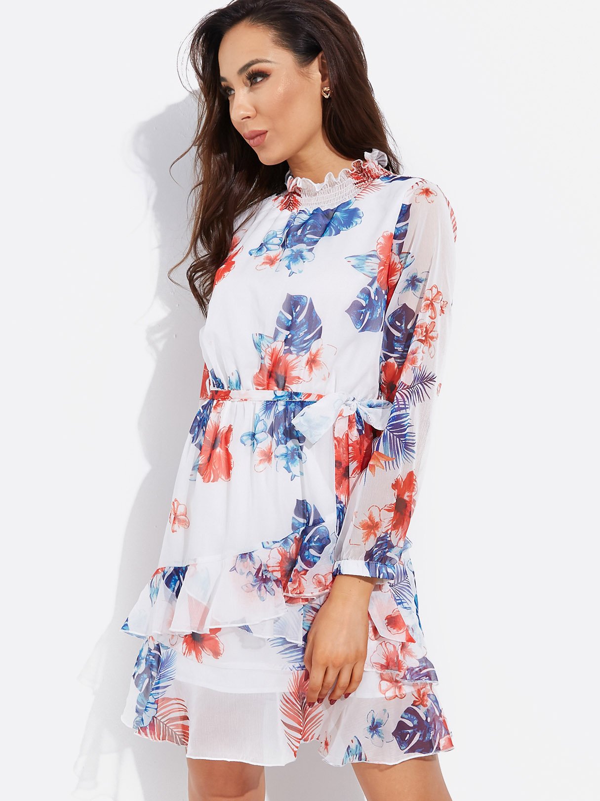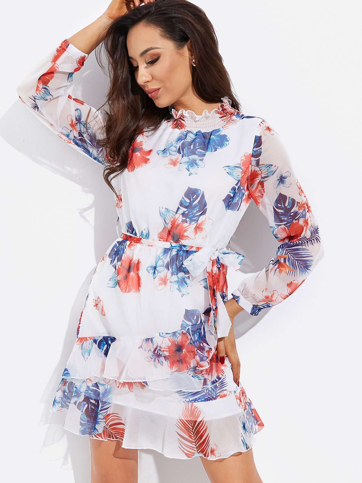 White Crew Neck Long Sleeve Floral Print Tiered Self-Tie Dresses
