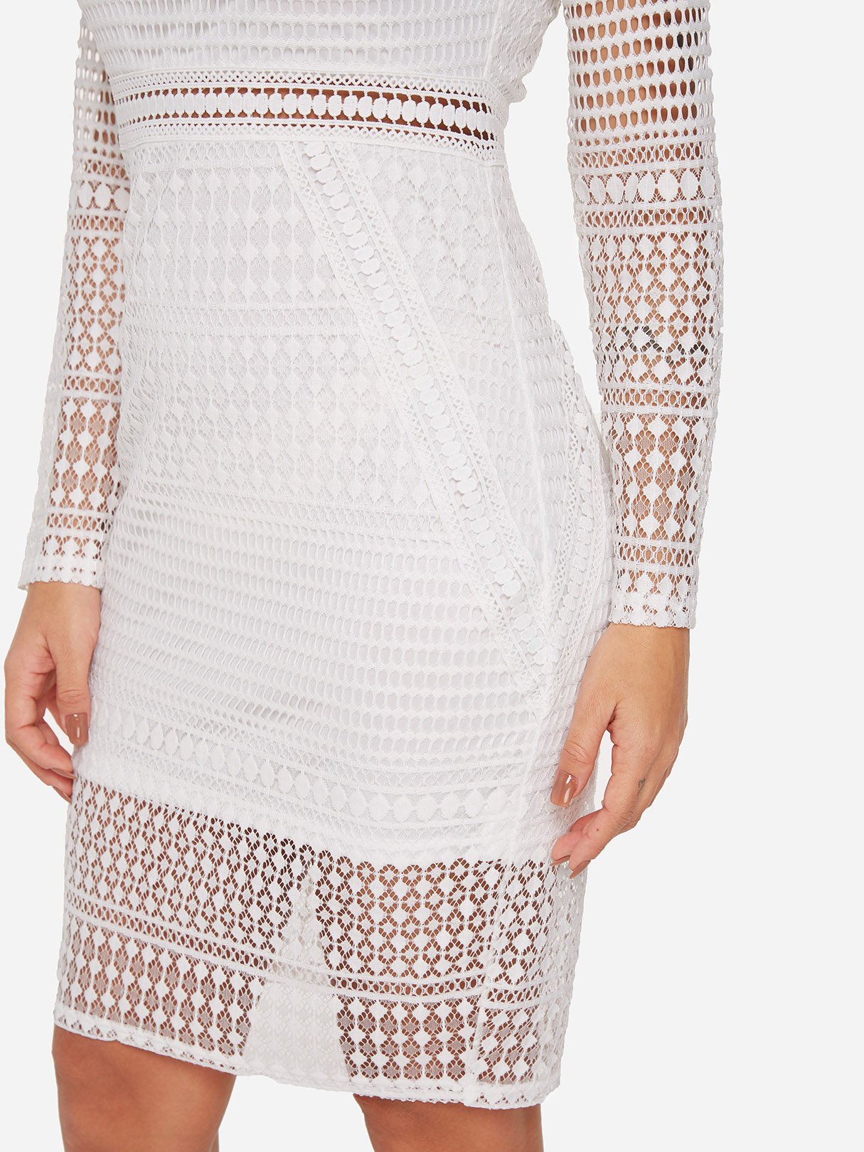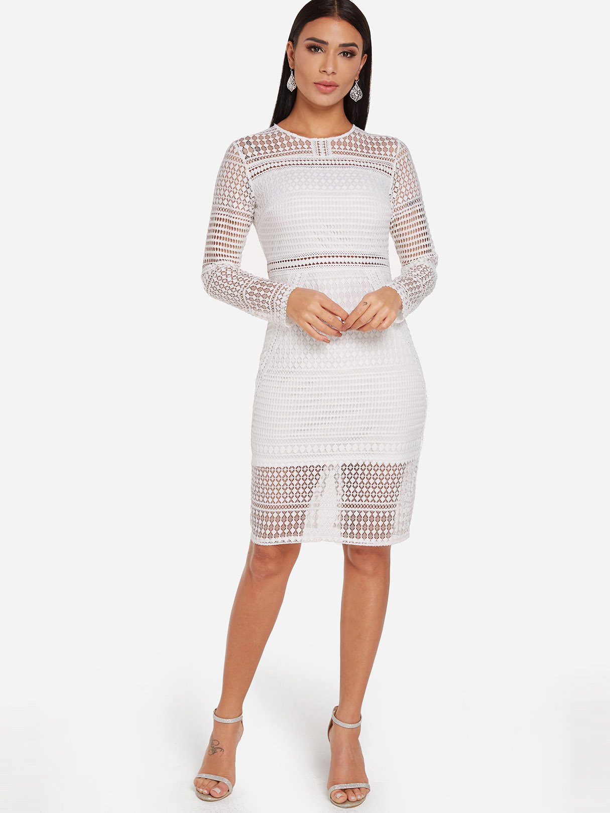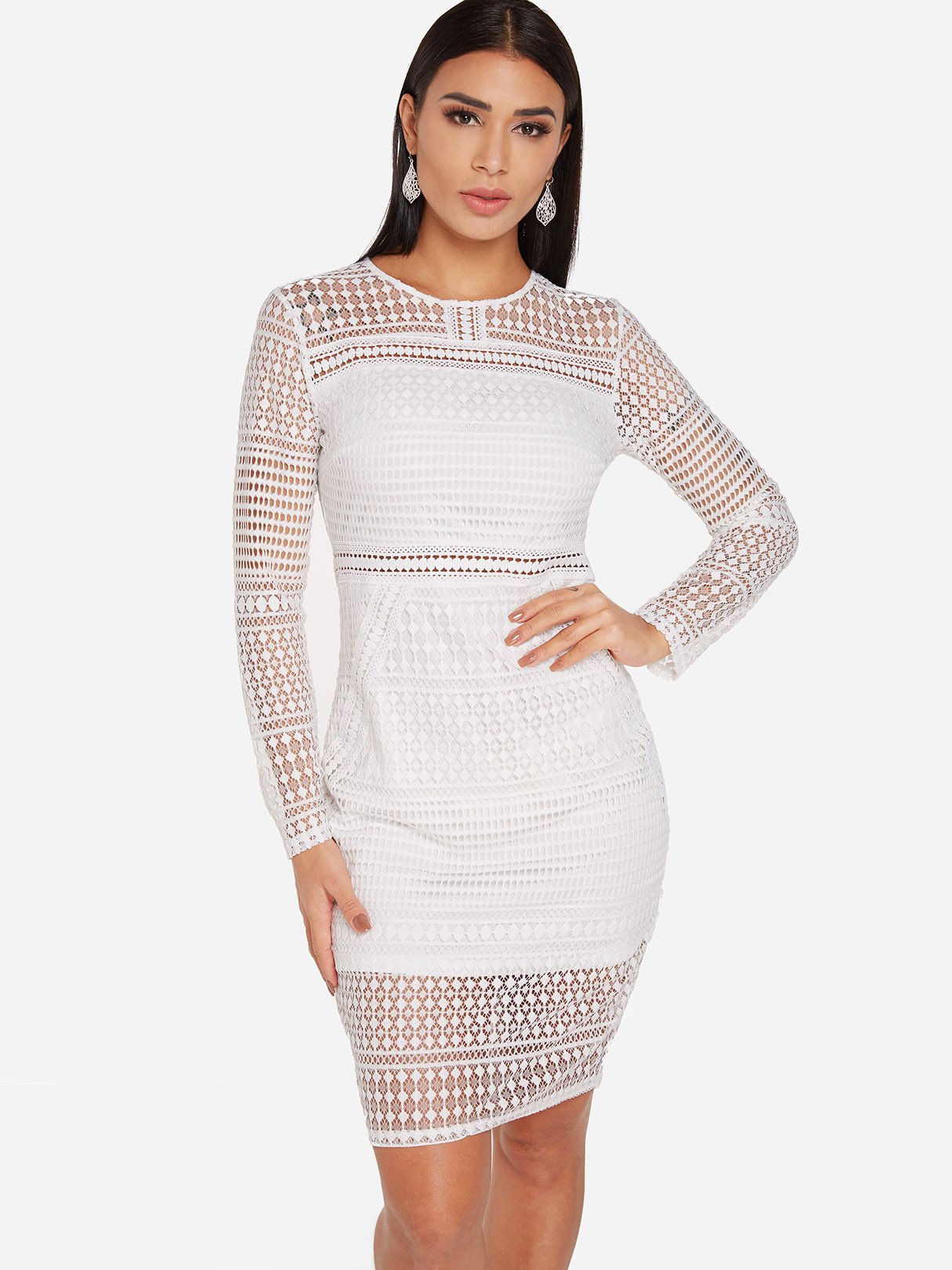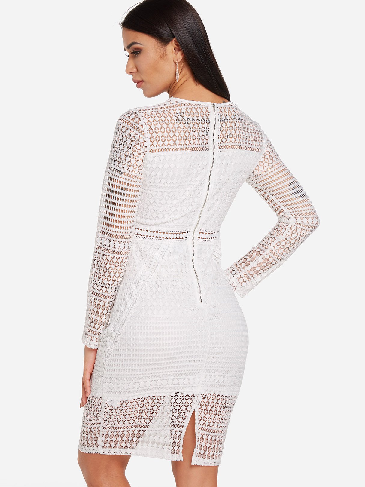 White Crew Neck Long Sleeve Plain Lace Zip Back See Through Slit Hem Sexy Dress