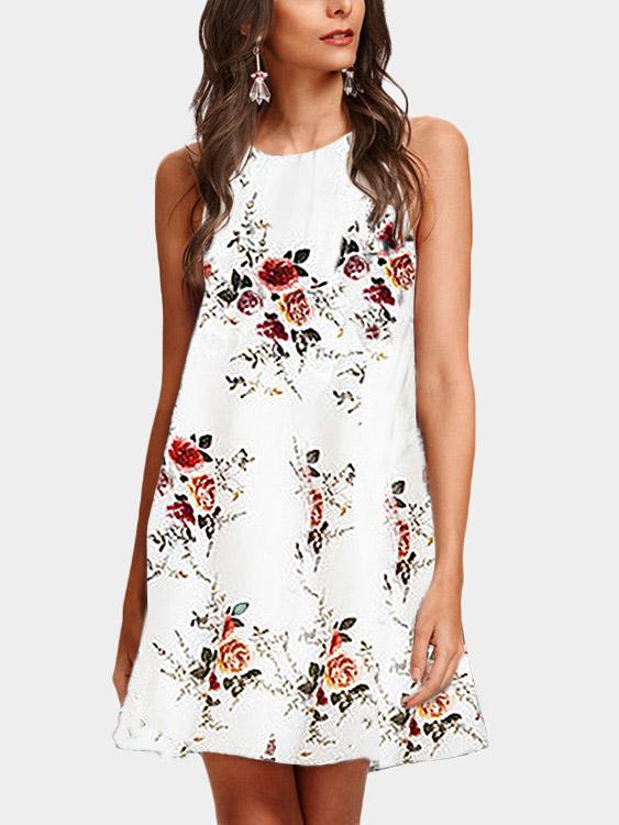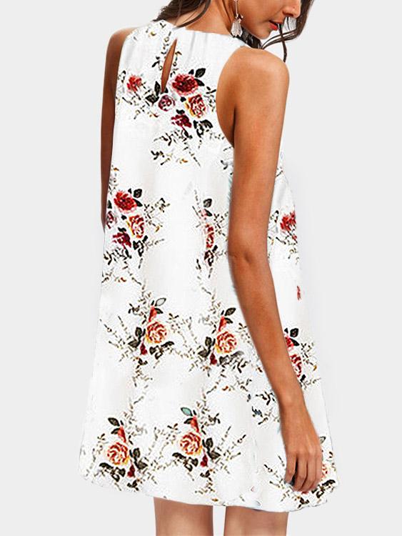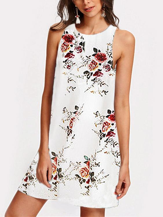 White Crew Neck Random Floral Calico Print Sleeveless Dresses