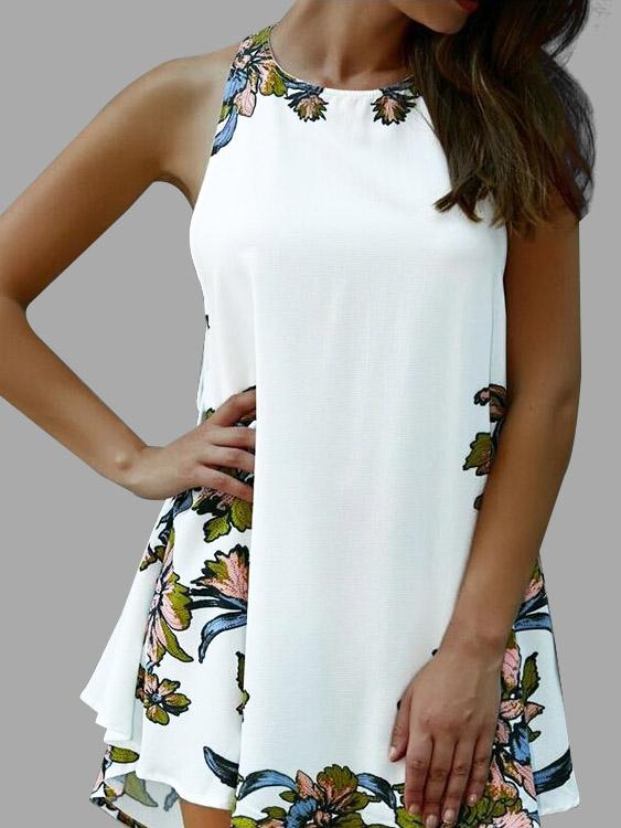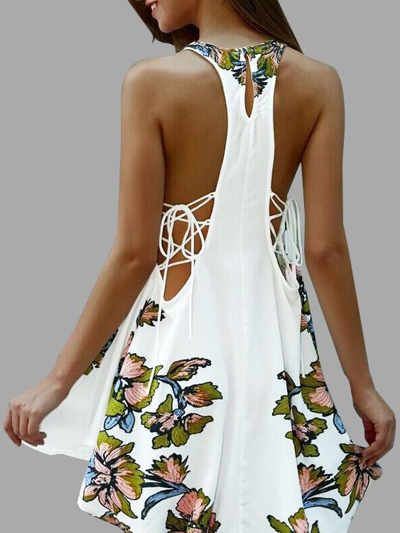 White Crew Neck Sleeveless Floral Print Lace-Up Cut Out Irregular Hem Dresses