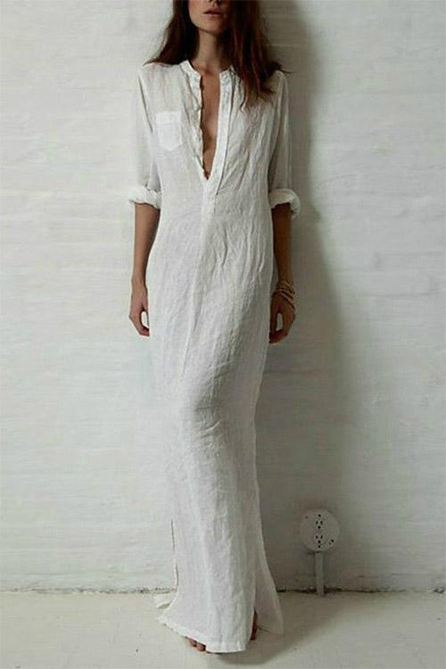 White Deep V Neck 3/4 Sleeve Length Dresses