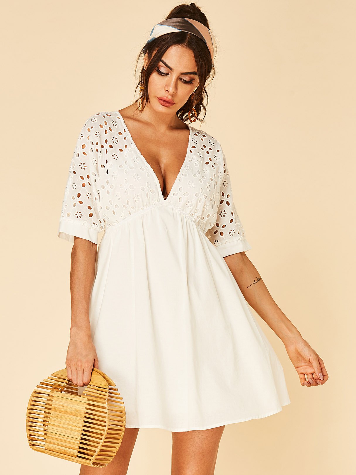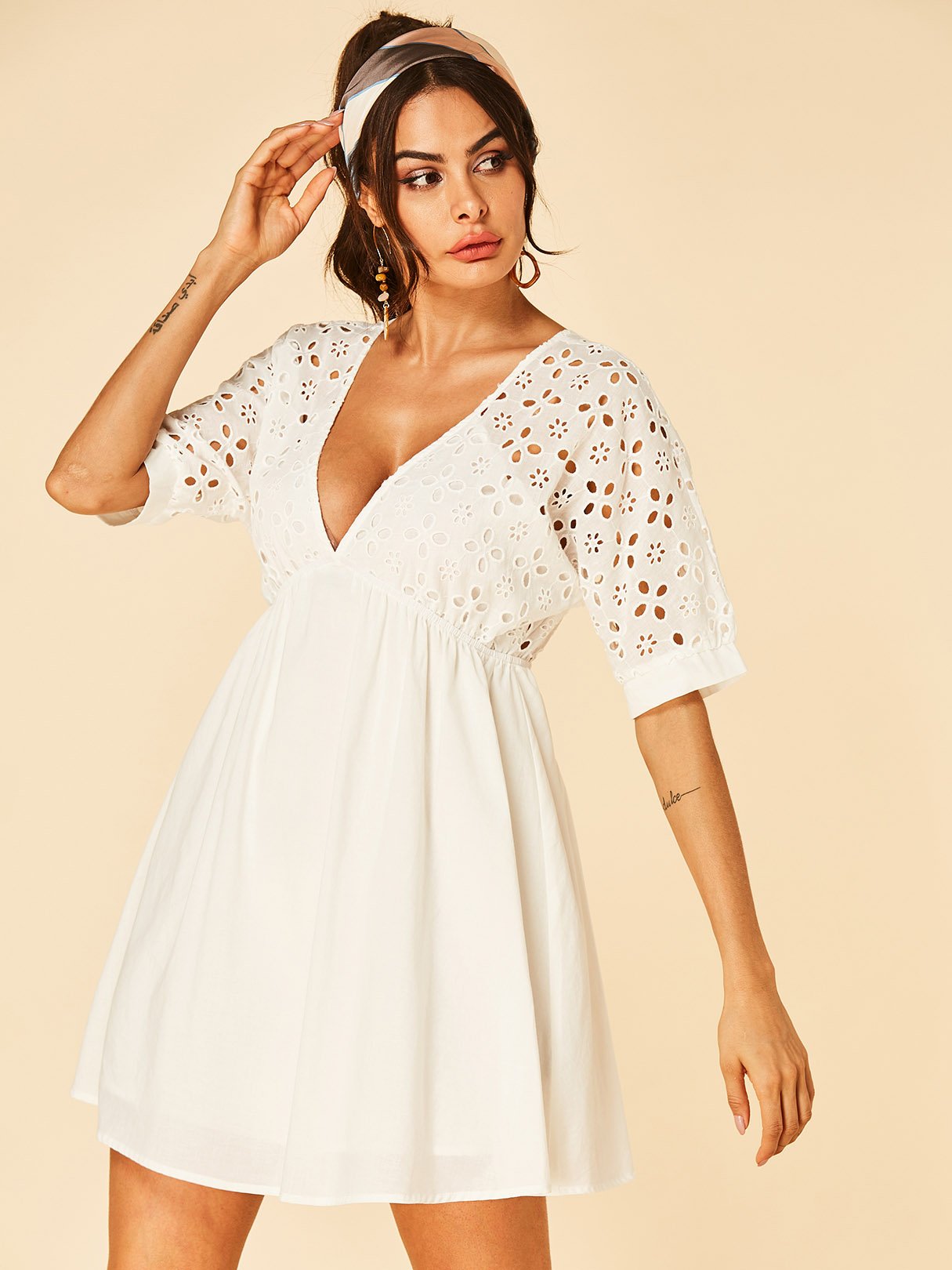 White Deep V Neck Half Sleeve Backless Hollow Dresses