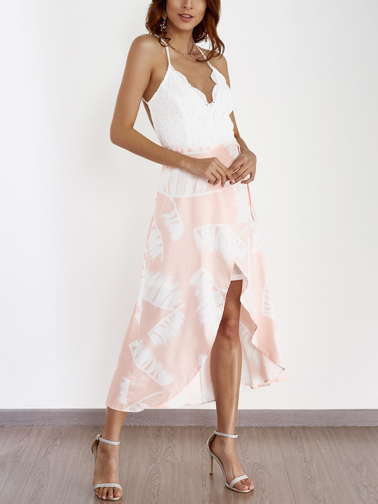 White Deep V Neck Sleeveless Printed Backless Slit Hem Midi Dress