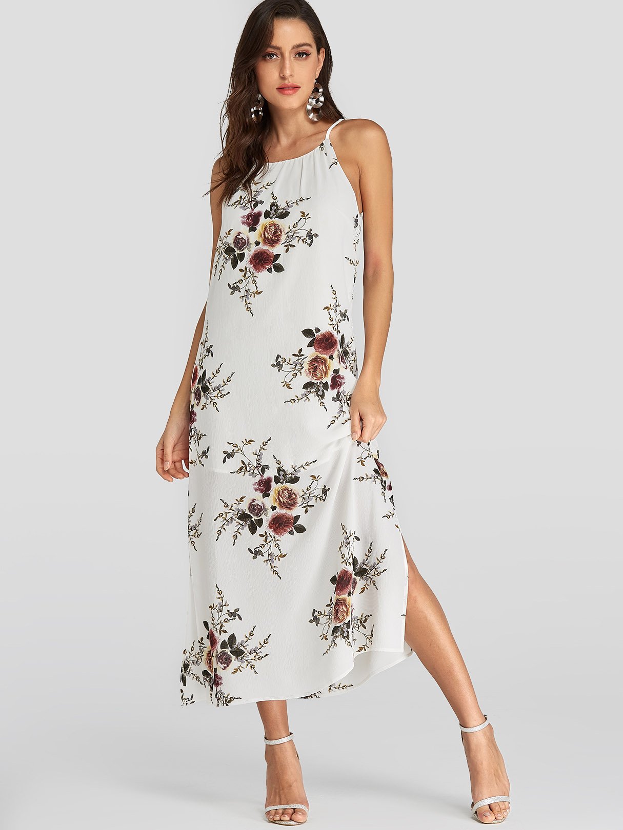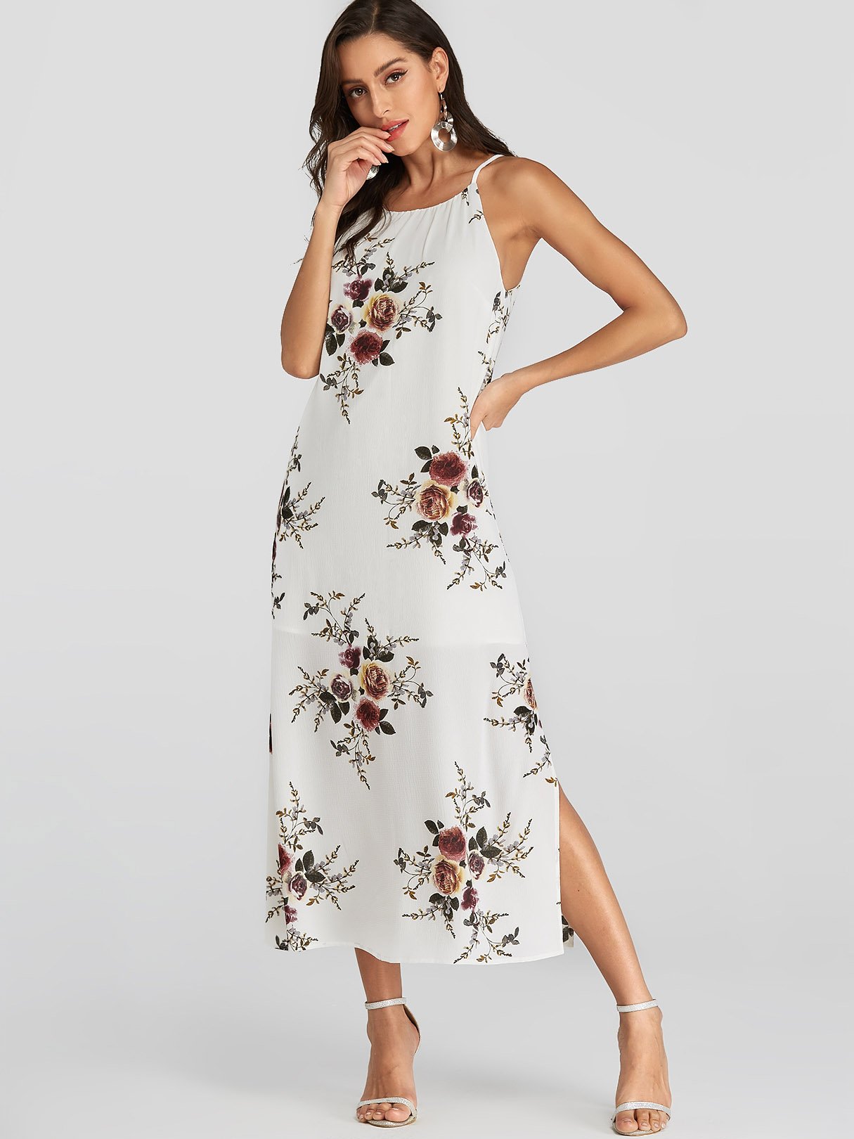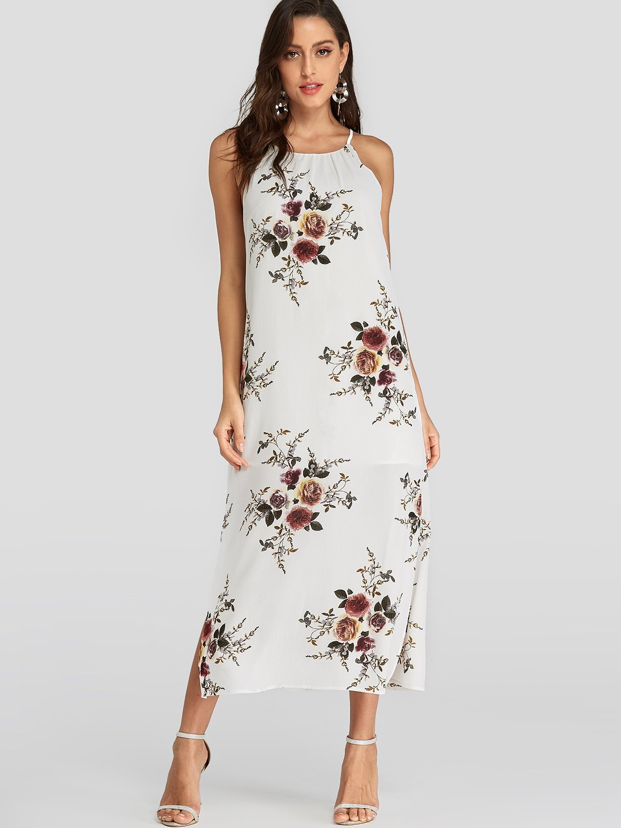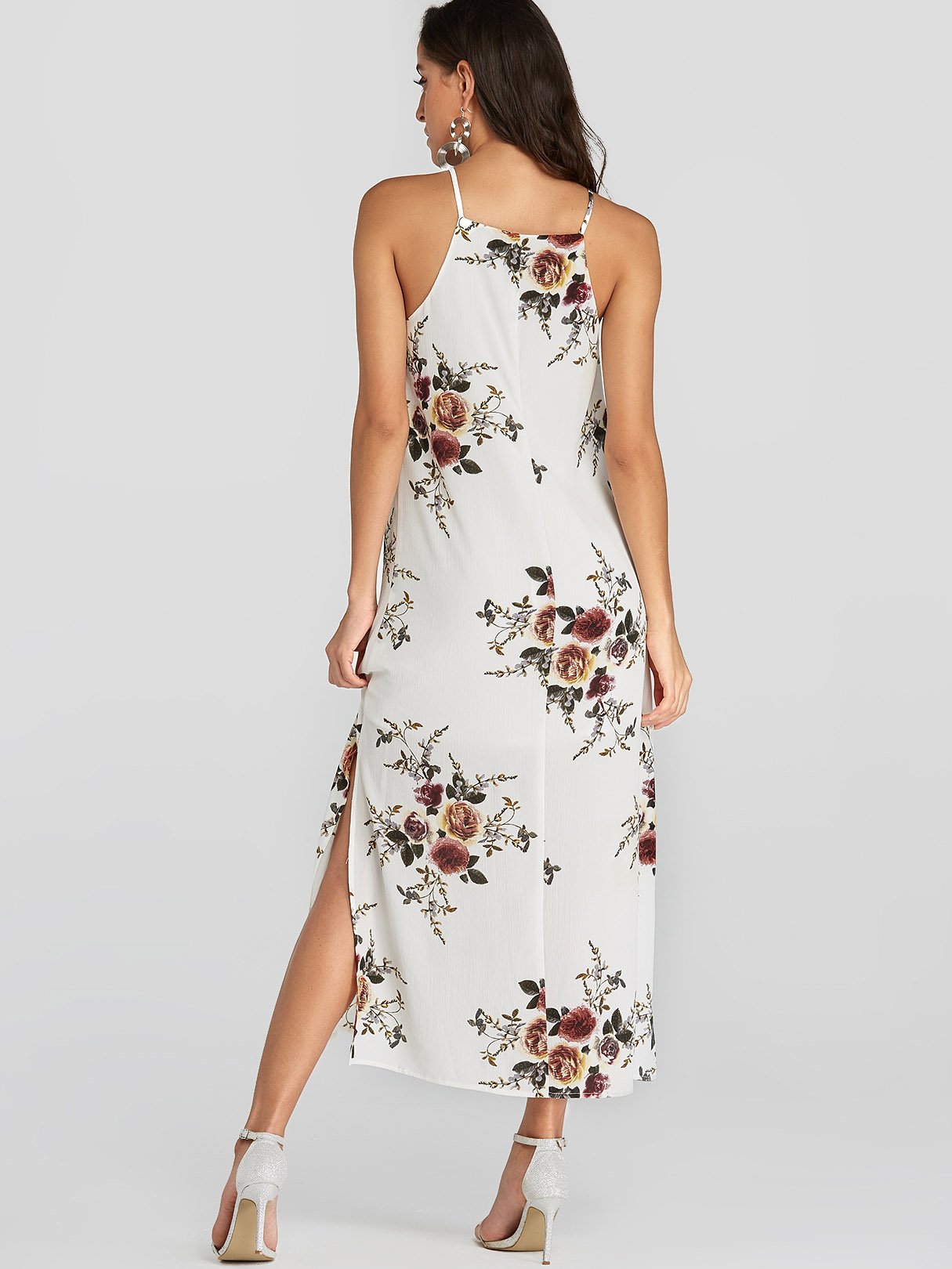 White Halter Sleeveless Floral Print Backless Slit Hem Dresses