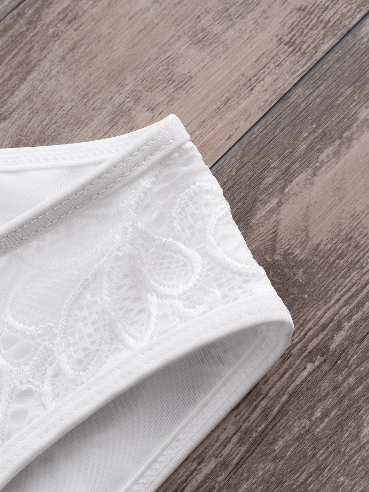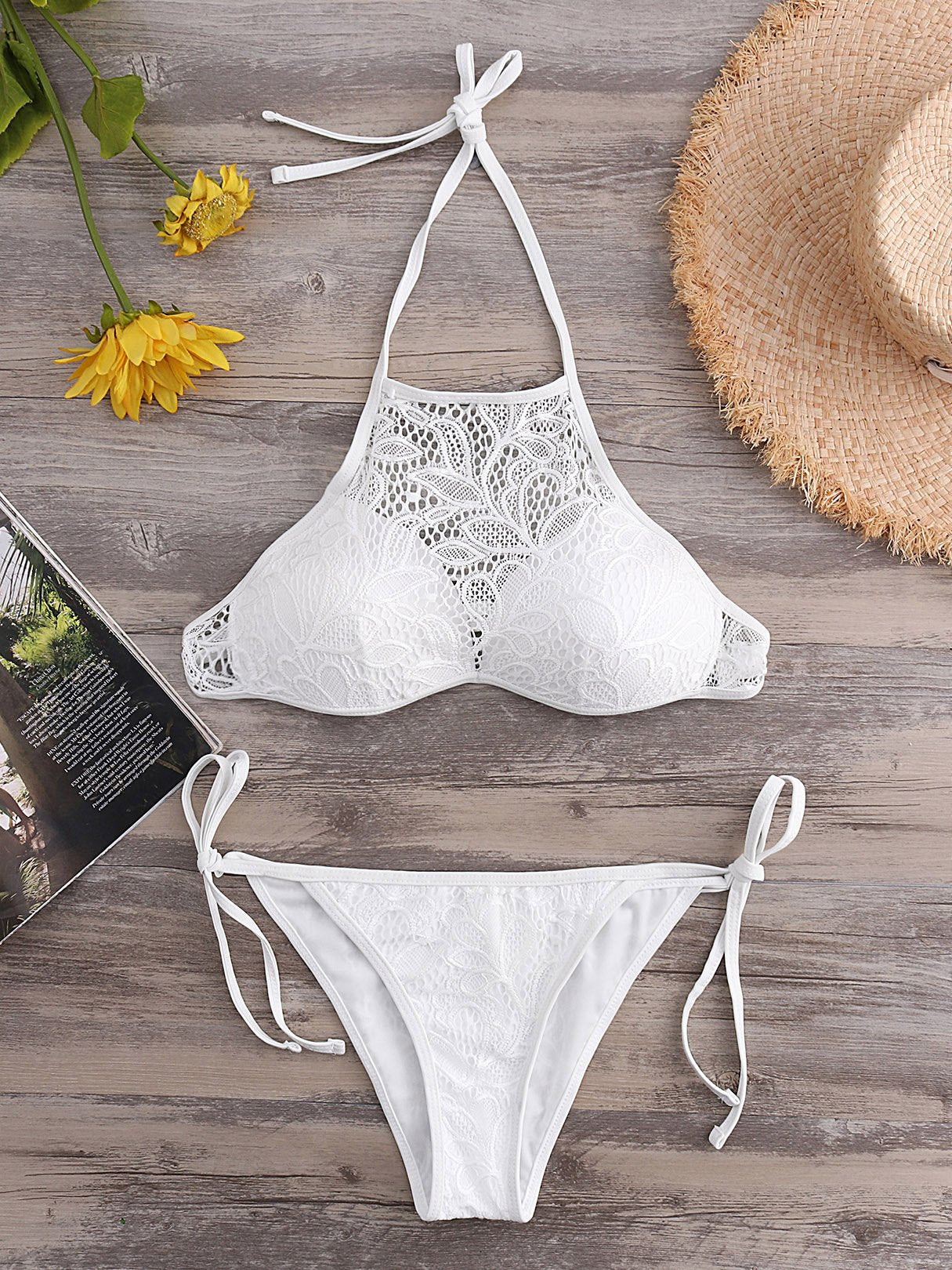 White Halter Sleeveless Lace Backless Self-Tie Two Piece Bikini