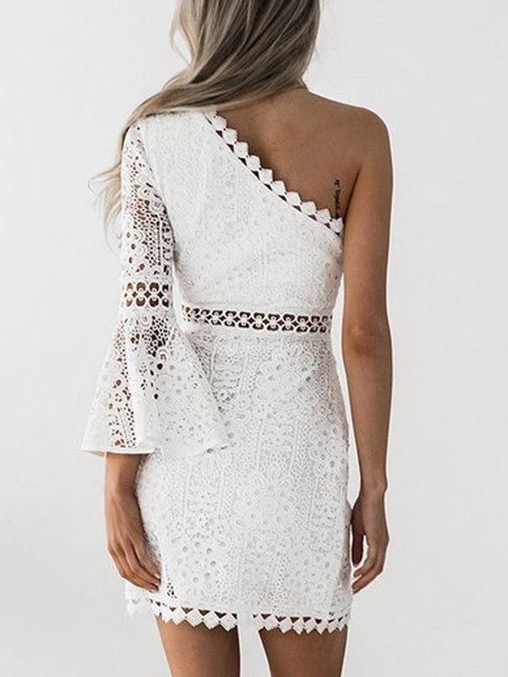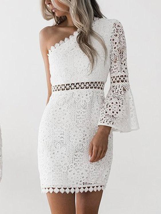 White One Shoulder Long Sleeve Plain Lace Zip Back Hollow Sexy Dress