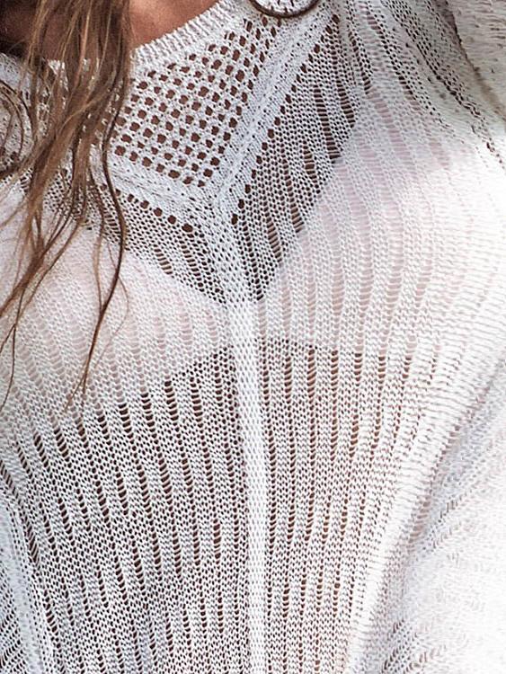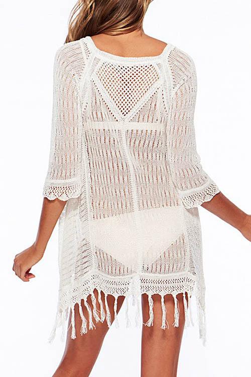 White Round Neck 3/4 Sleeve Length Tassel Hem Mini Dress