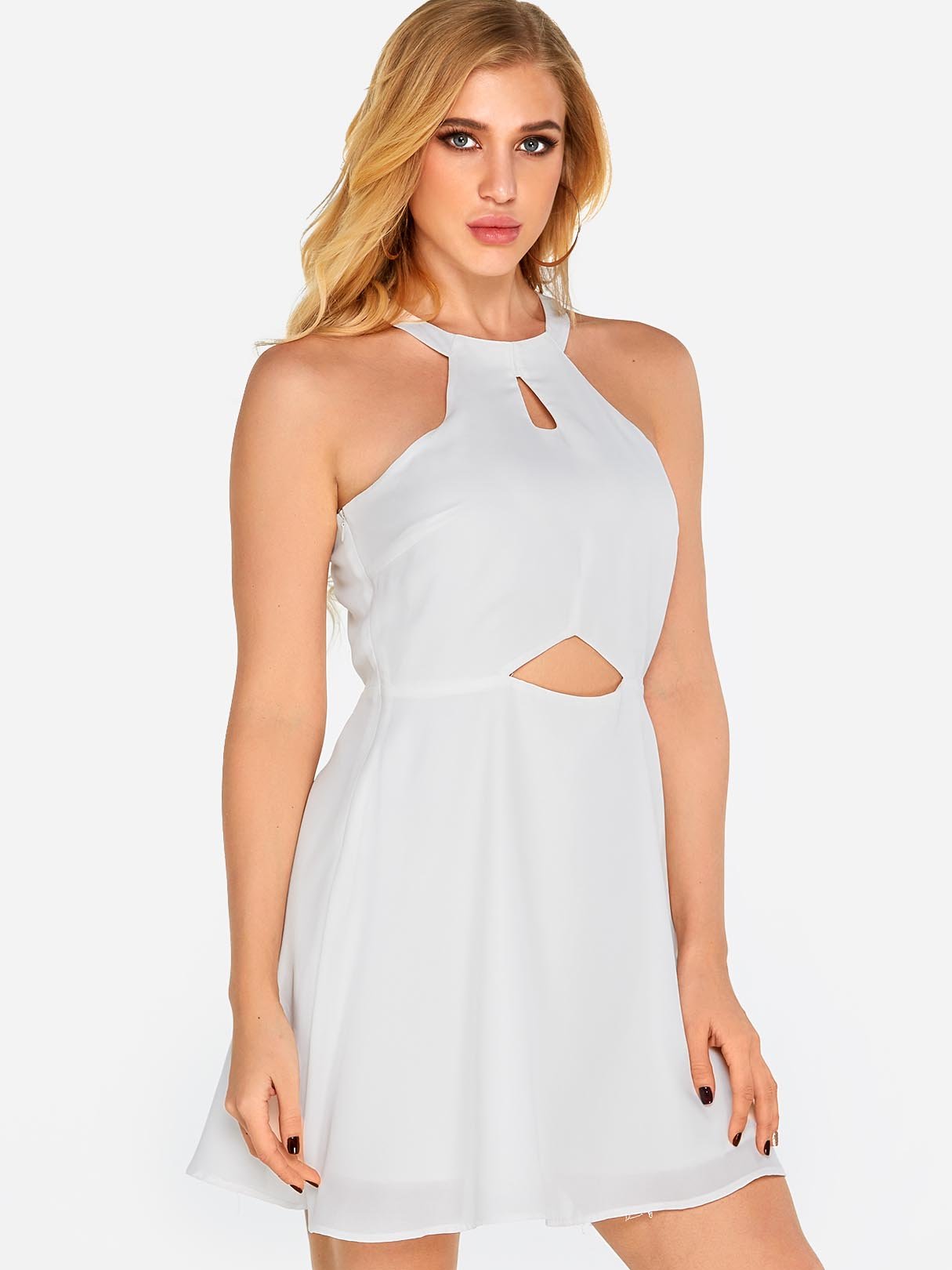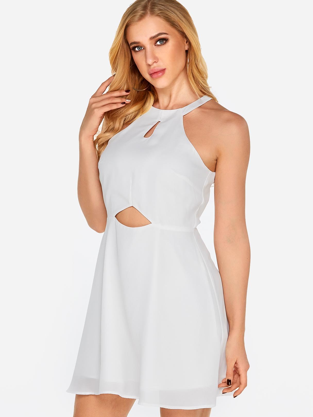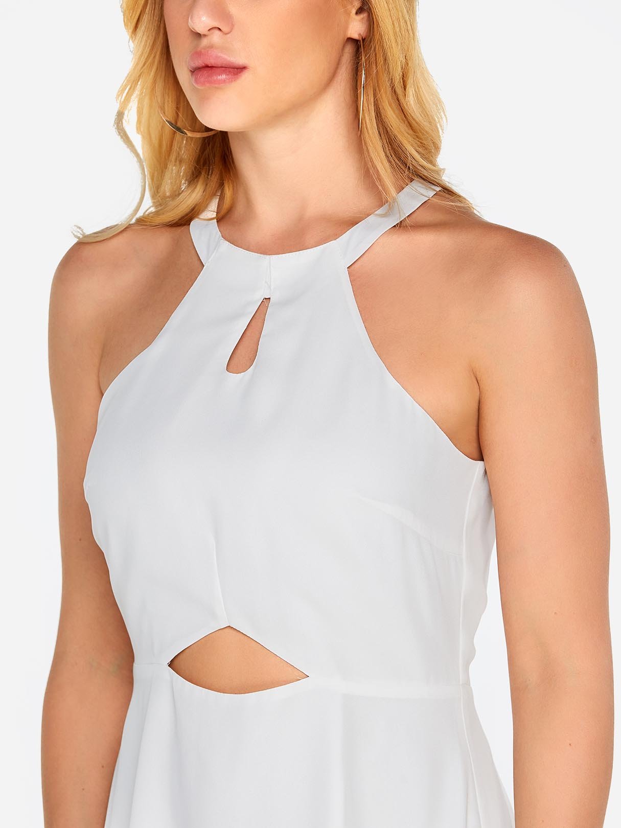 White Round Neck Halter Sleeveless Plain Cut Out Sexy Dress