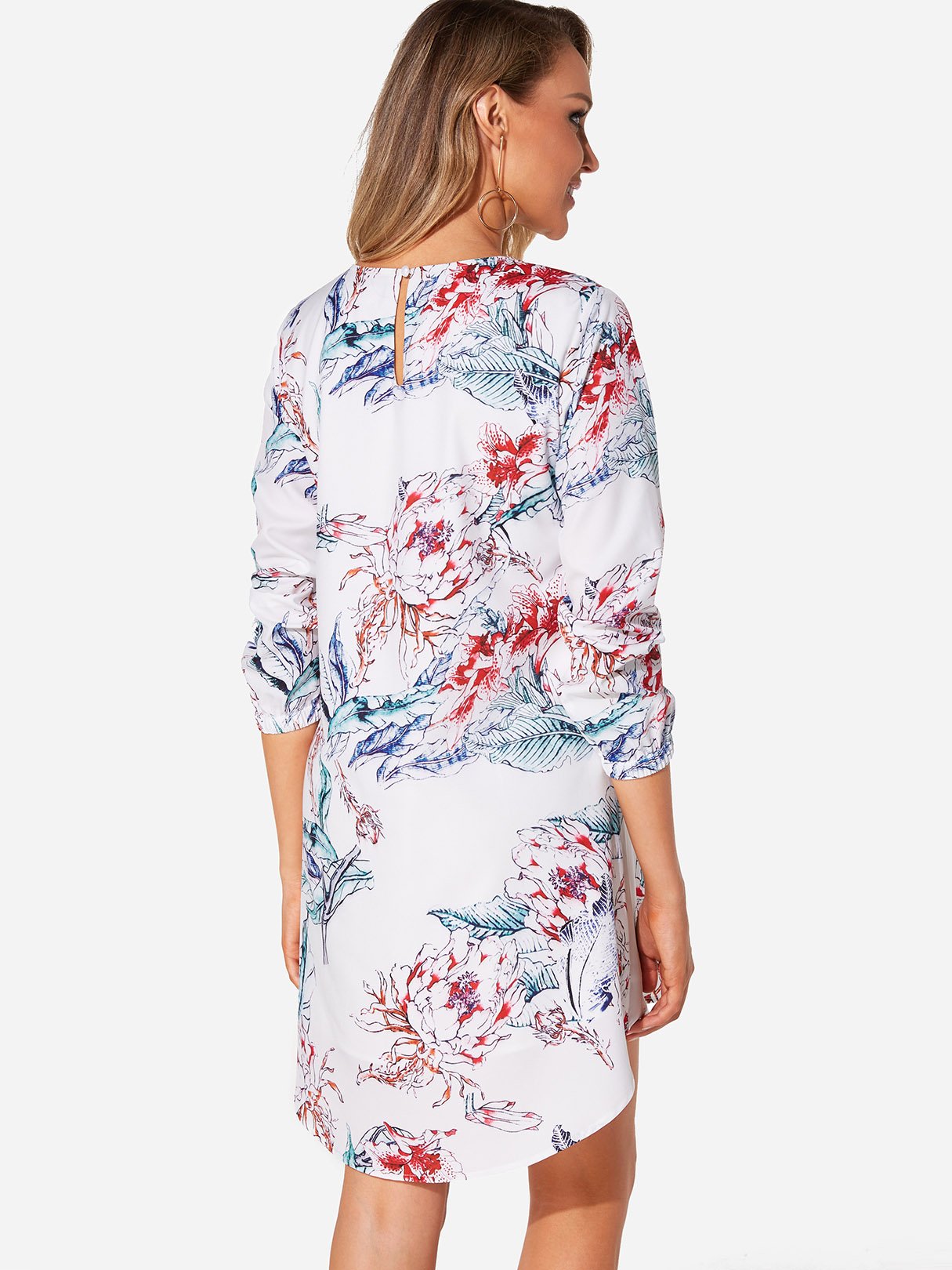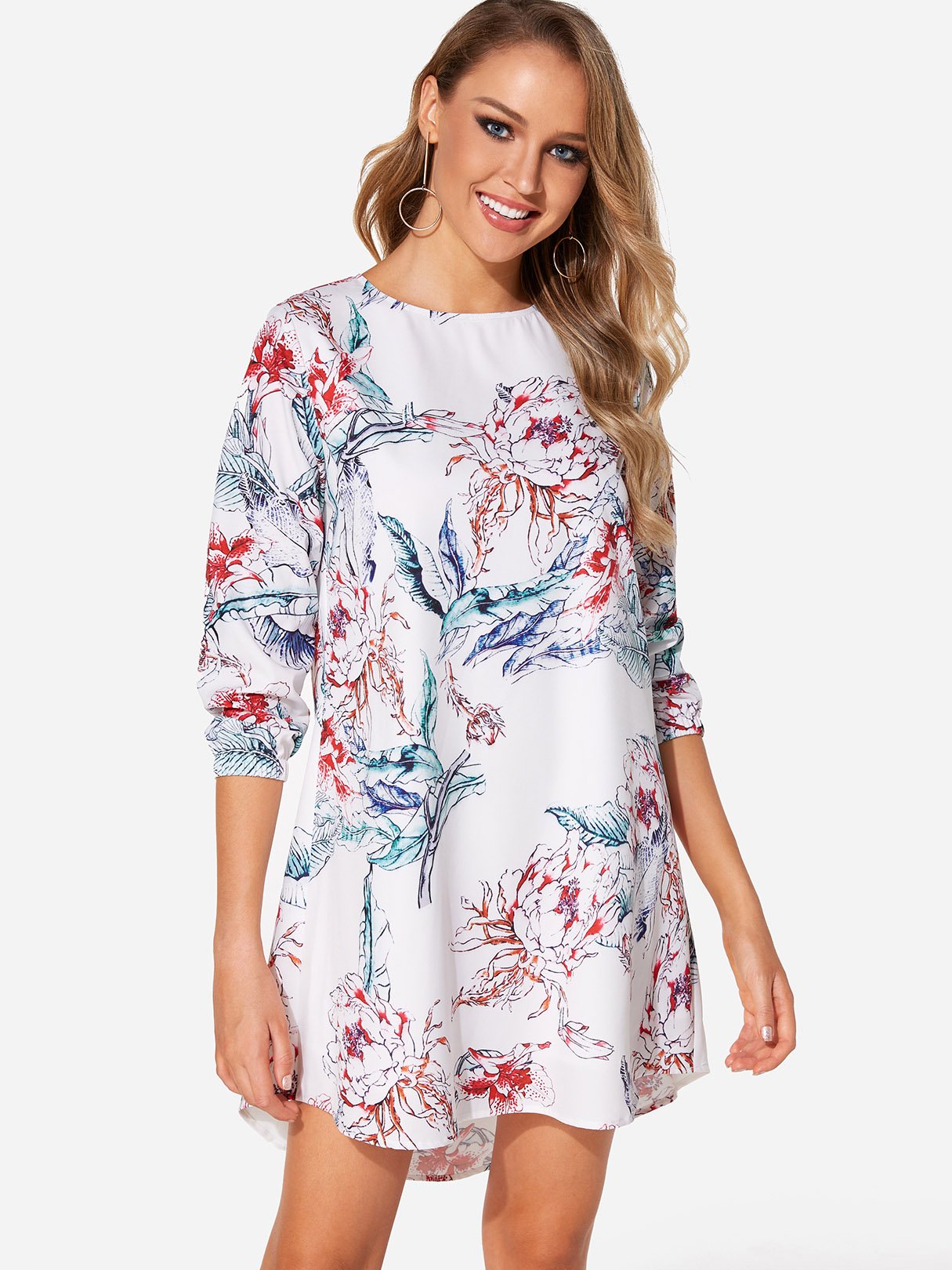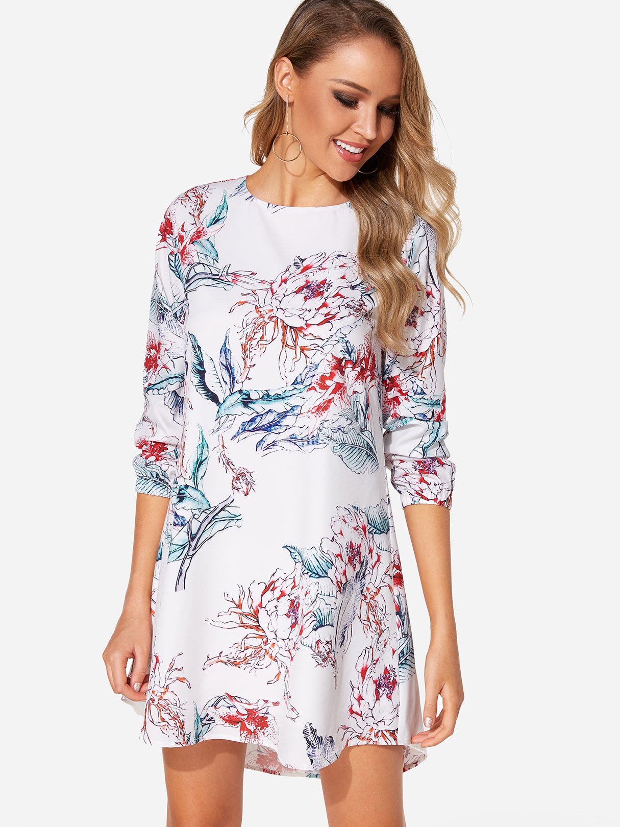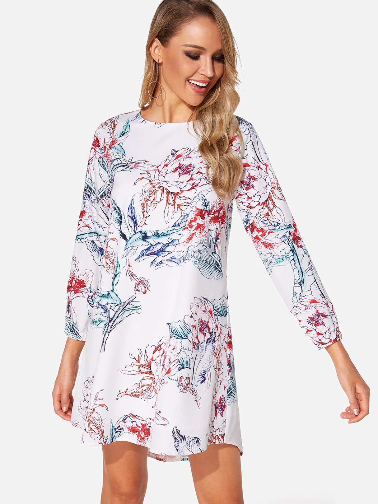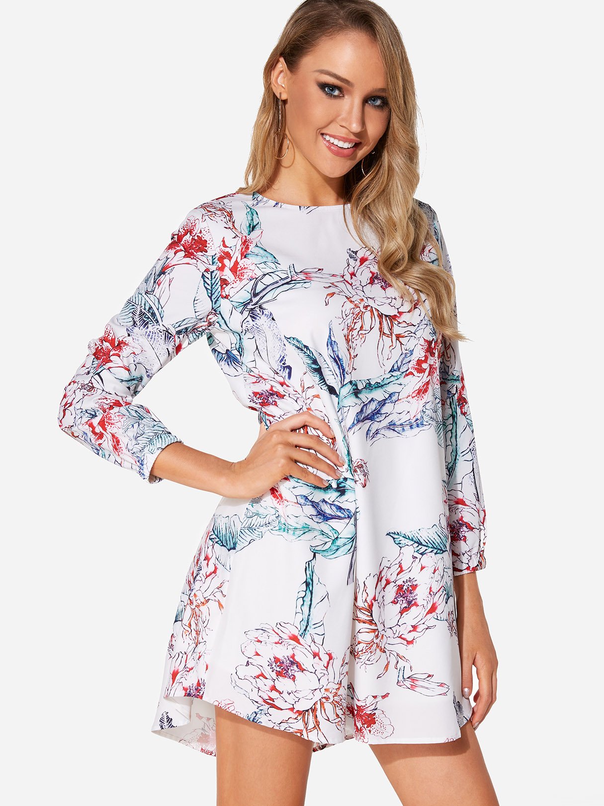 White Round Neck Long Sleeve Floral Print Curved Hem Dresses