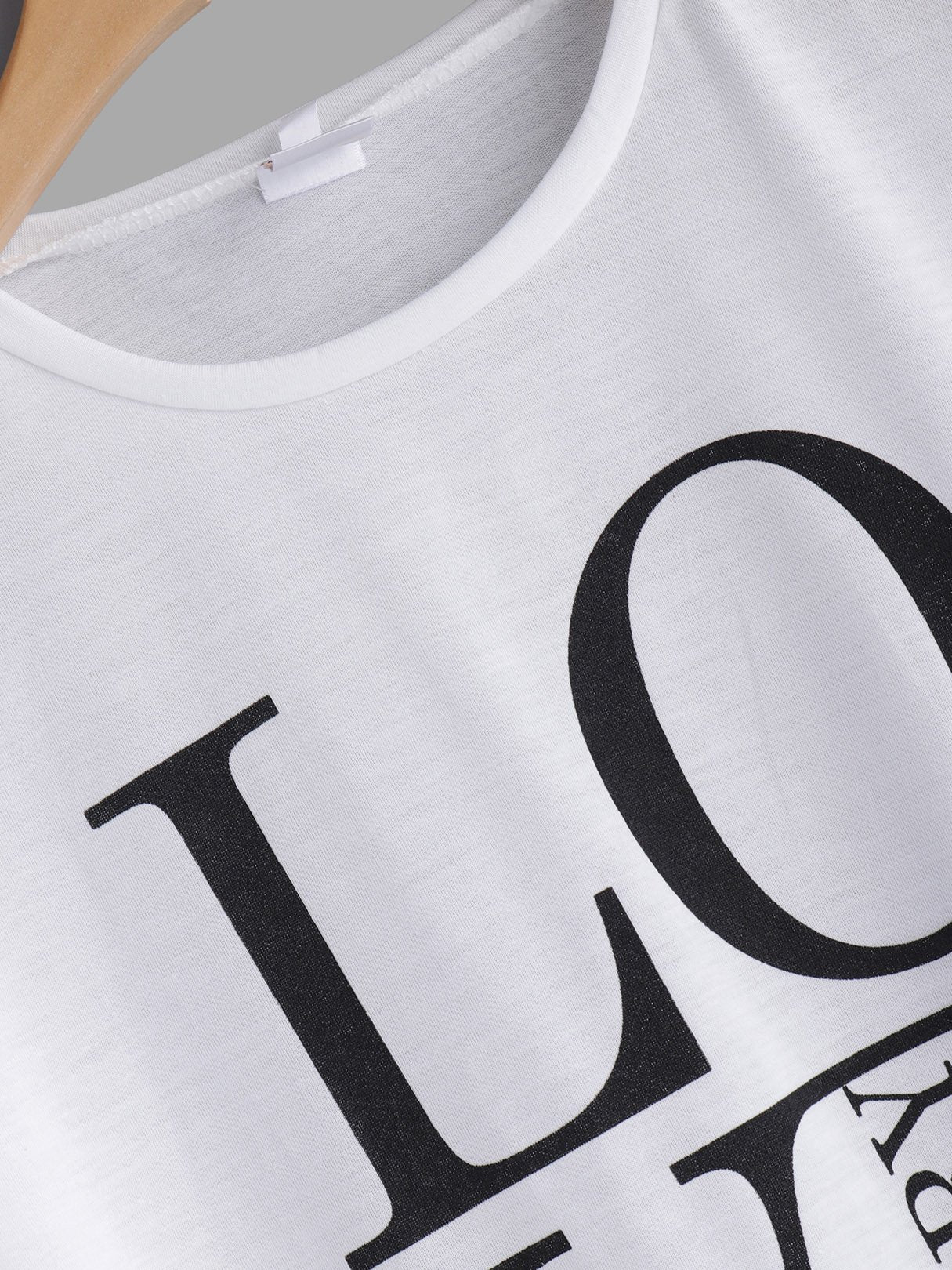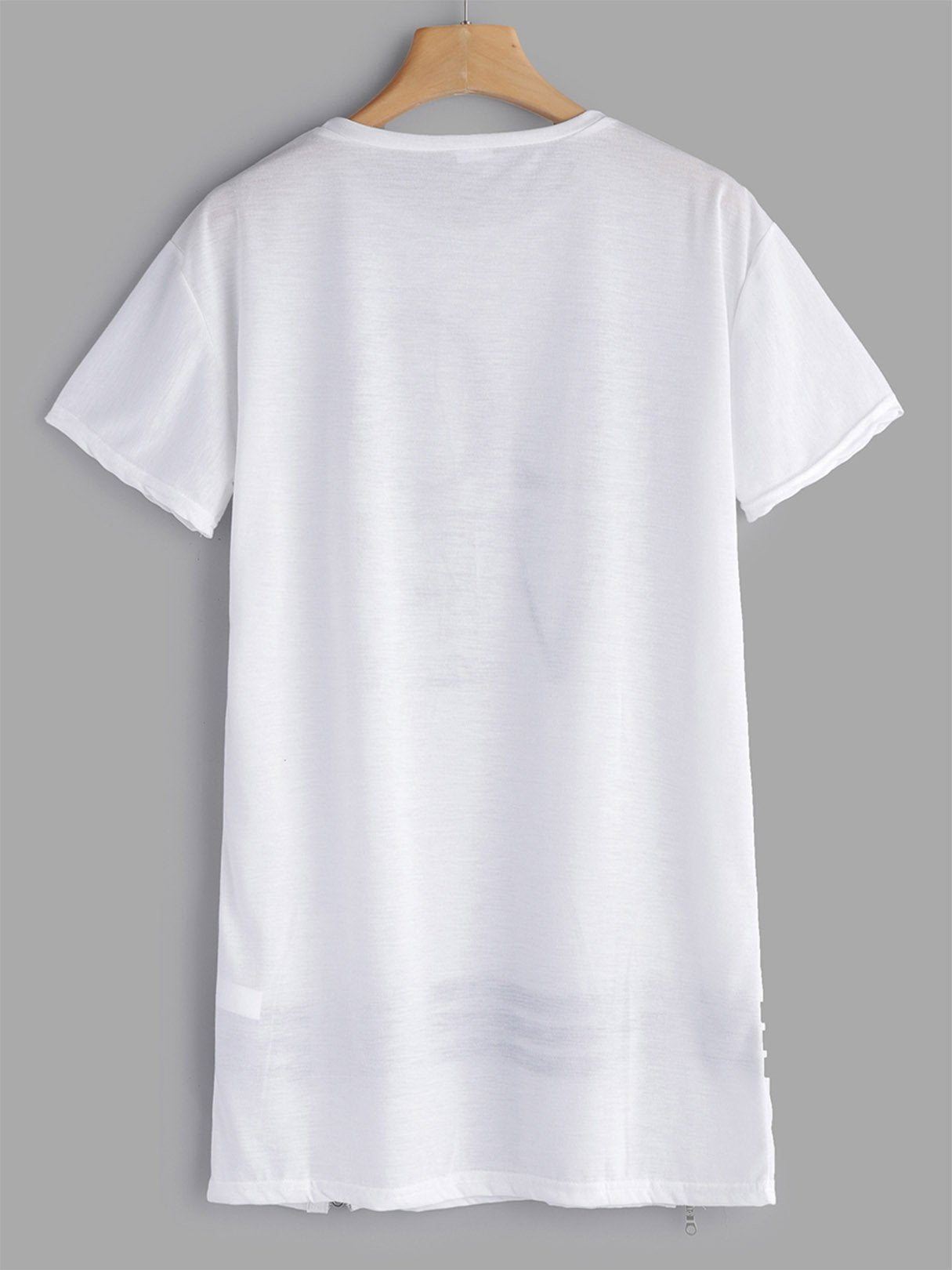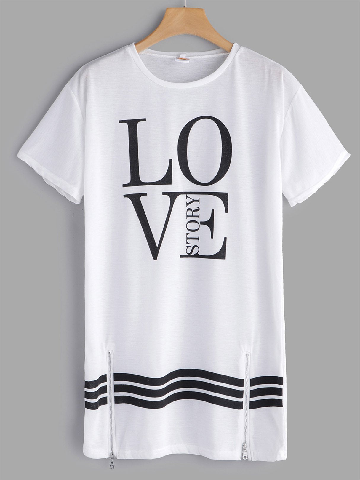 White Round Neck Short Sleeve Letter Zip Back Mini Dresses