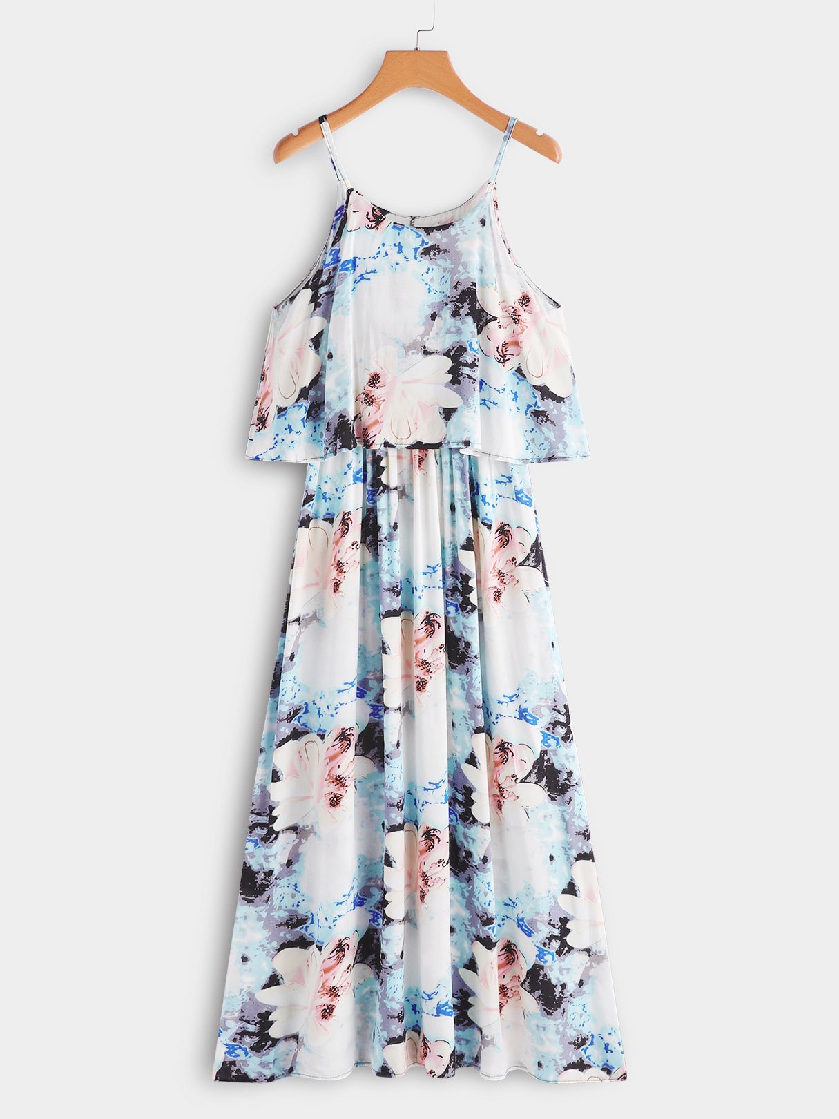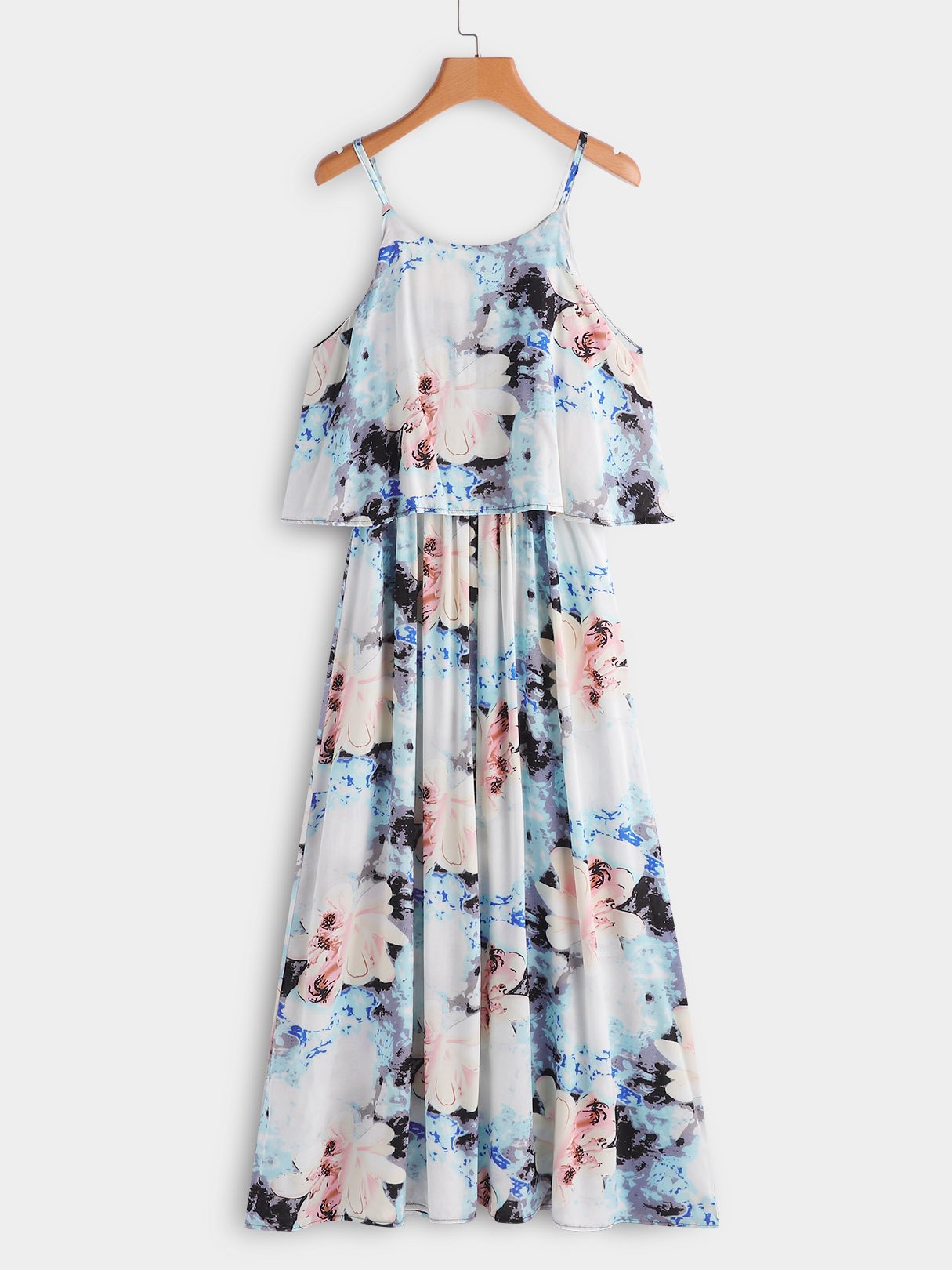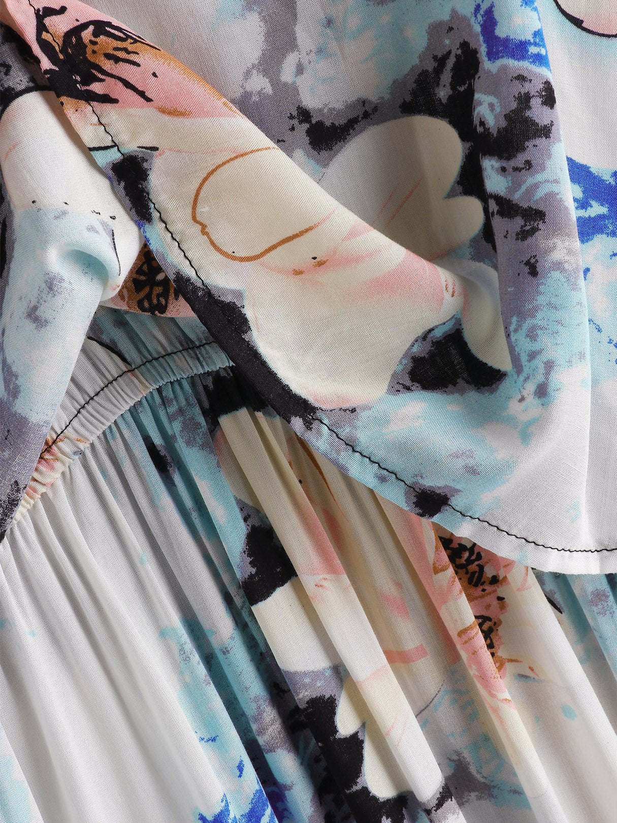 White Square Neck Sleeveless Floral Print Tiered Backless Ruffle Hem Dresses