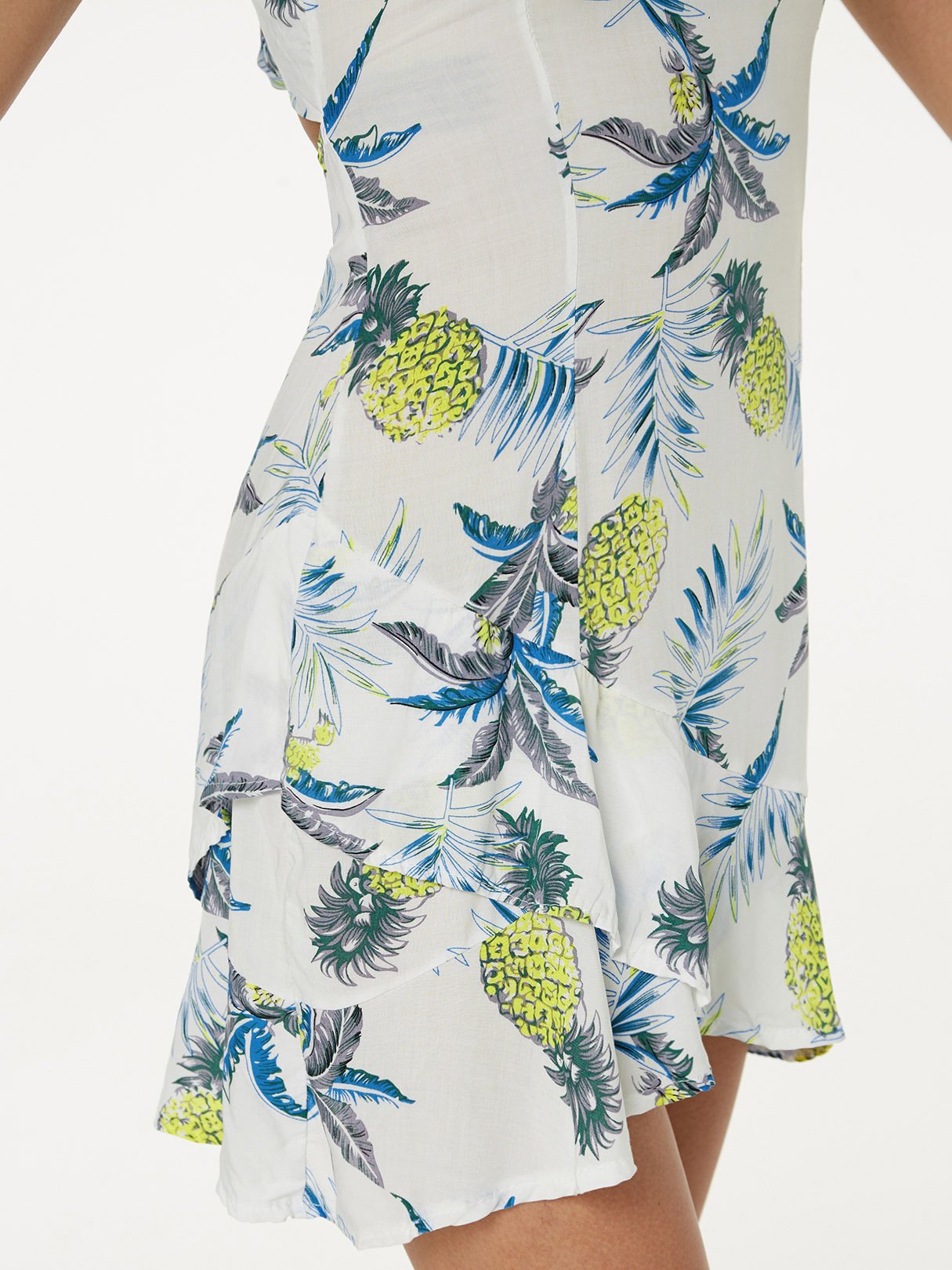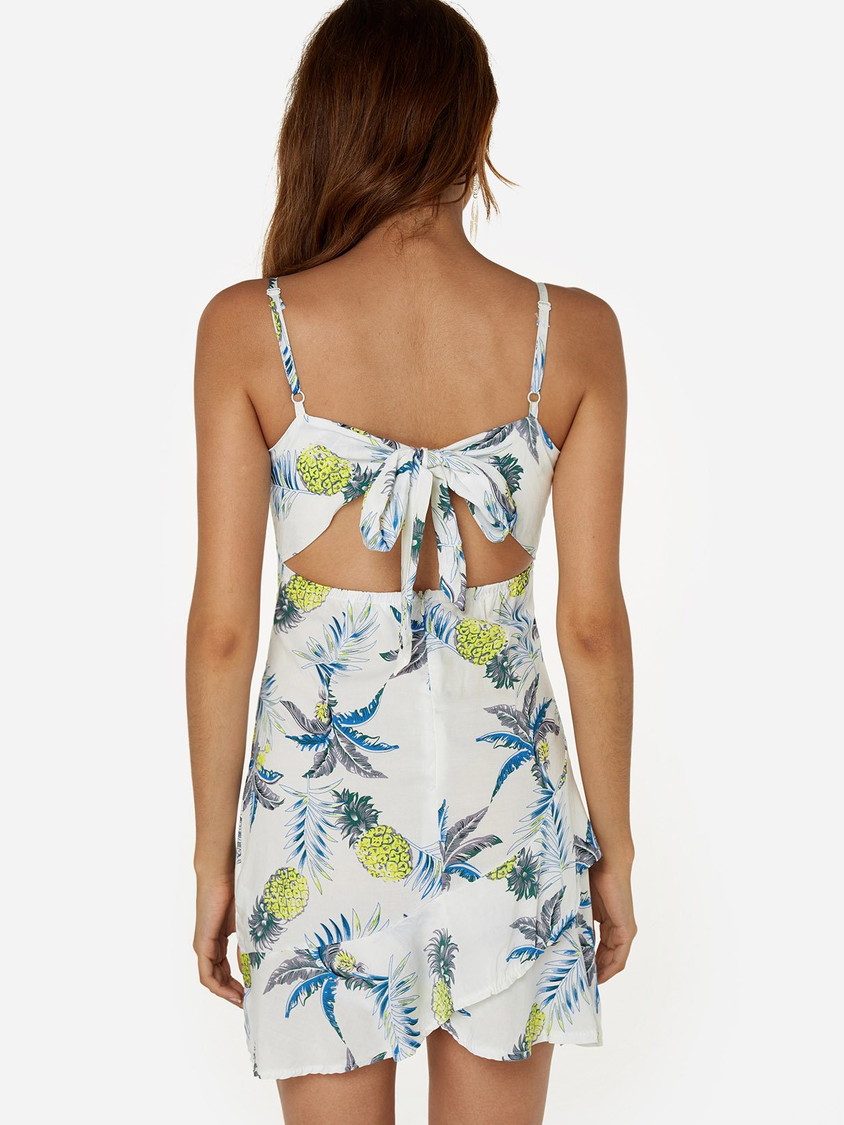 White Square Neck Sleeveless Floral Print Zip Back Cut Out Bowknot Flounced Hem Mini Dress - White / S is backordered and will ship as soon as it is back in stock.