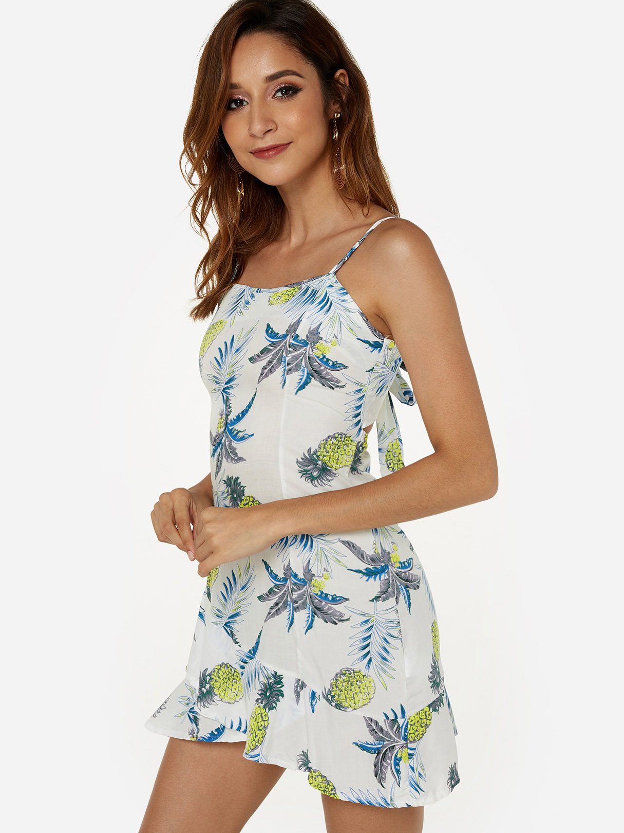 Material:PolyesterNeckline:Square NeckSeason:SummerSleeves:SleevelessPattern:Floral PrintStyle:Casual StyleDetail:Adjustable Shoulder Straps,Zip Back Design,Cut Out,BowknotHem Design:Flounced HemLength:MiniFit:Regular Fit