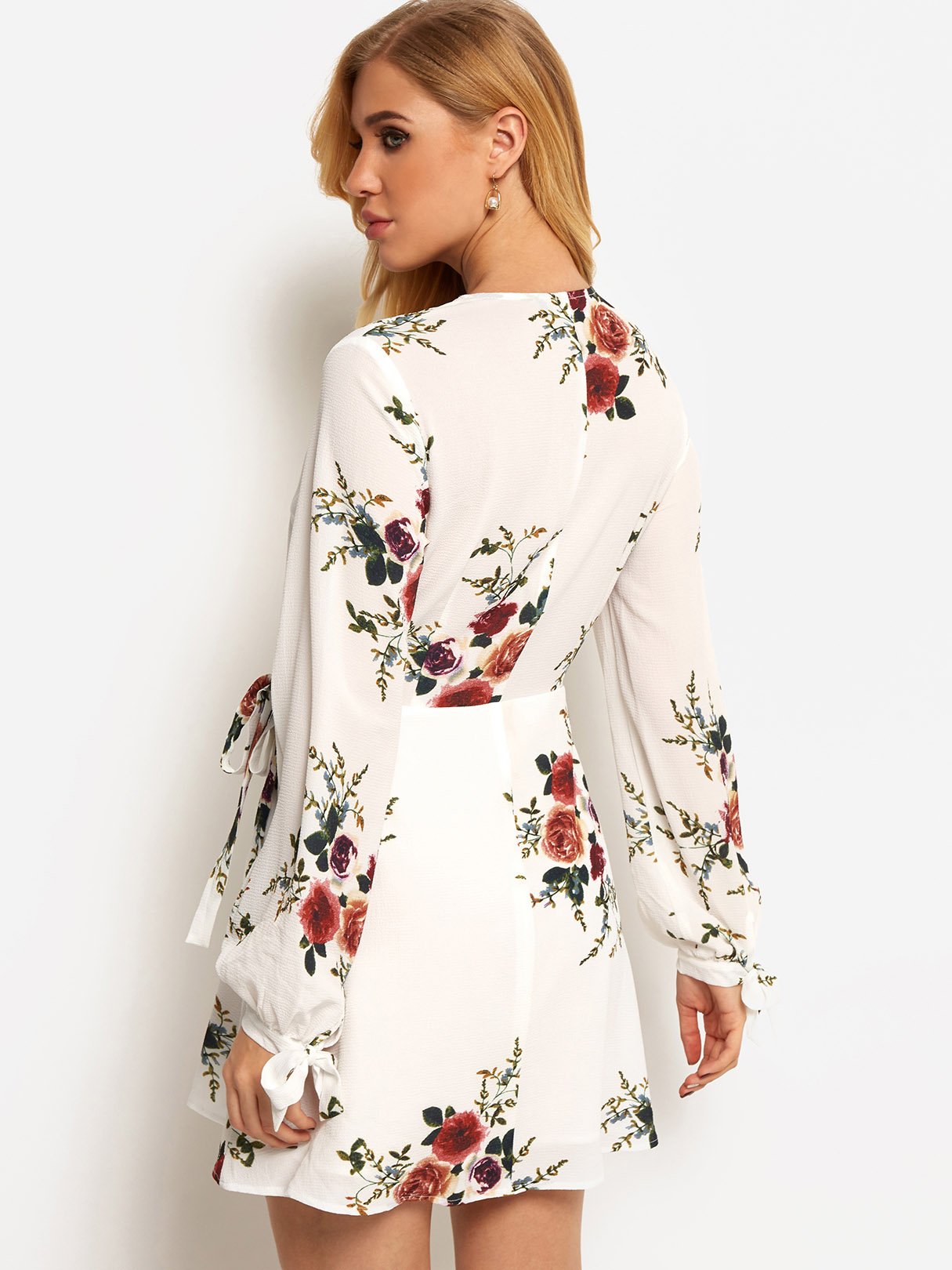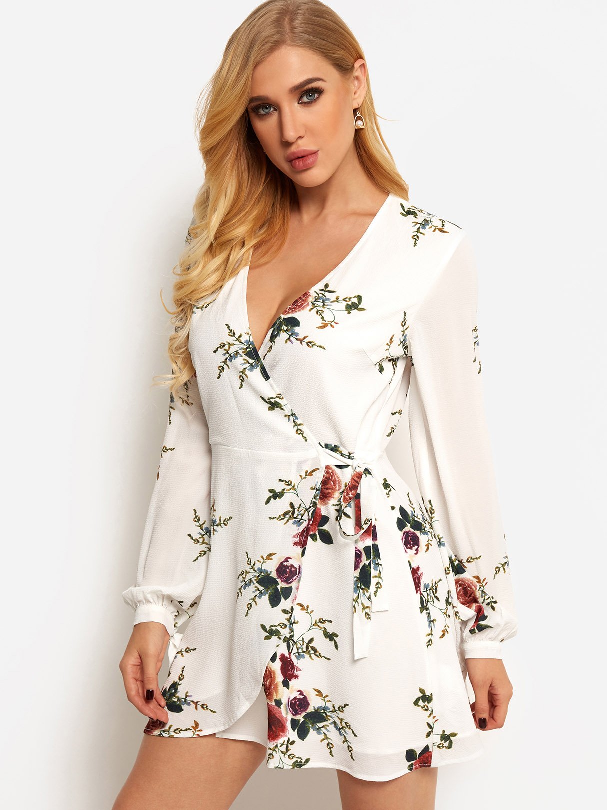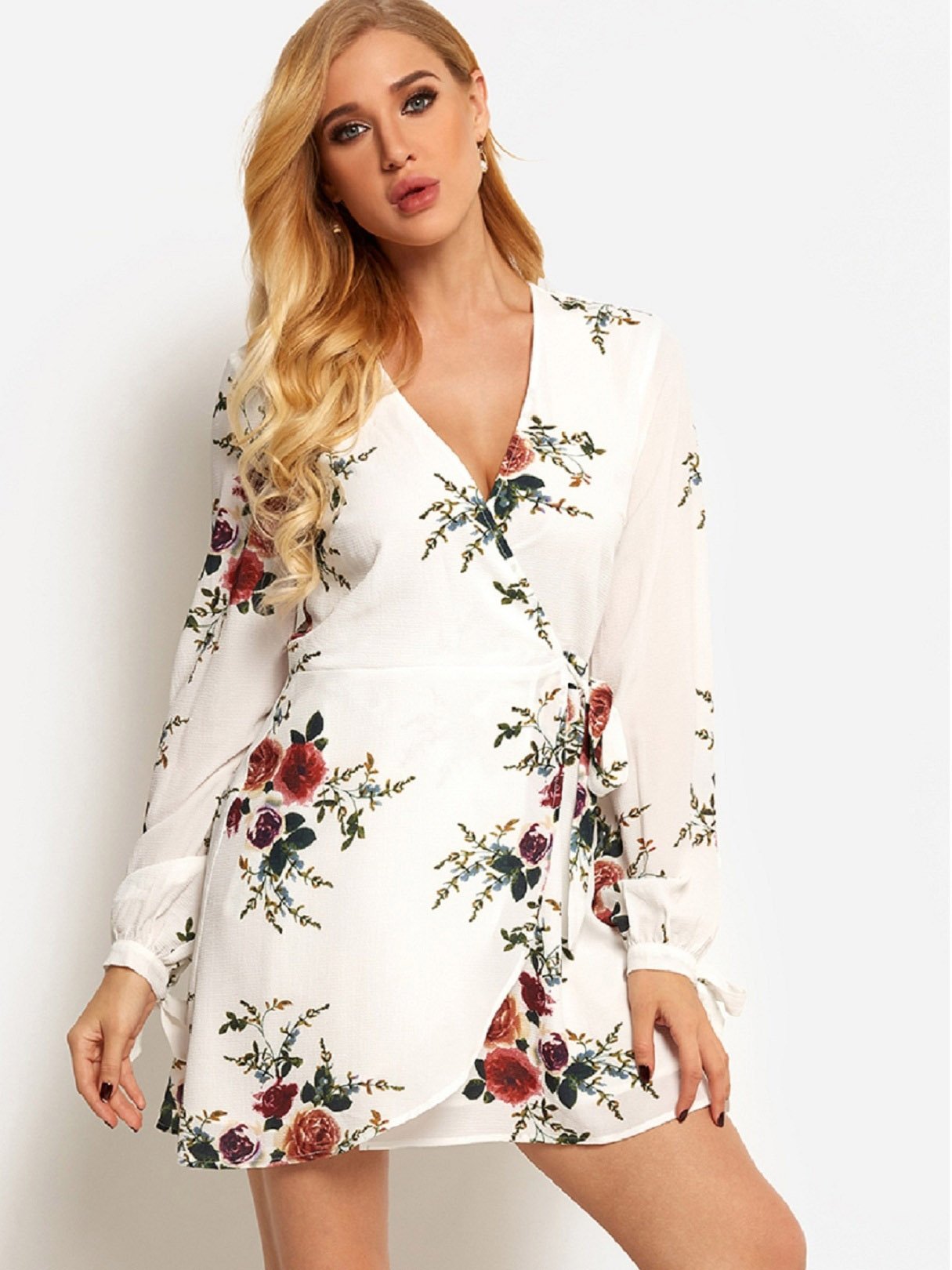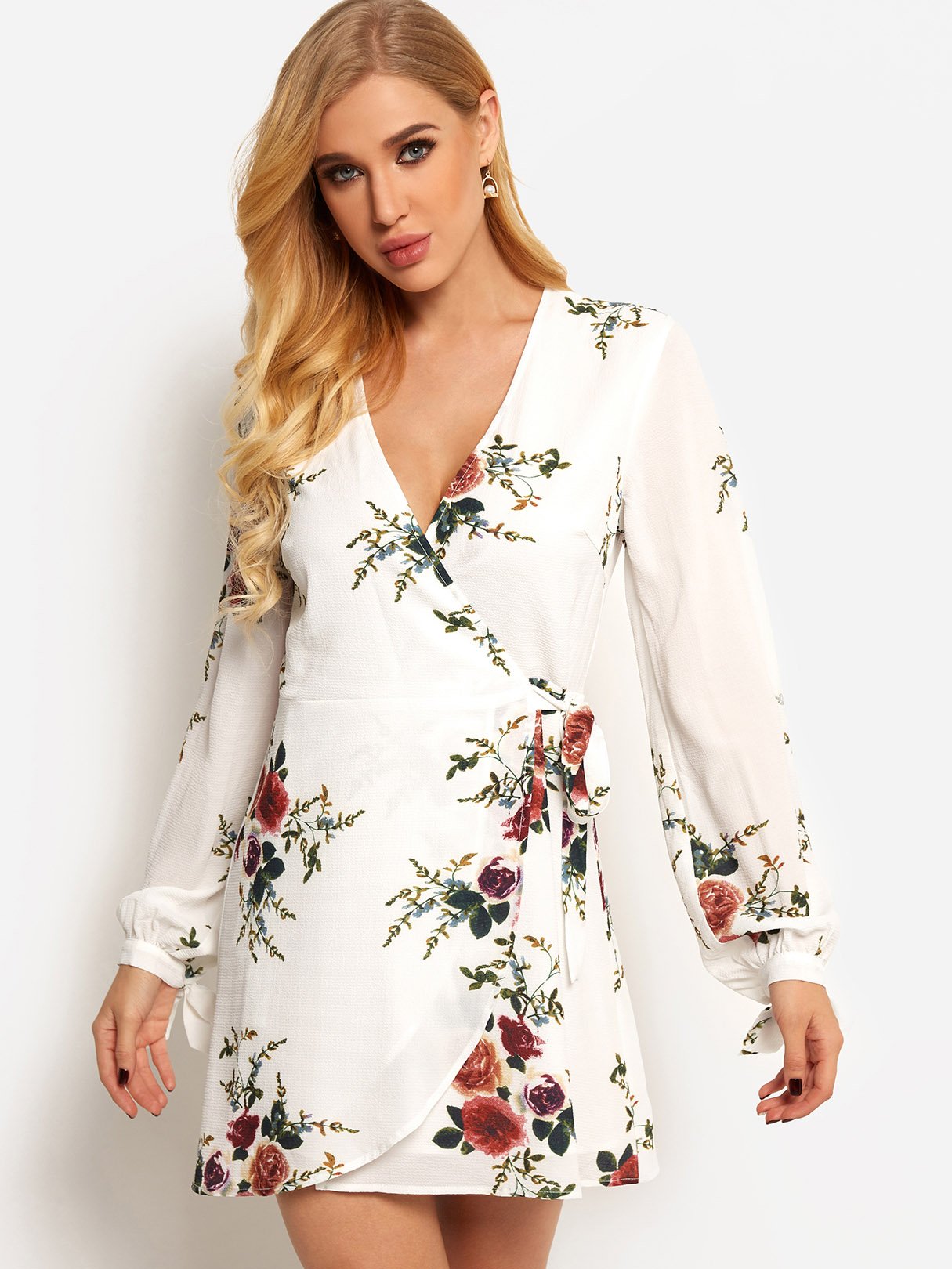 Material:PolyesterNeckline:V-NeckSeason:Summer,AutumnSleeves:Long SleevesPattern:Floral PrintStyle:Casual Style,Vacation StyleDetail:Wrap DesignLength:MiniFit:Regular FitSleeves Type:Tie-Up At CuffsOccasion:Vacation