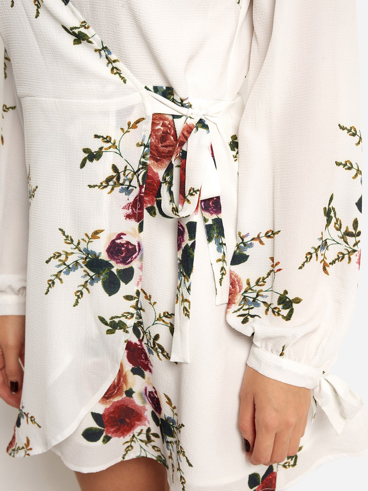 White V-Neck Long Sleeve Floral Print Wrap Dresses - White / S is backordered and will ship as soon as it is back in stock.