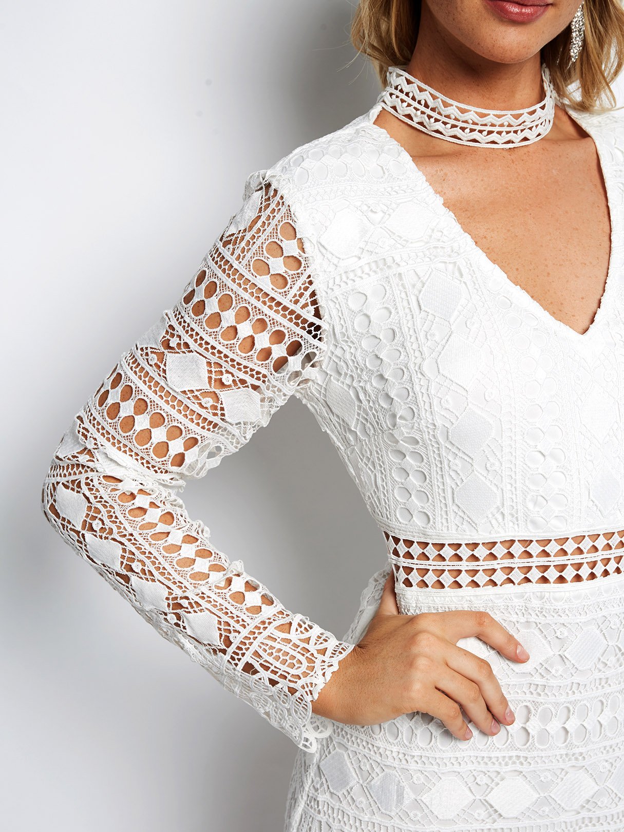 White V-Neck Long Sleeve Lace Zip Back Partially Lined Mini Dress - White / S is backordered and will ship as soon as it is back in stock.