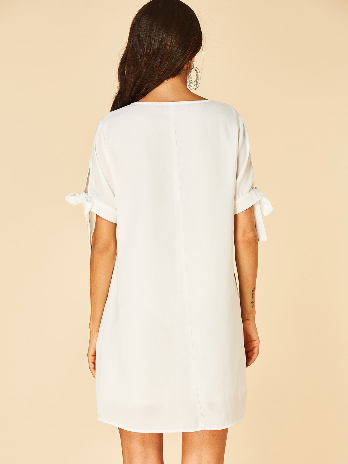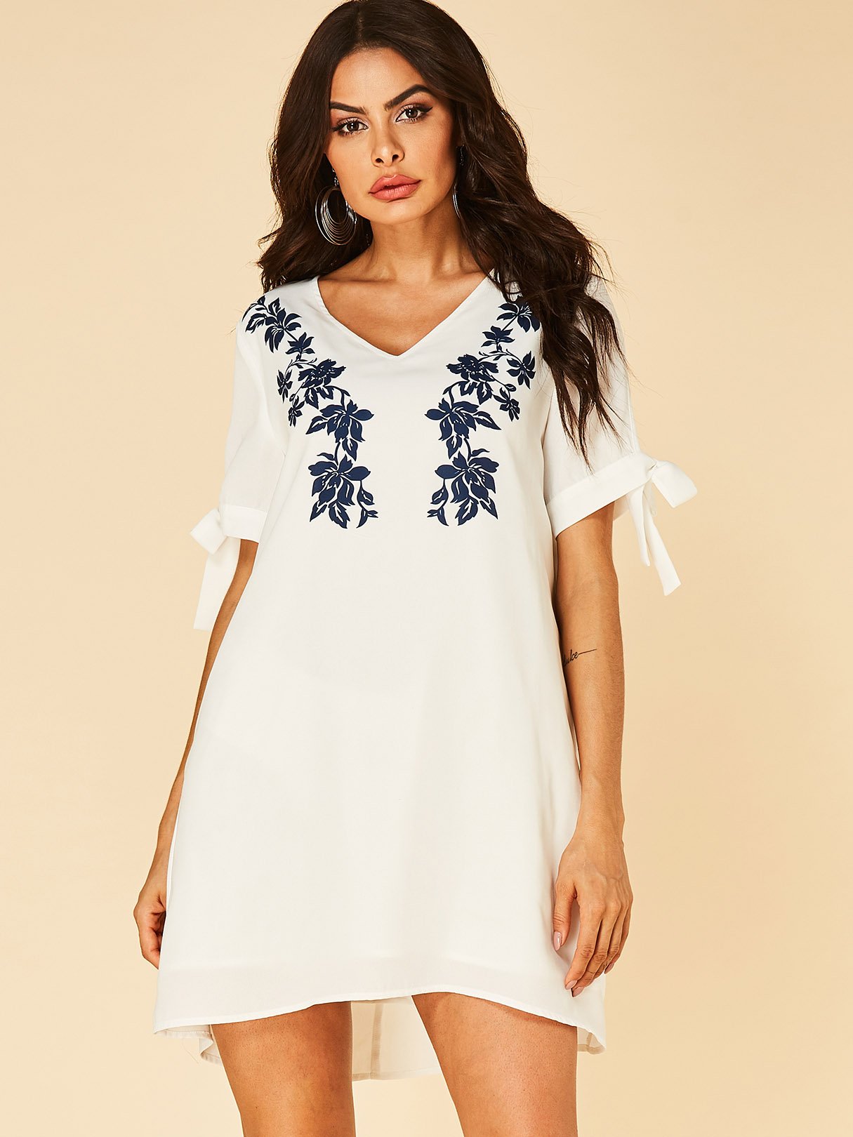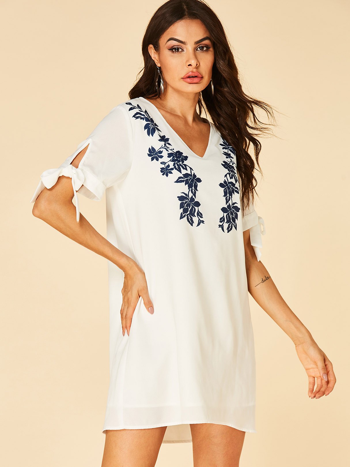 White V-Neck Short Sleeve Floral Print Self-Tie Dresses