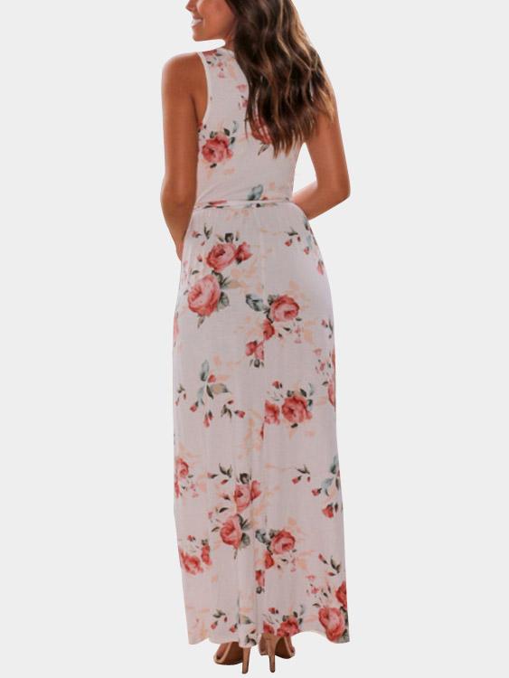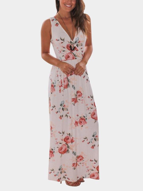 White V-Neck Sleeveless Floral Print Wrap Maxi Dresses - White / S is backordered and will ship as soon as it is back in stock.