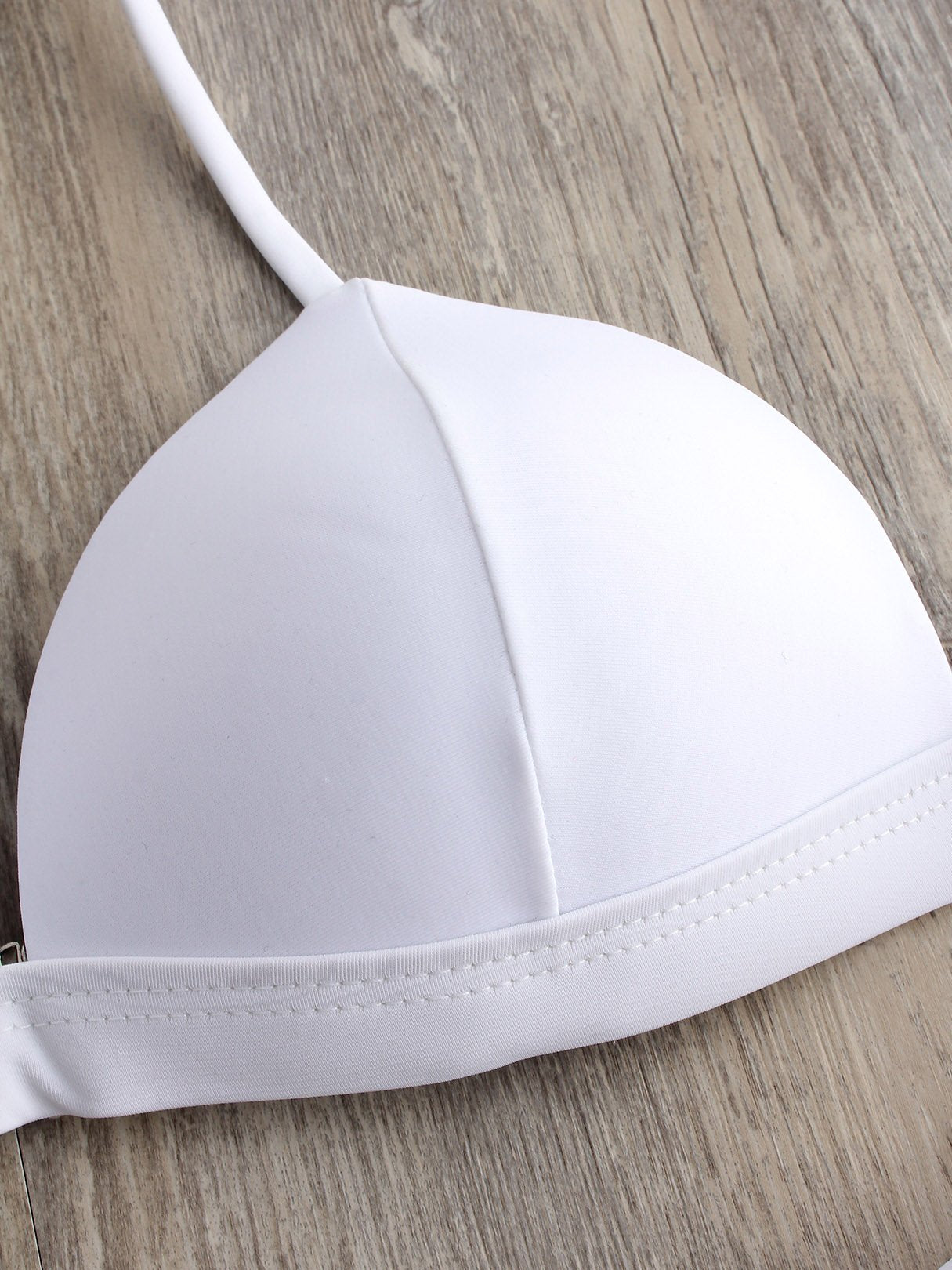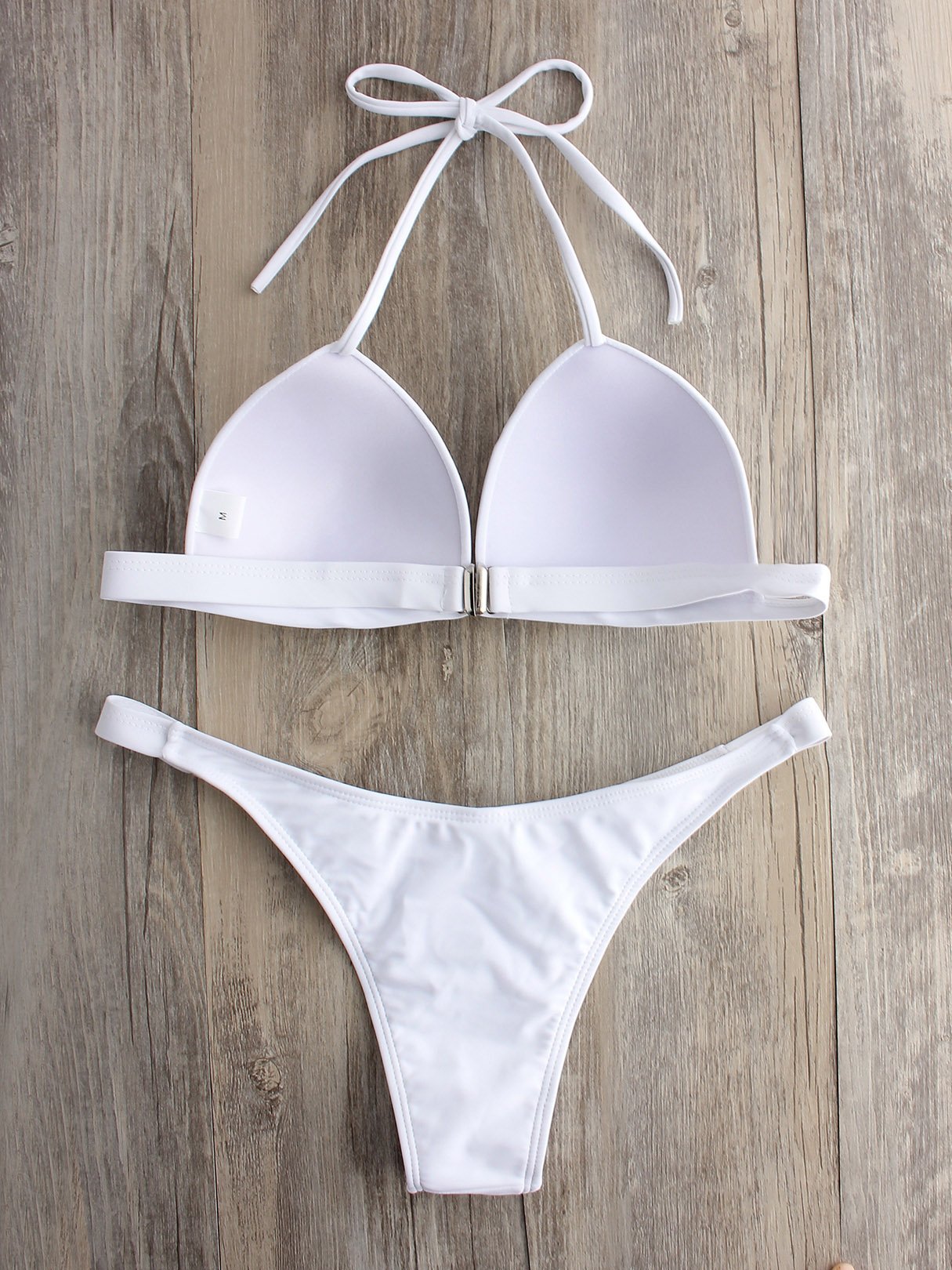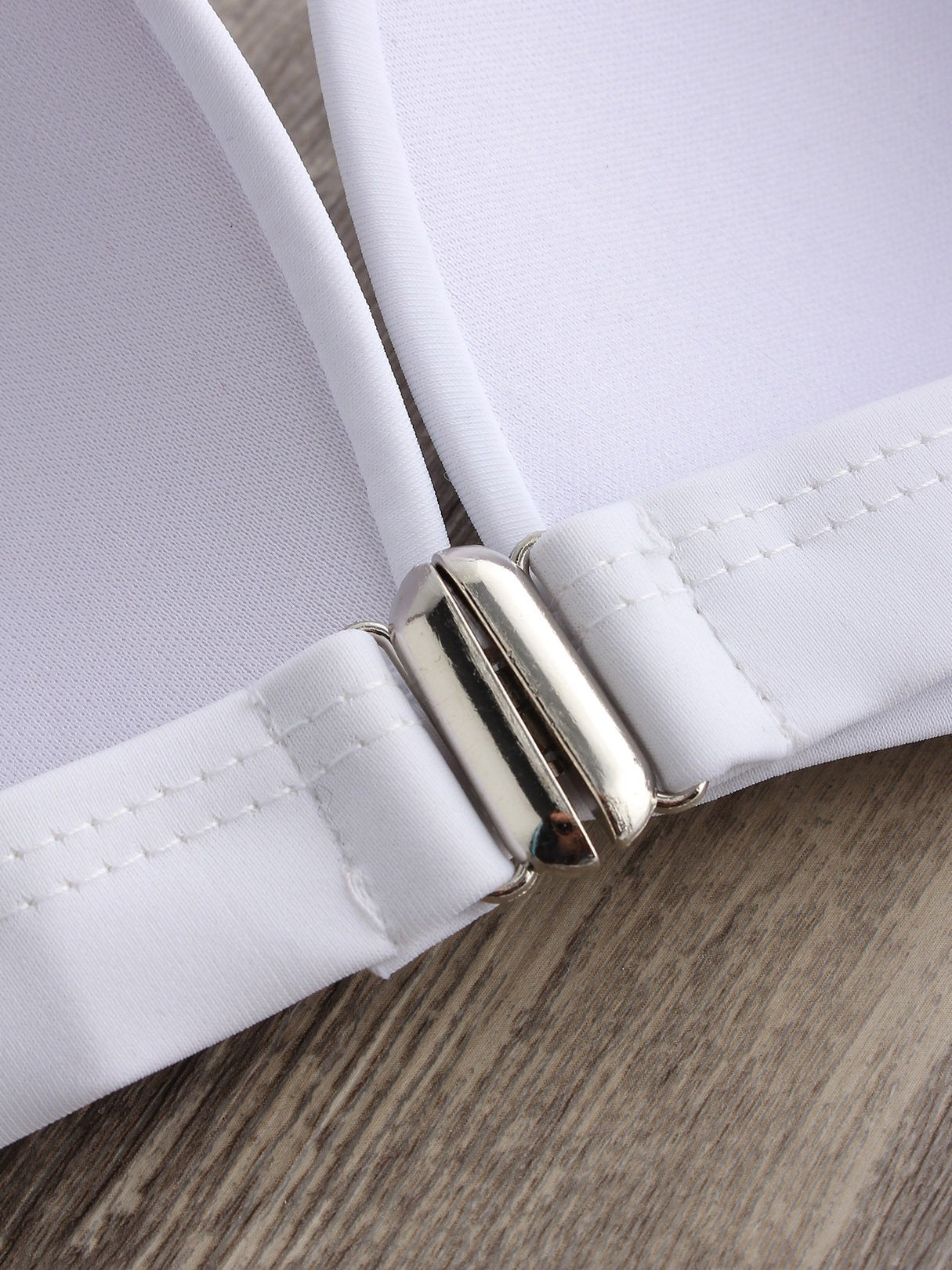 White V-Neck Sleeveless Plain Bikini Swimsuit