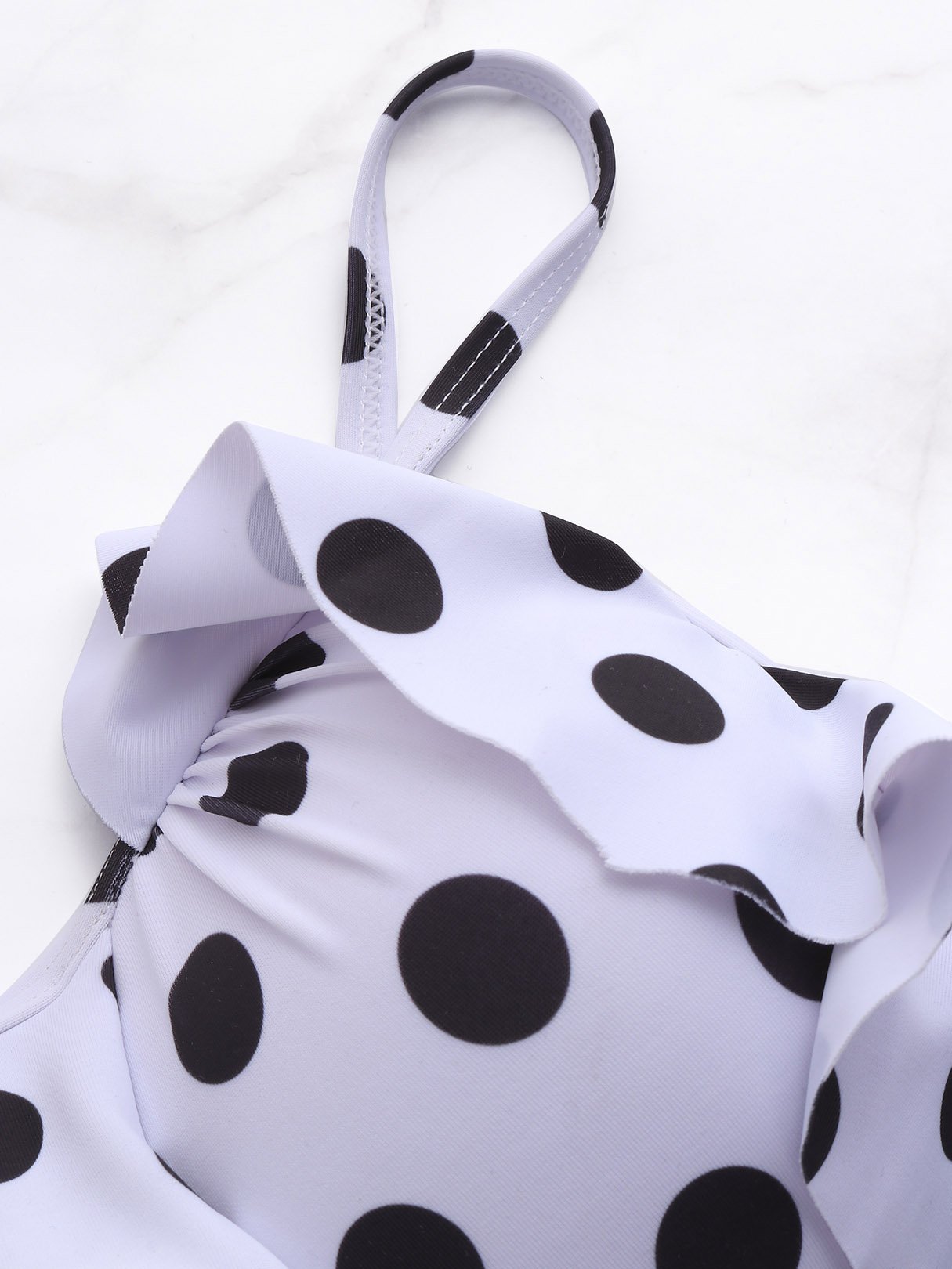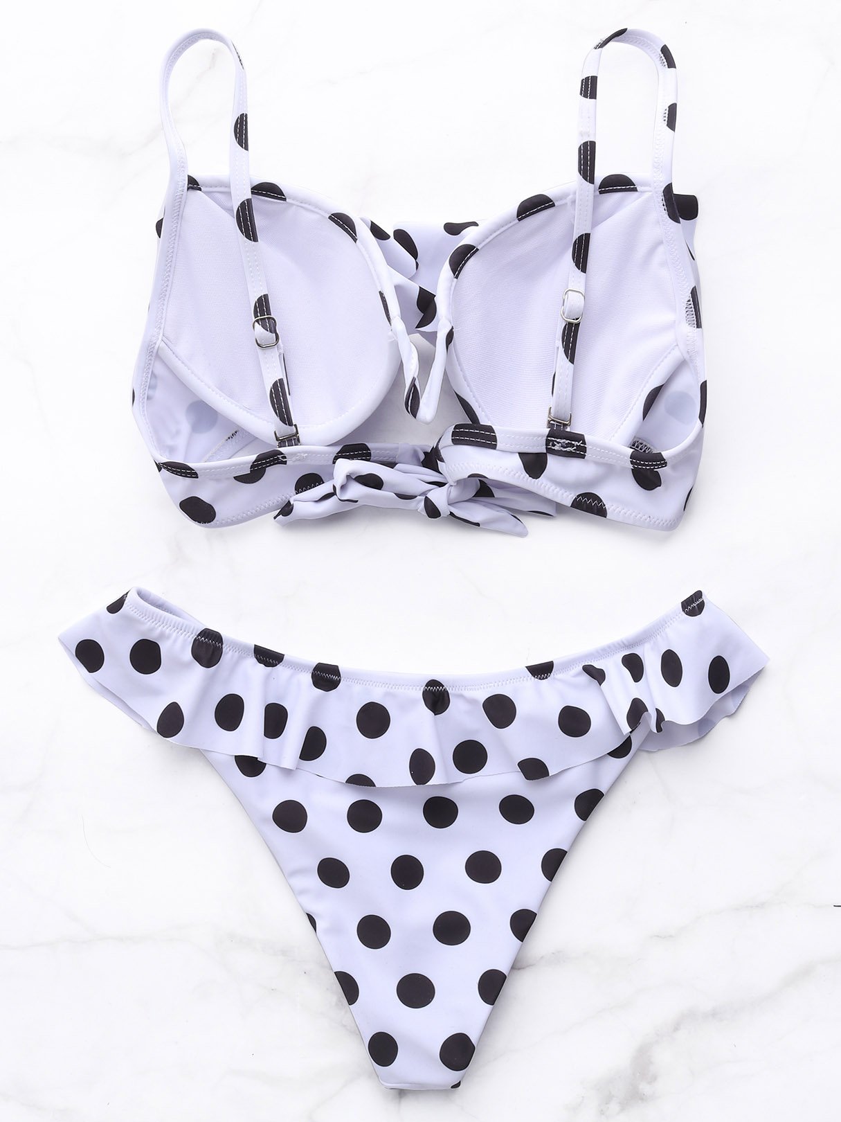 White V-Neck Sleeveless Polka Dot Tie-Up Ruffle Hem Two Piece Bikinis