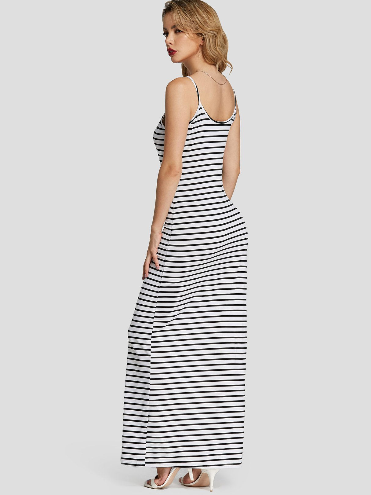White V-Neck Sleeveless Stripe Backless Spaghetti Strap Slit Hem Dresses
