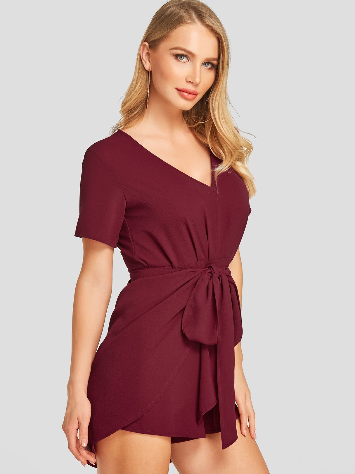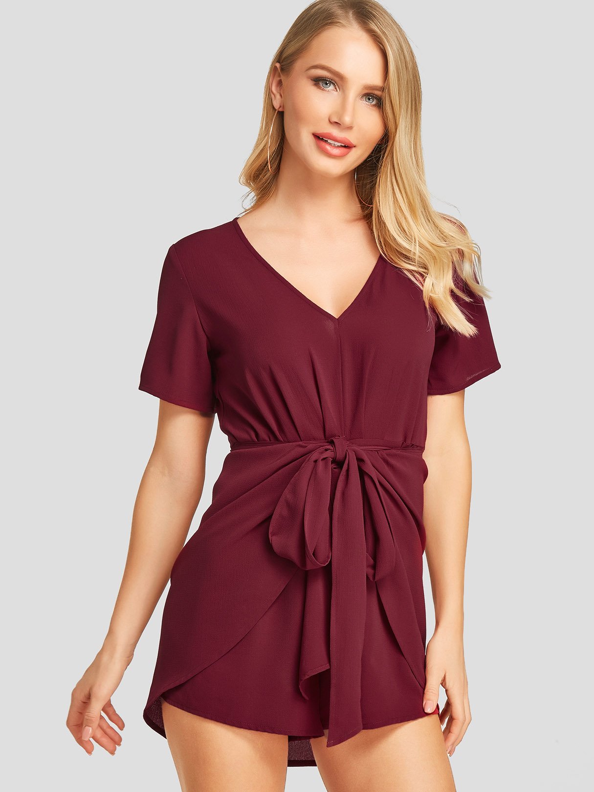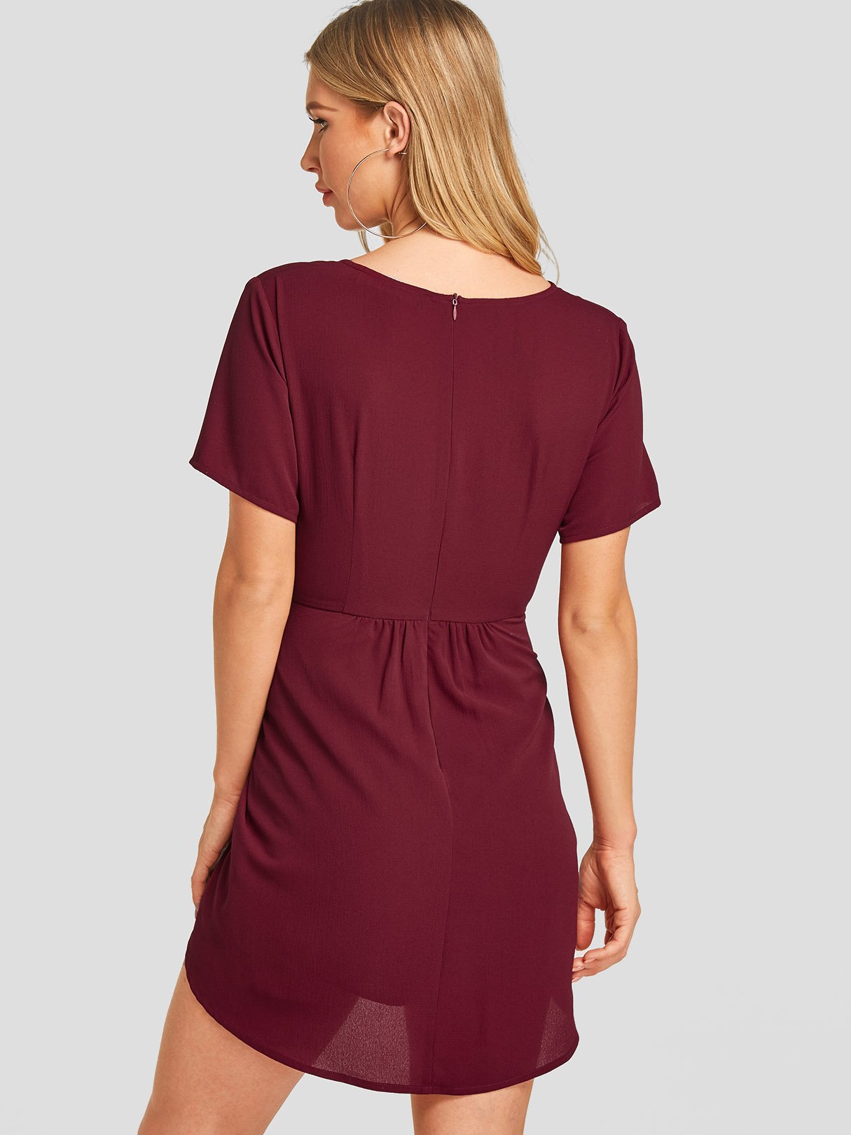 Wine Red Short Sleeve Plain Zip Back Self-Tie Irregular Hem Mini Dresses