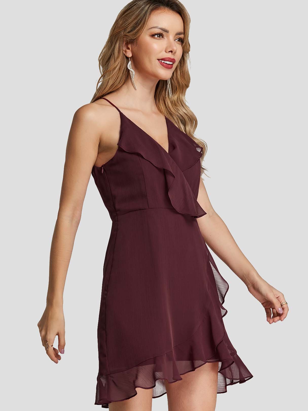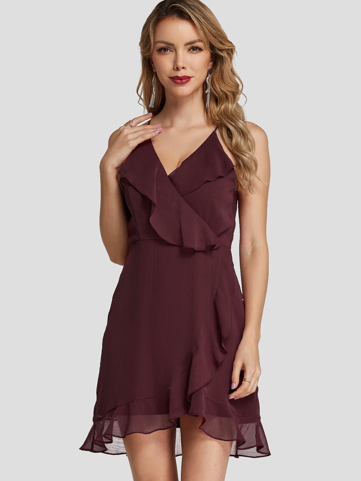 Wine Red V-Neck Sleeveless Plain Spaghetti Strap Wrap Flounced Hem Mini Dresses - Wine Red / S is backordered and will ship as soon as it is back in stock.