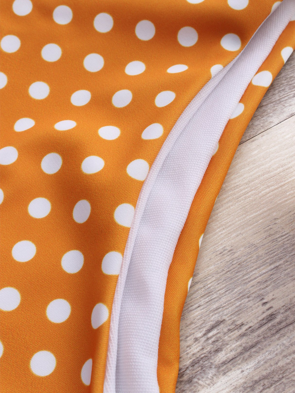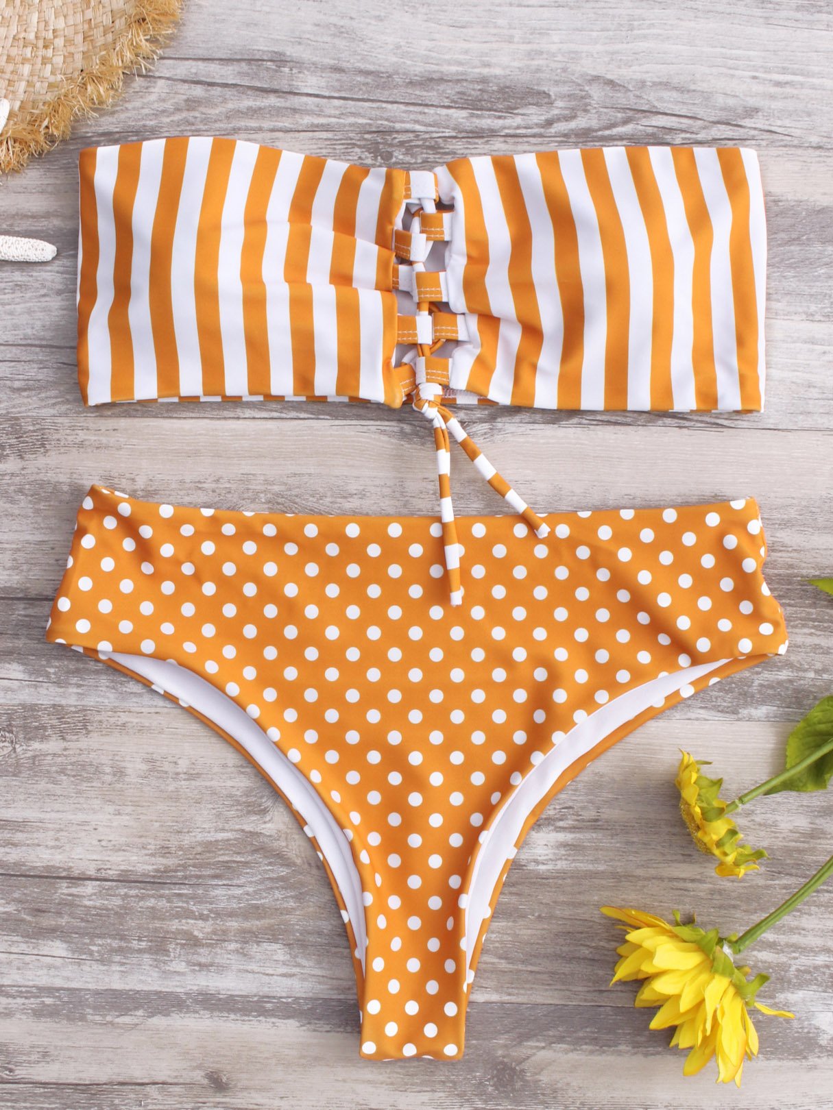 Yellow Bateau Sleeveless Stripe Polka Dot Backless Lace-Up Bikini Suits