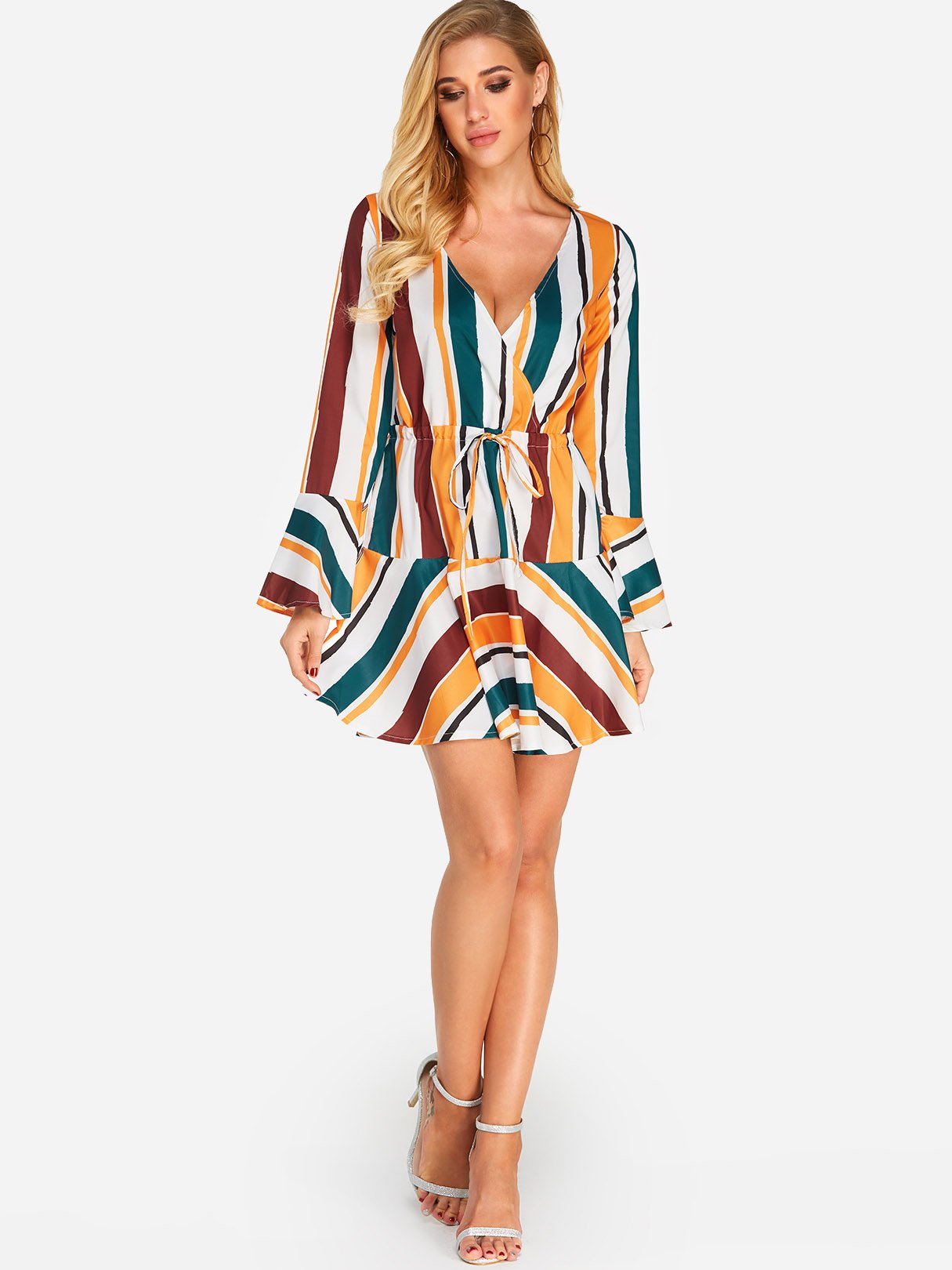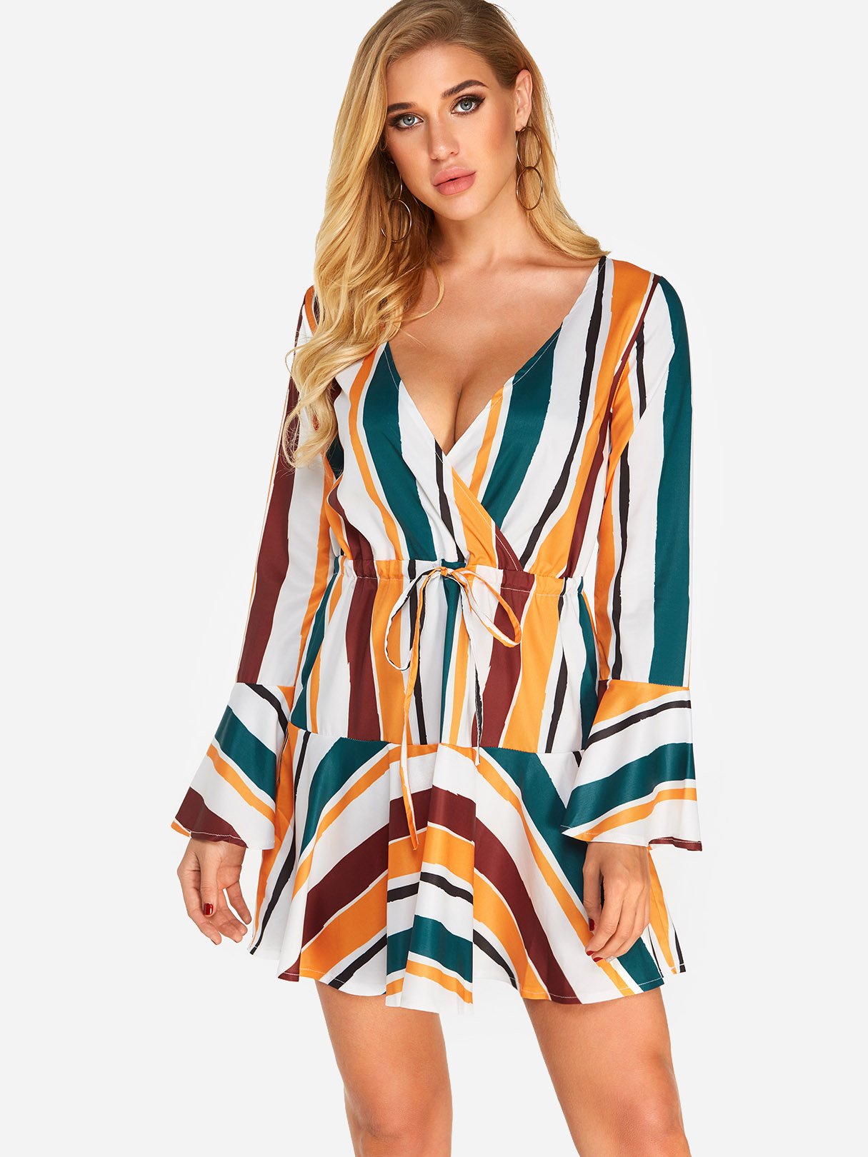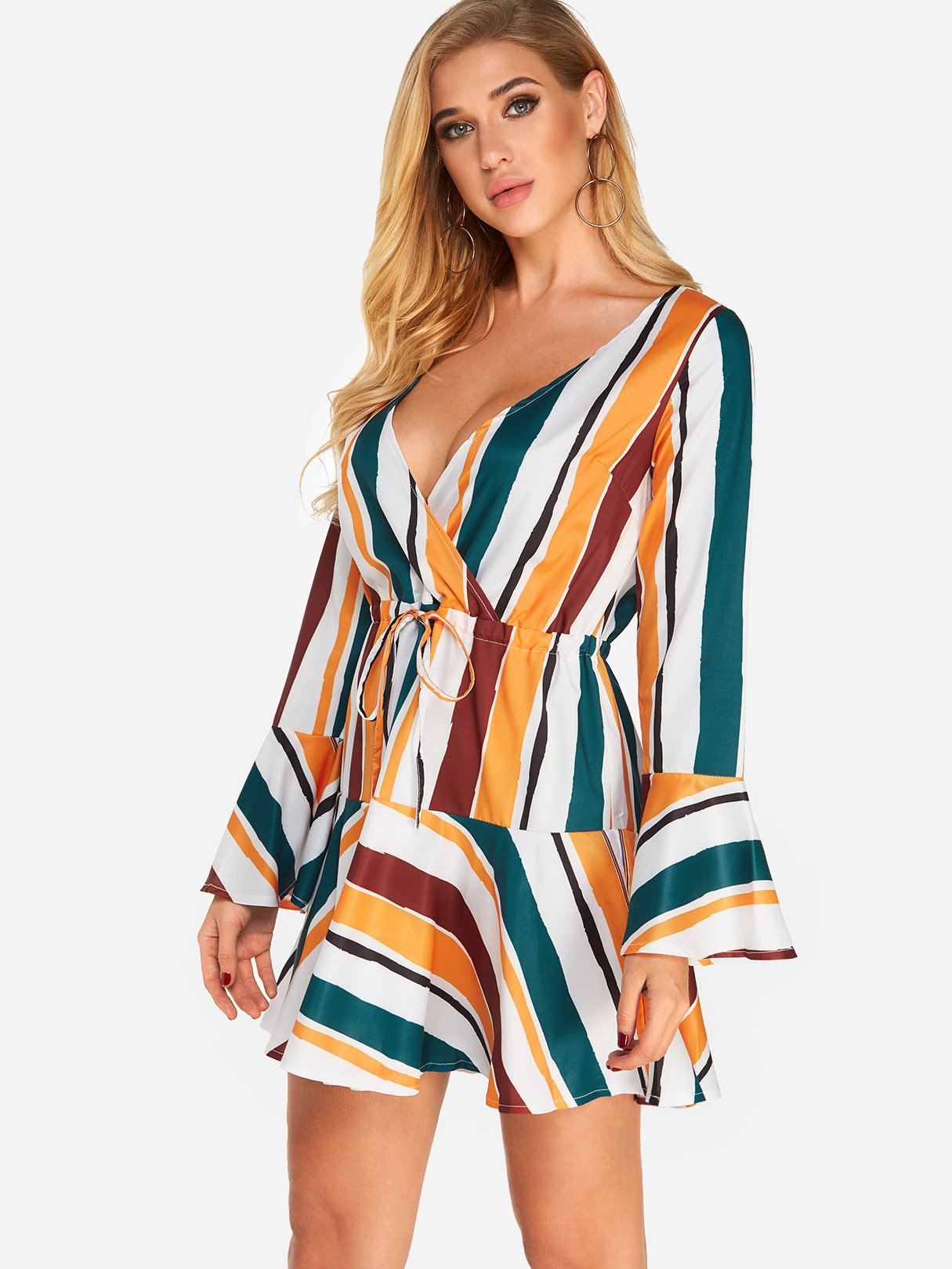 Yellow Deep V Neck Long Sleeve Stripe Floral Print Self-Tie Flounced Hem Dresses