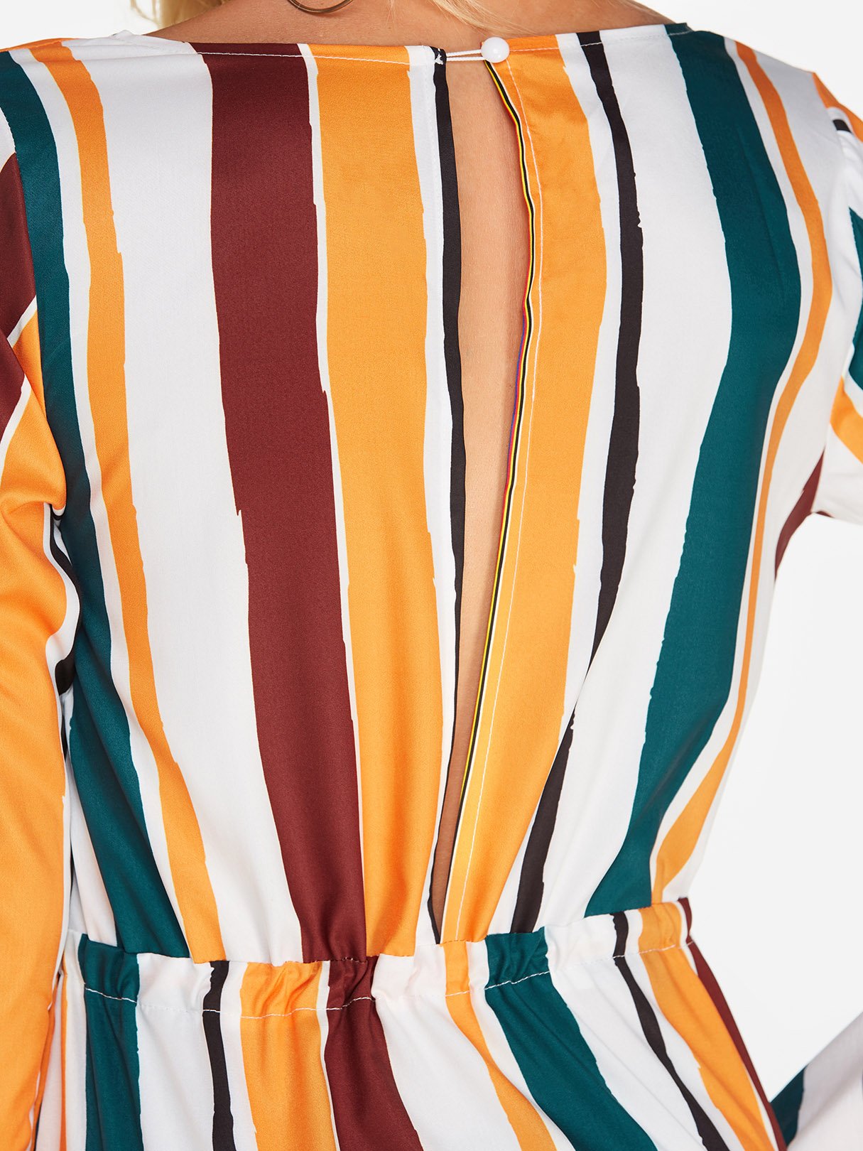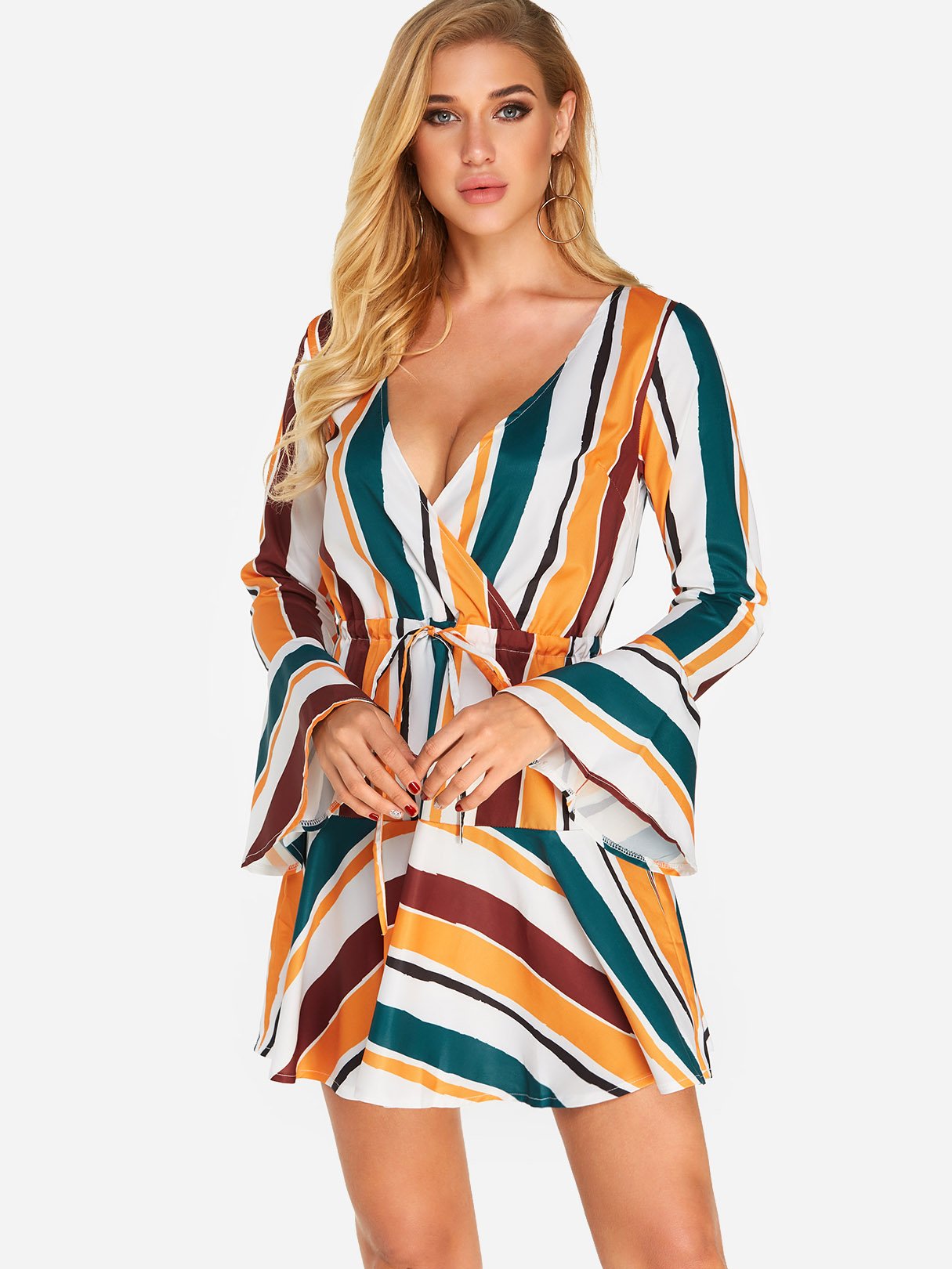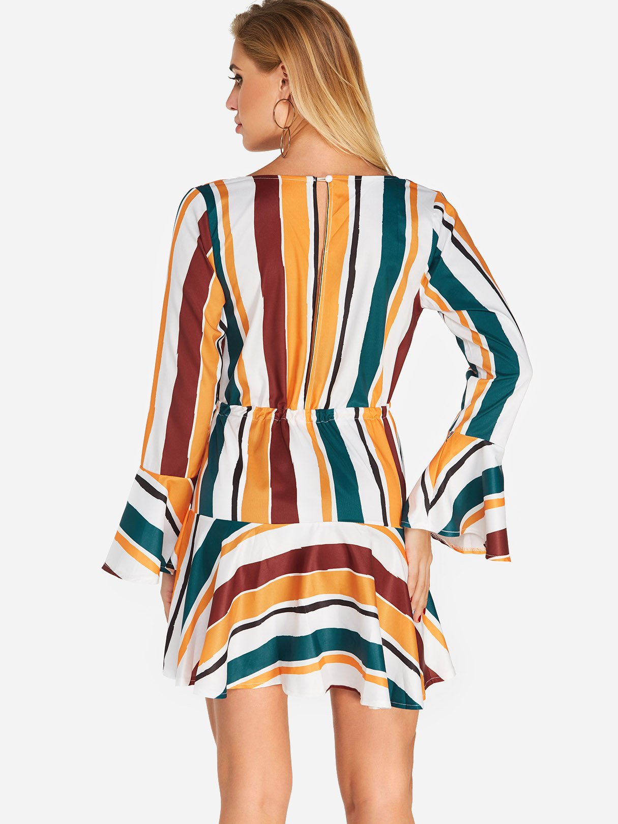 Yellow Deep V Neck Long Sleeve Stripe Floral Print Self-Tie Flounced Hem Dresses