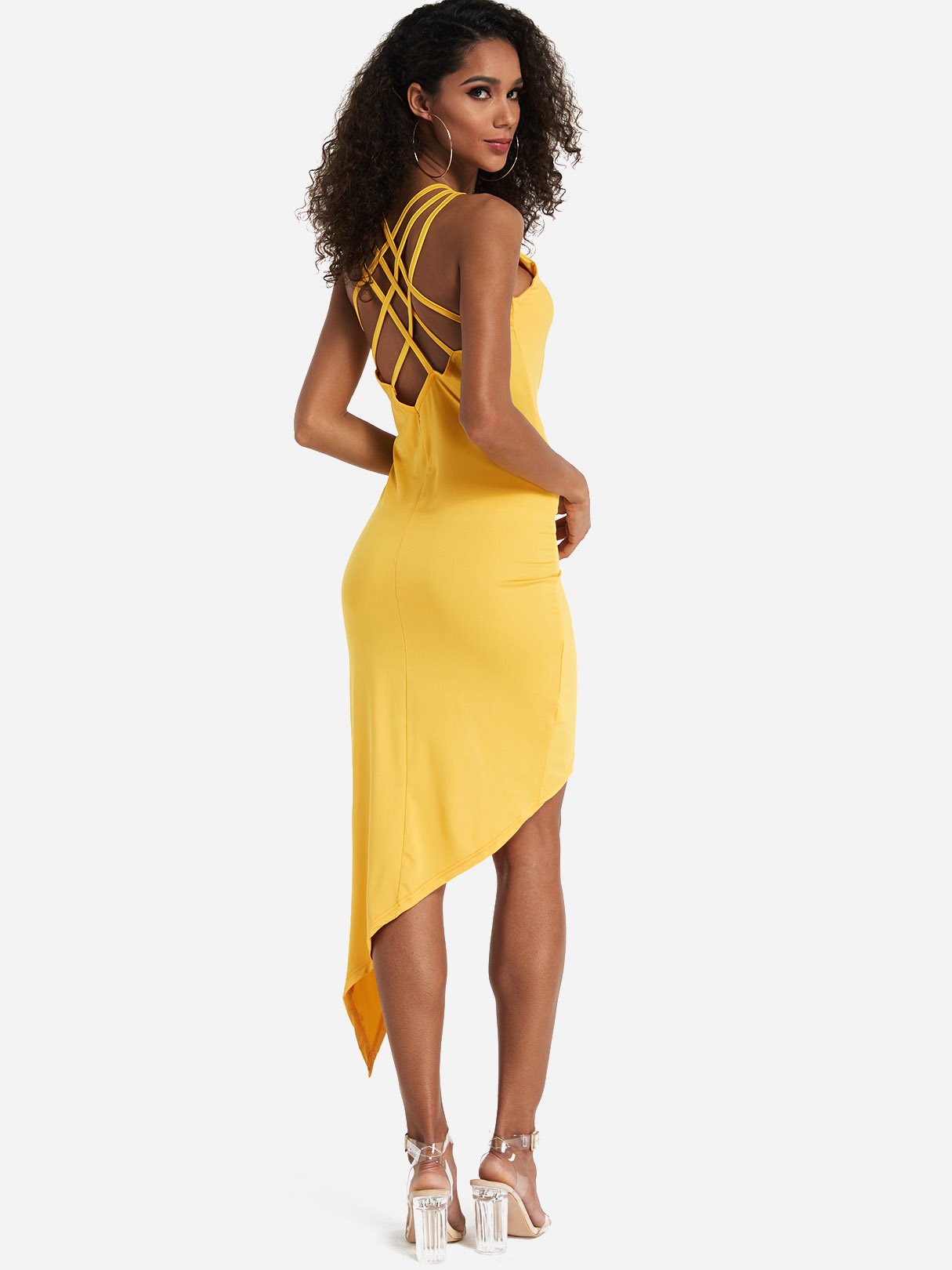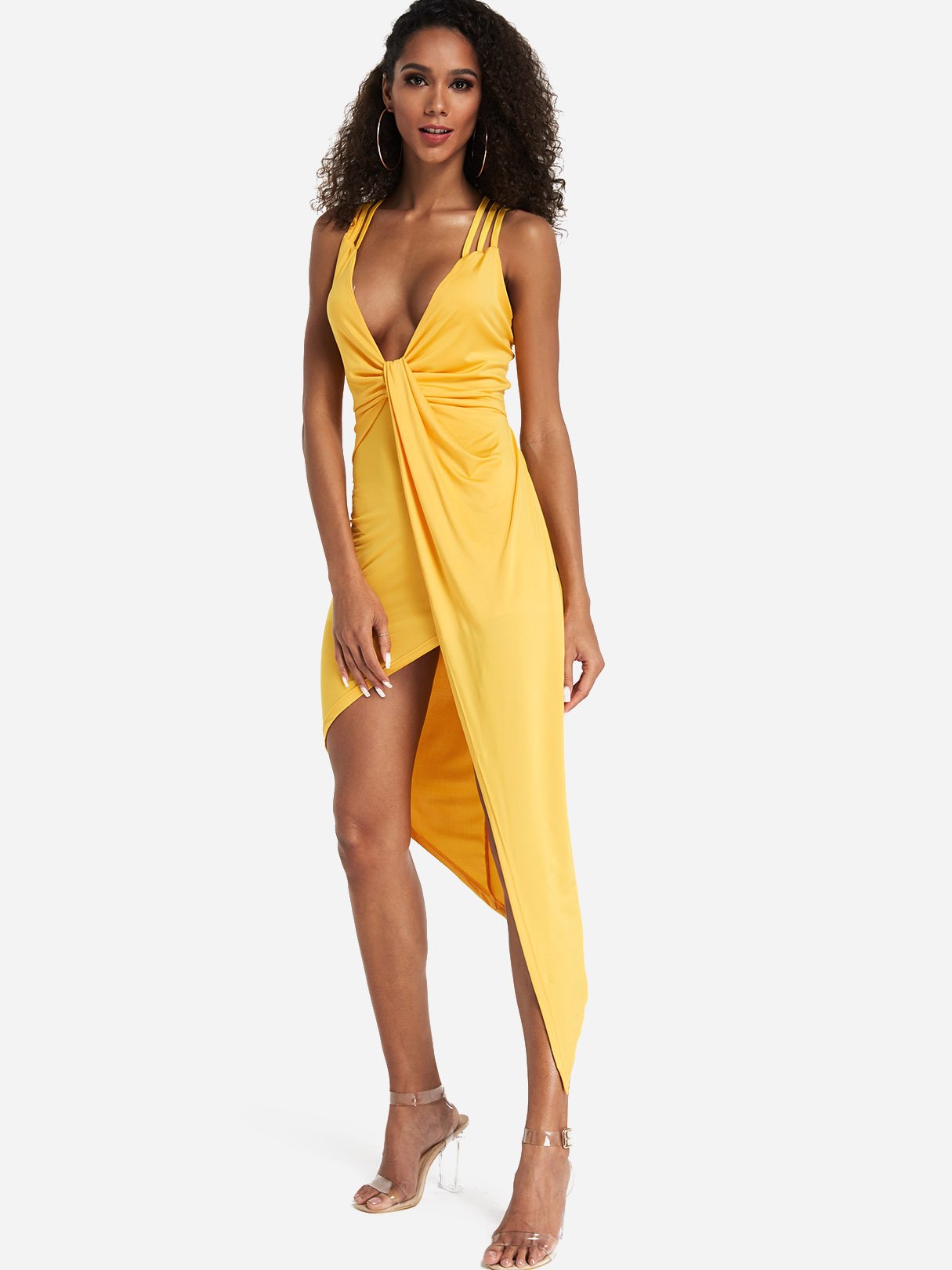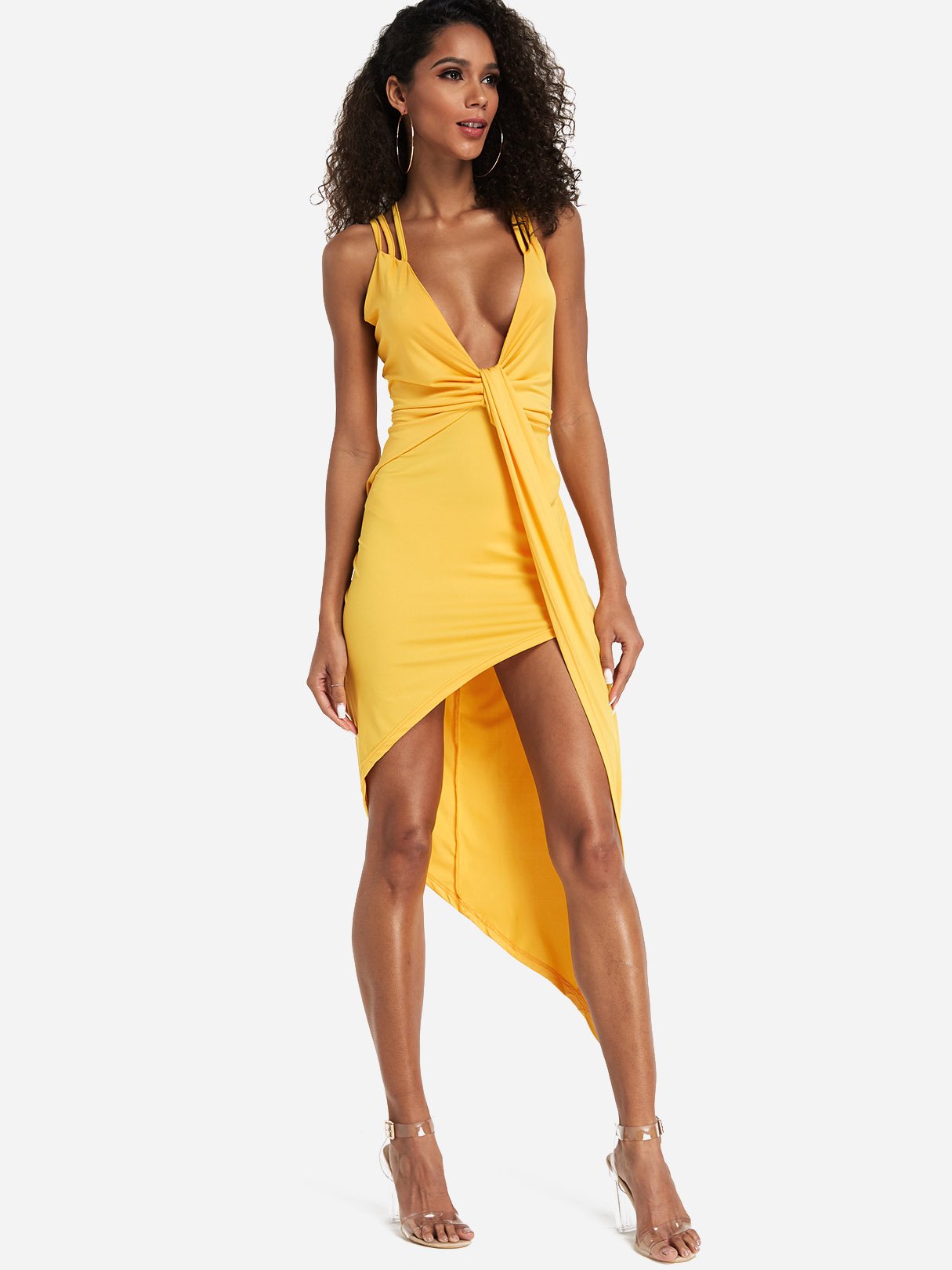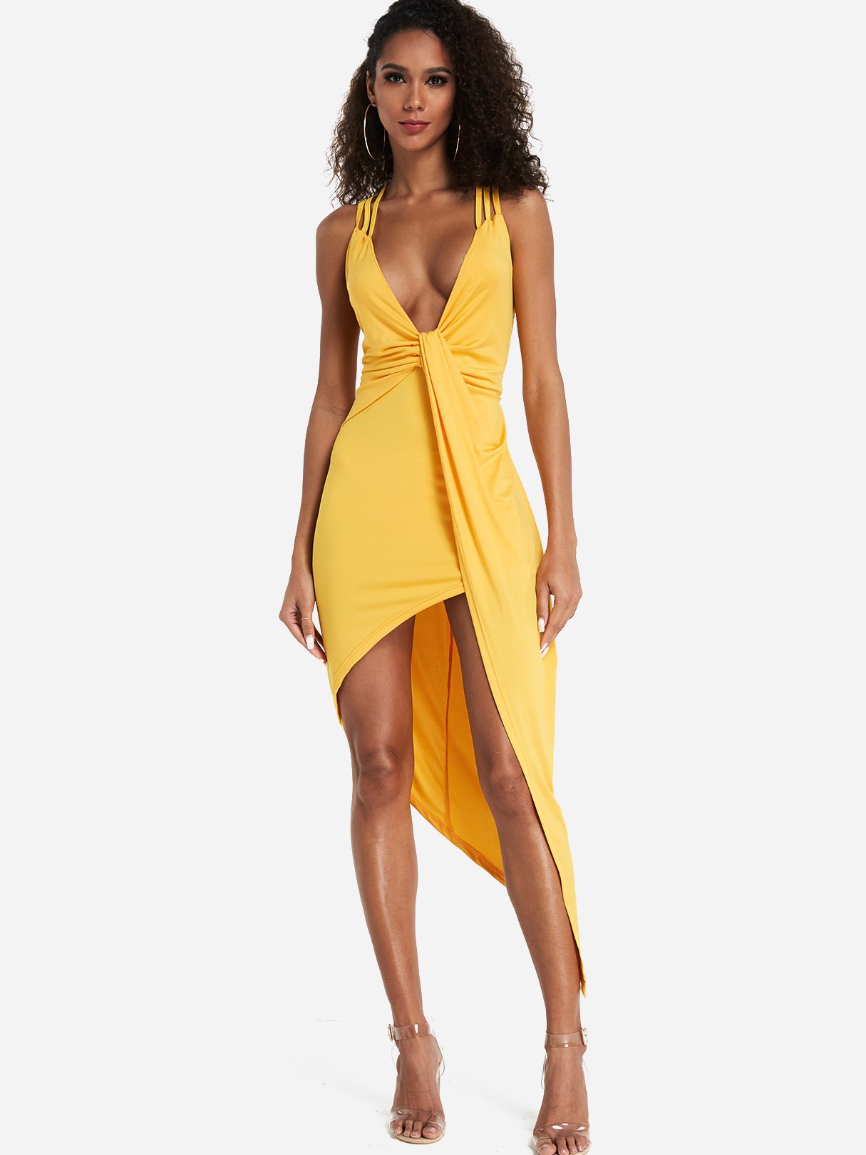 Yellow Deep V Neck Sleeveless Plain Backless Spaghetti Strap Irregular Hem Dresses
