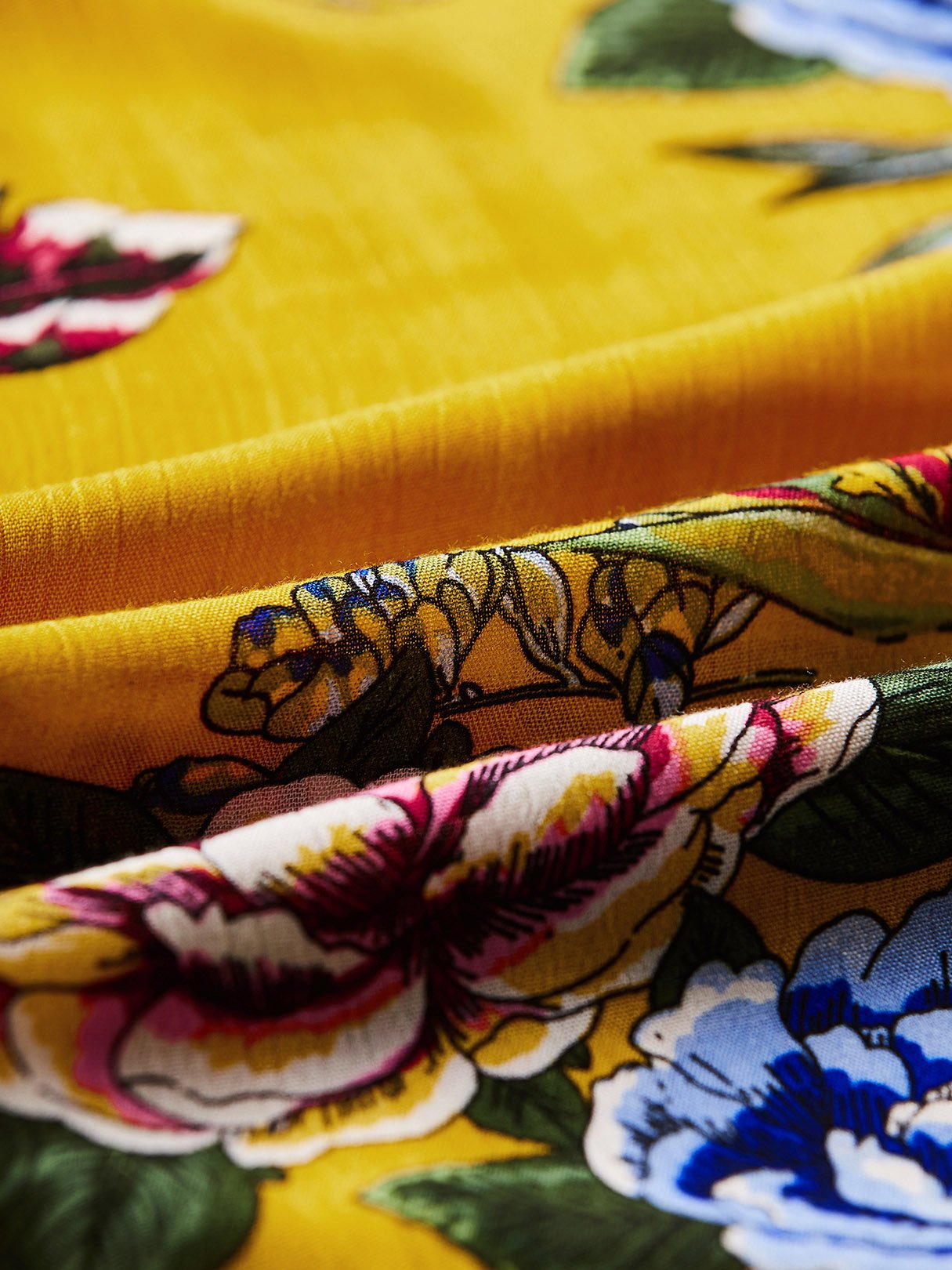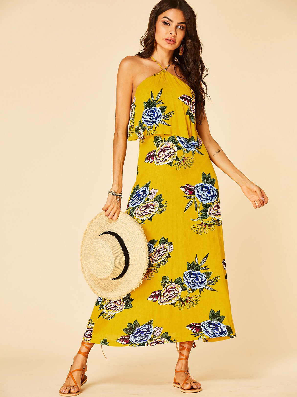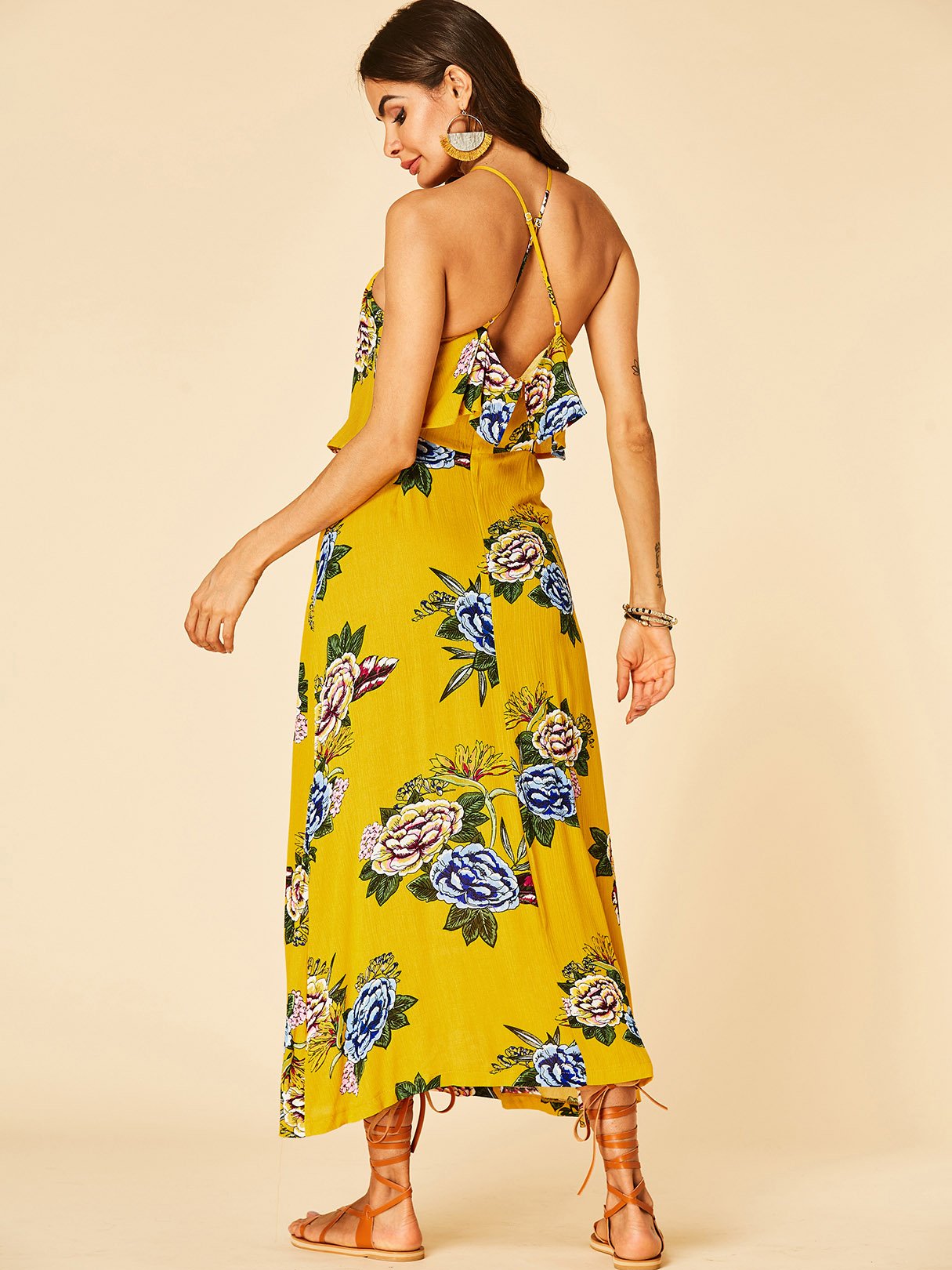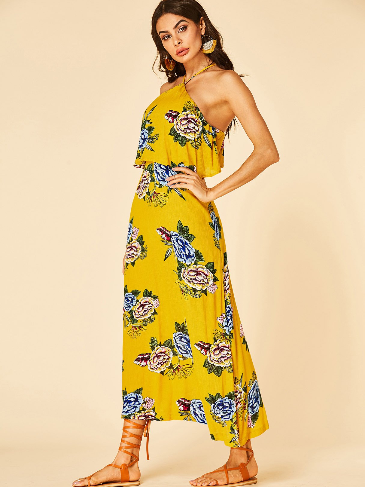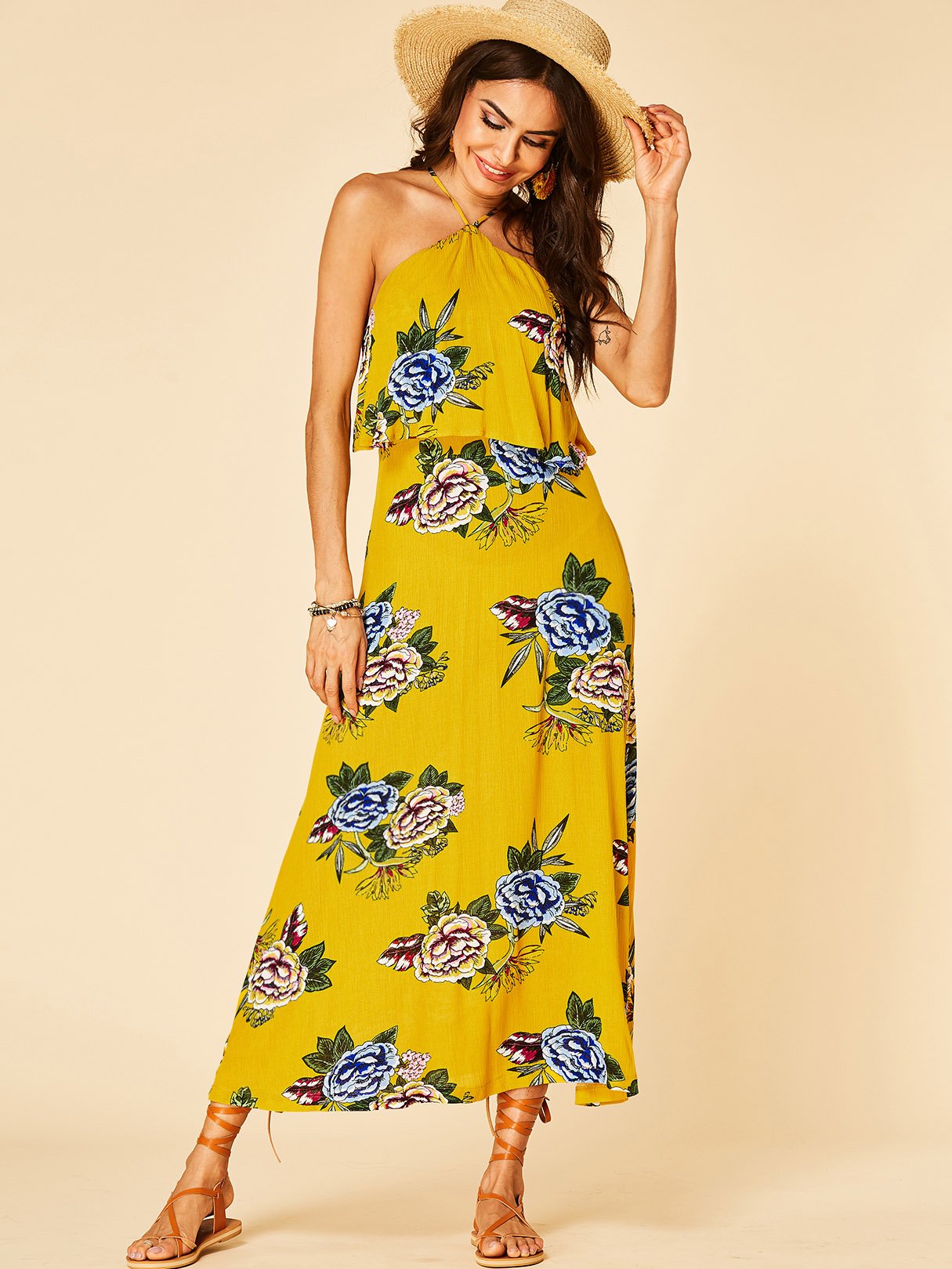 Yellow Halter Sleeveless Floral Print Backless Dresses