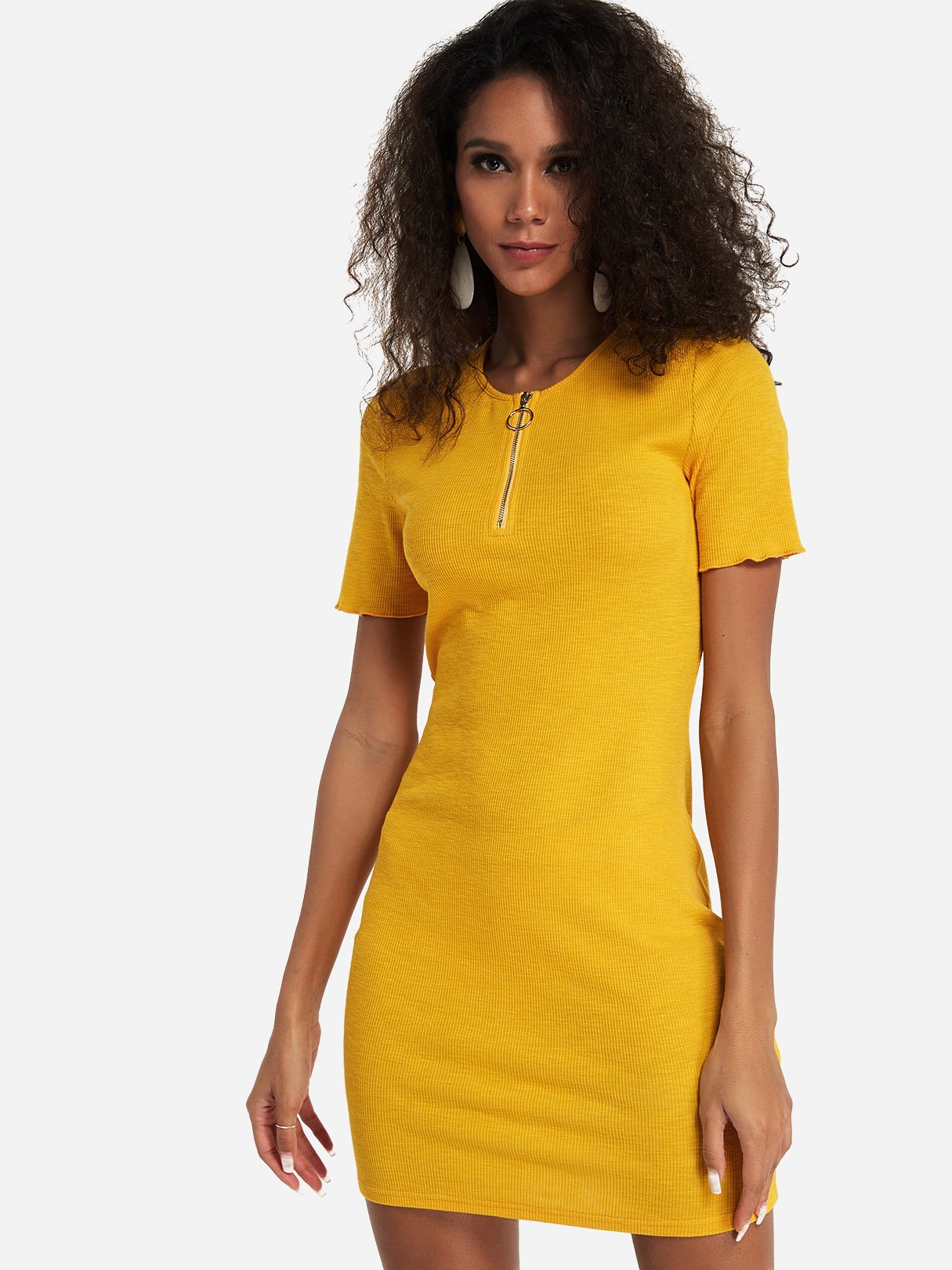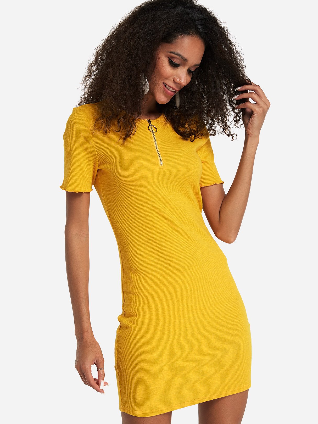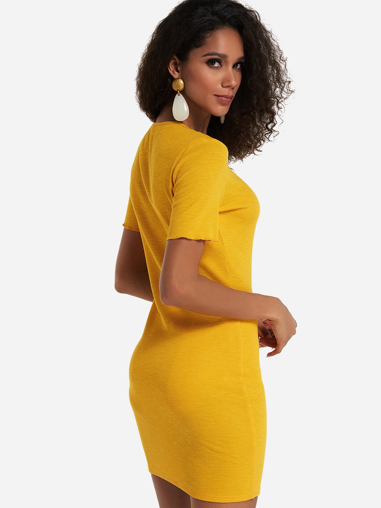 Yellow Round Neck Short Sleeve Plain Bodycon Dresses