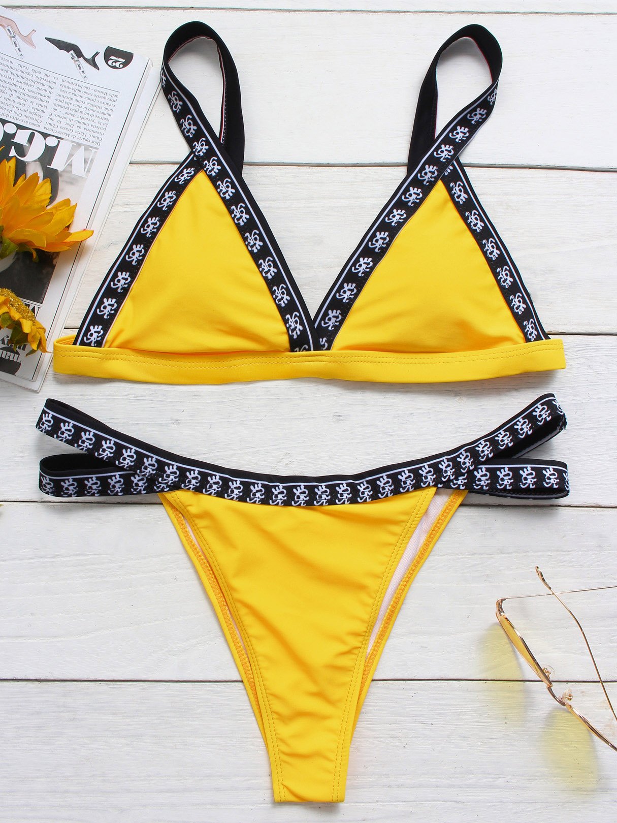Yellow V-Neck Sleeveless Plain Spaghetti Strap Bikini Set