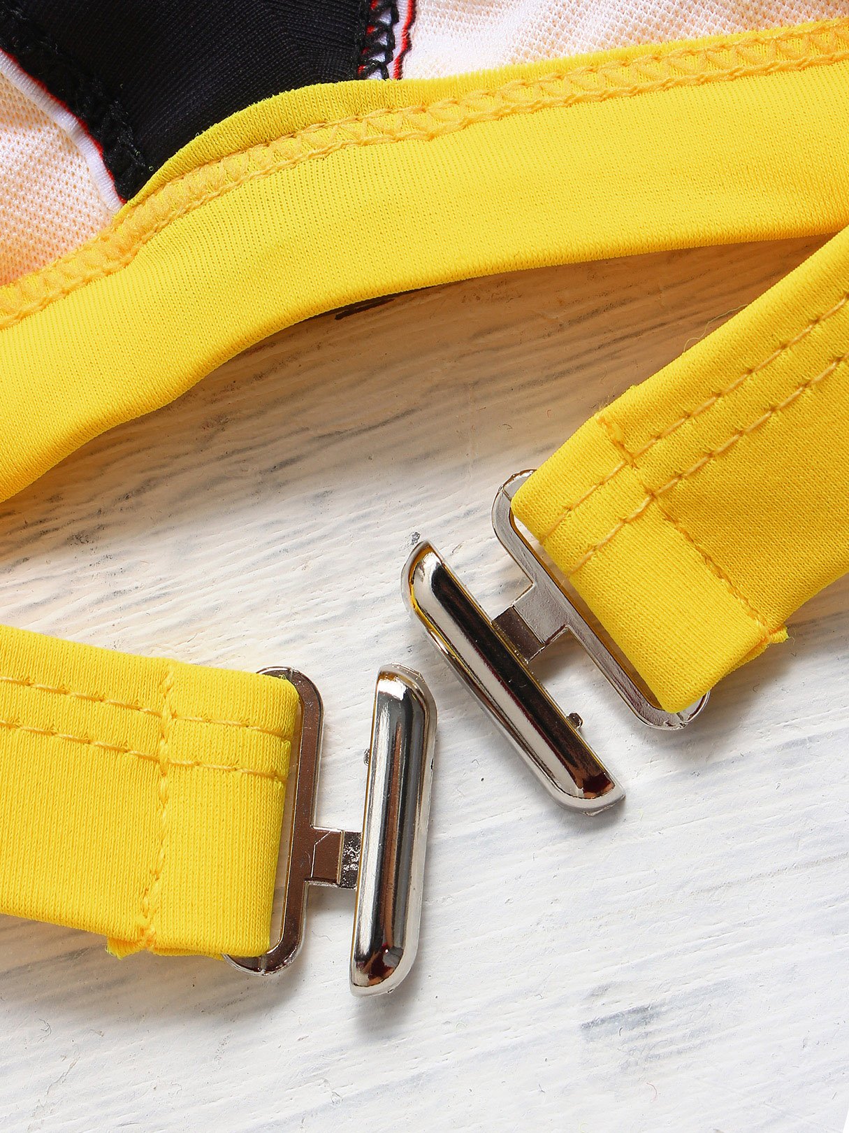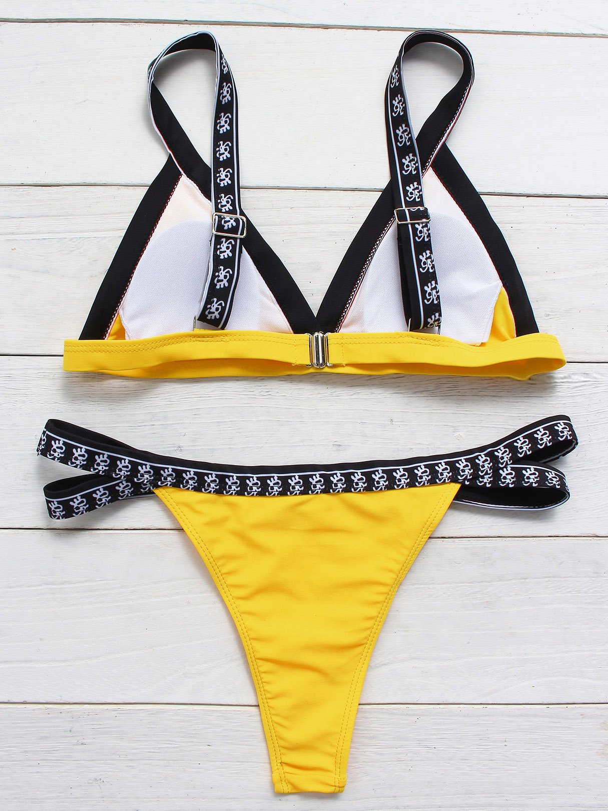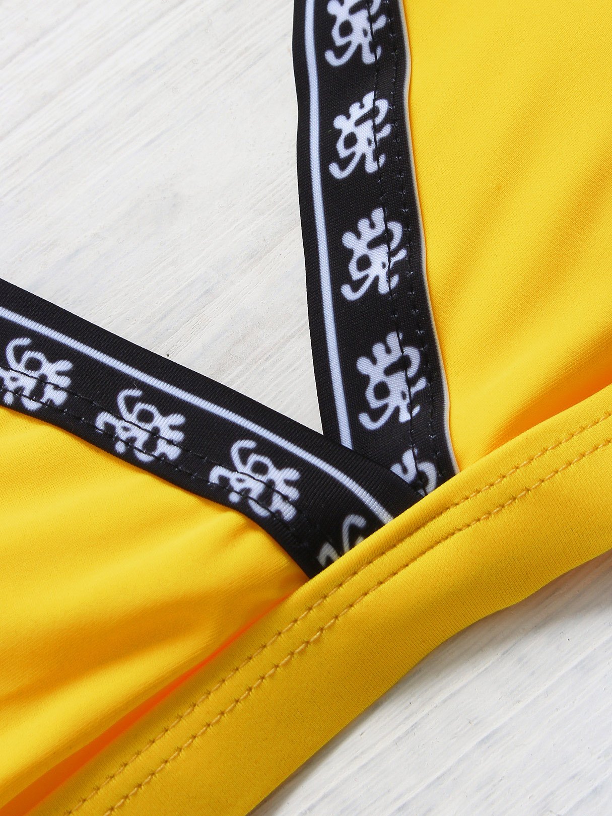 Yellow V-Neck Sleeveless Plain Spaghetti Strap Bikini Swimsuit