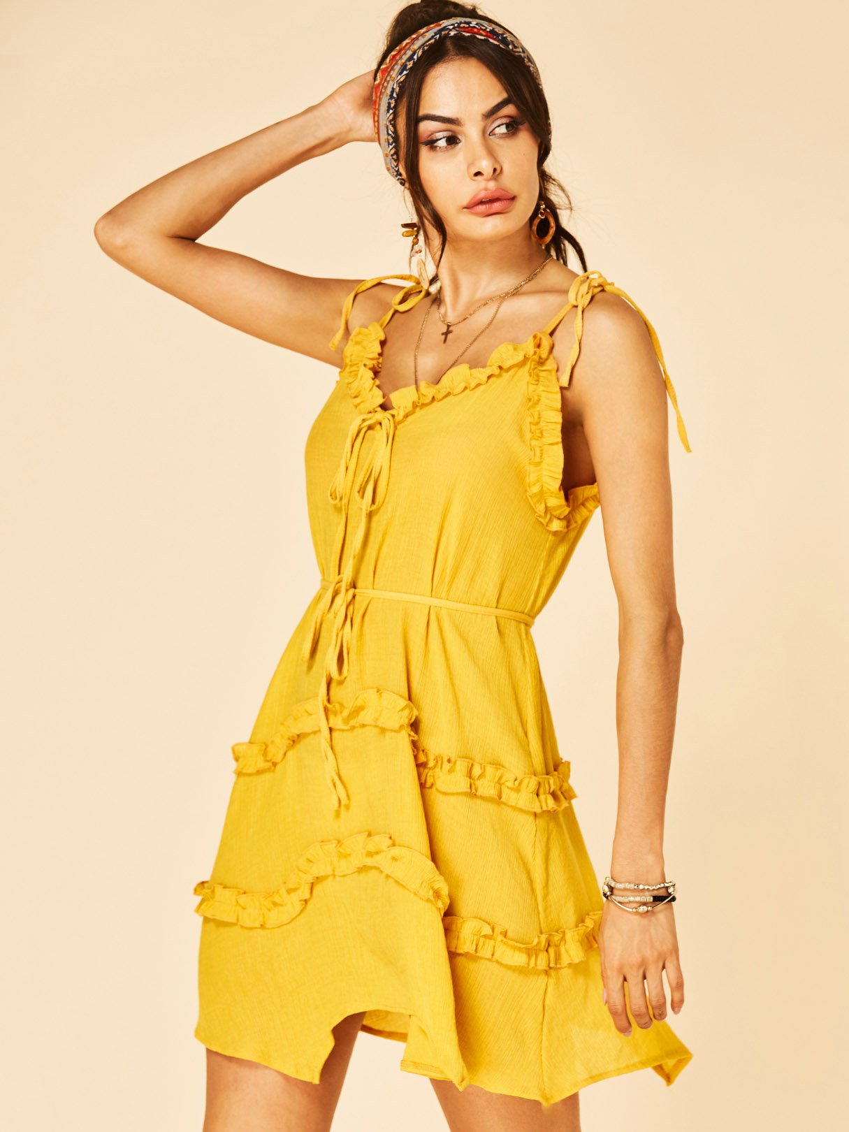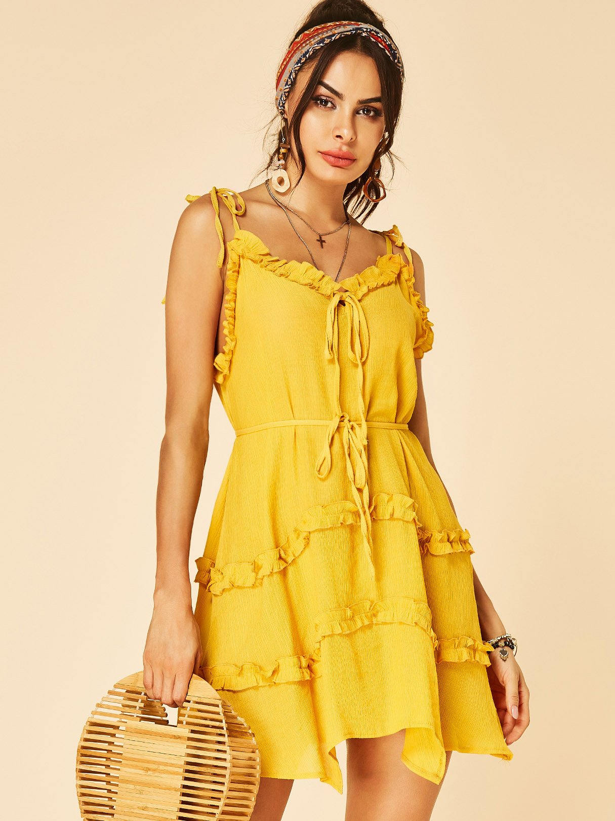 Yellow V-Neck Sleeveless Plain Spaghetti Strap Self-Tie Irregular Hem Dresses